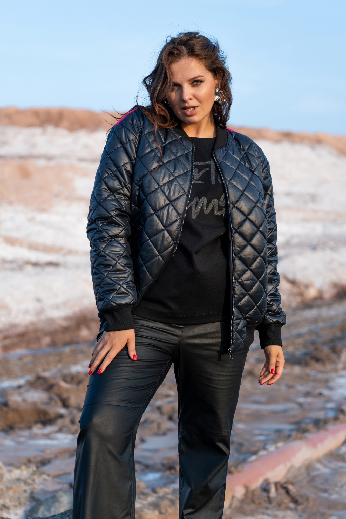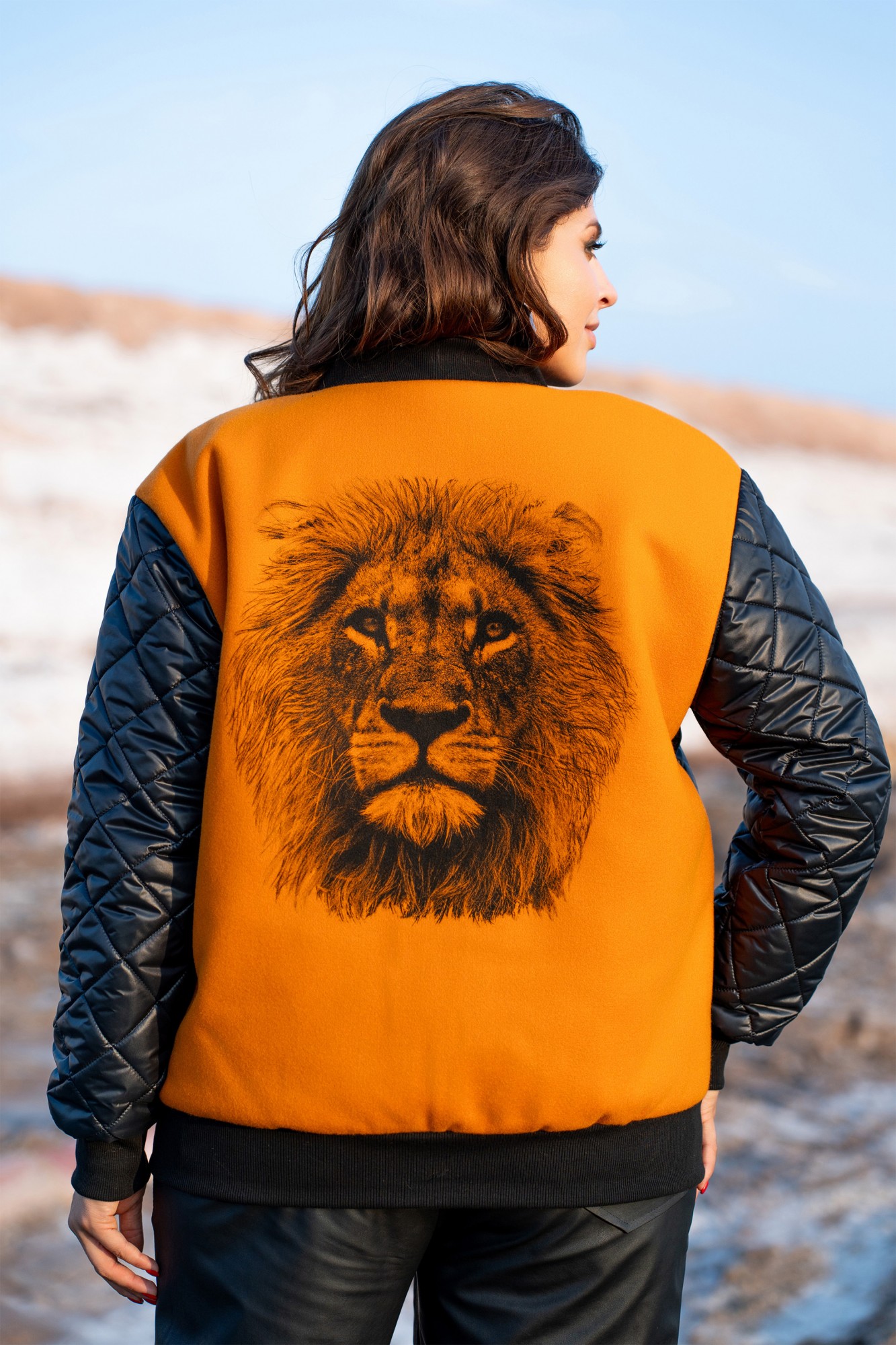 Куртка-бомбер женская модная и современная, из ромбовидной стёганной плащевки, спинка из пальтовой ткани на синтепоне с печатью "лев" с застёжкой на металлическую тесьму-молнию, с боковыми карманами на металлические молнии, на синтепоне 120 ГР, на подкладке. стойка манжеты и низ куртки выполнены из плотного довяза.