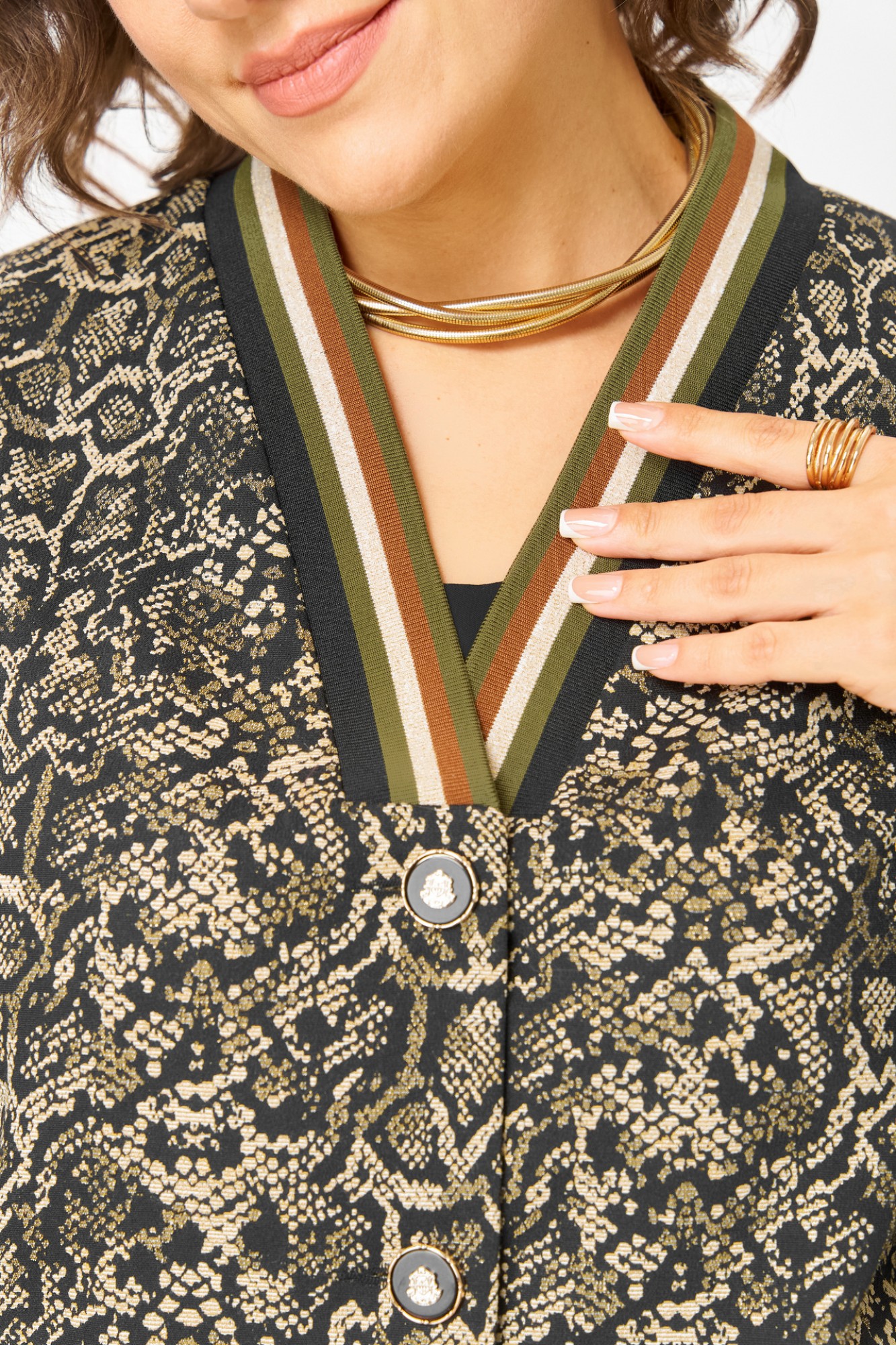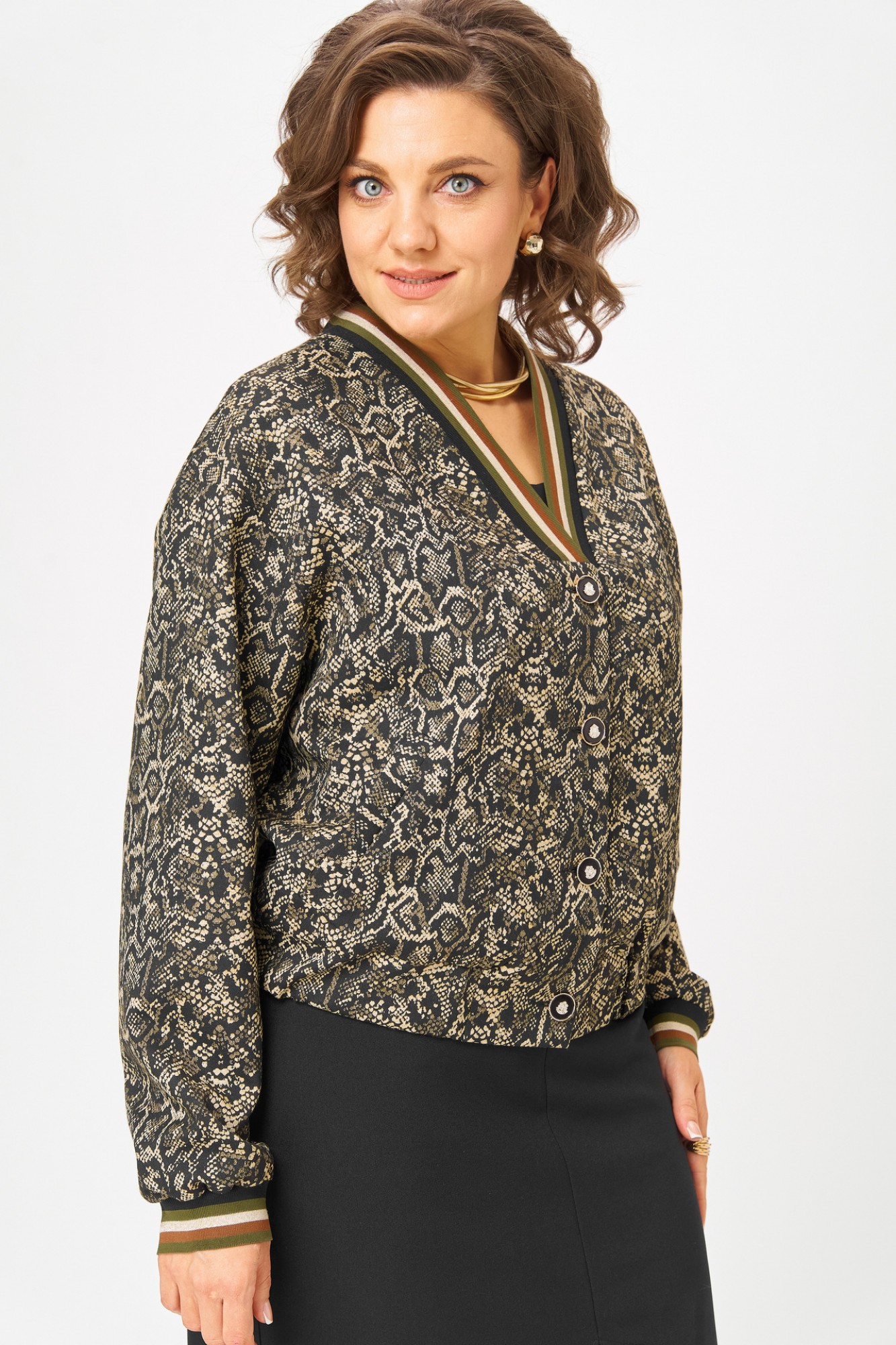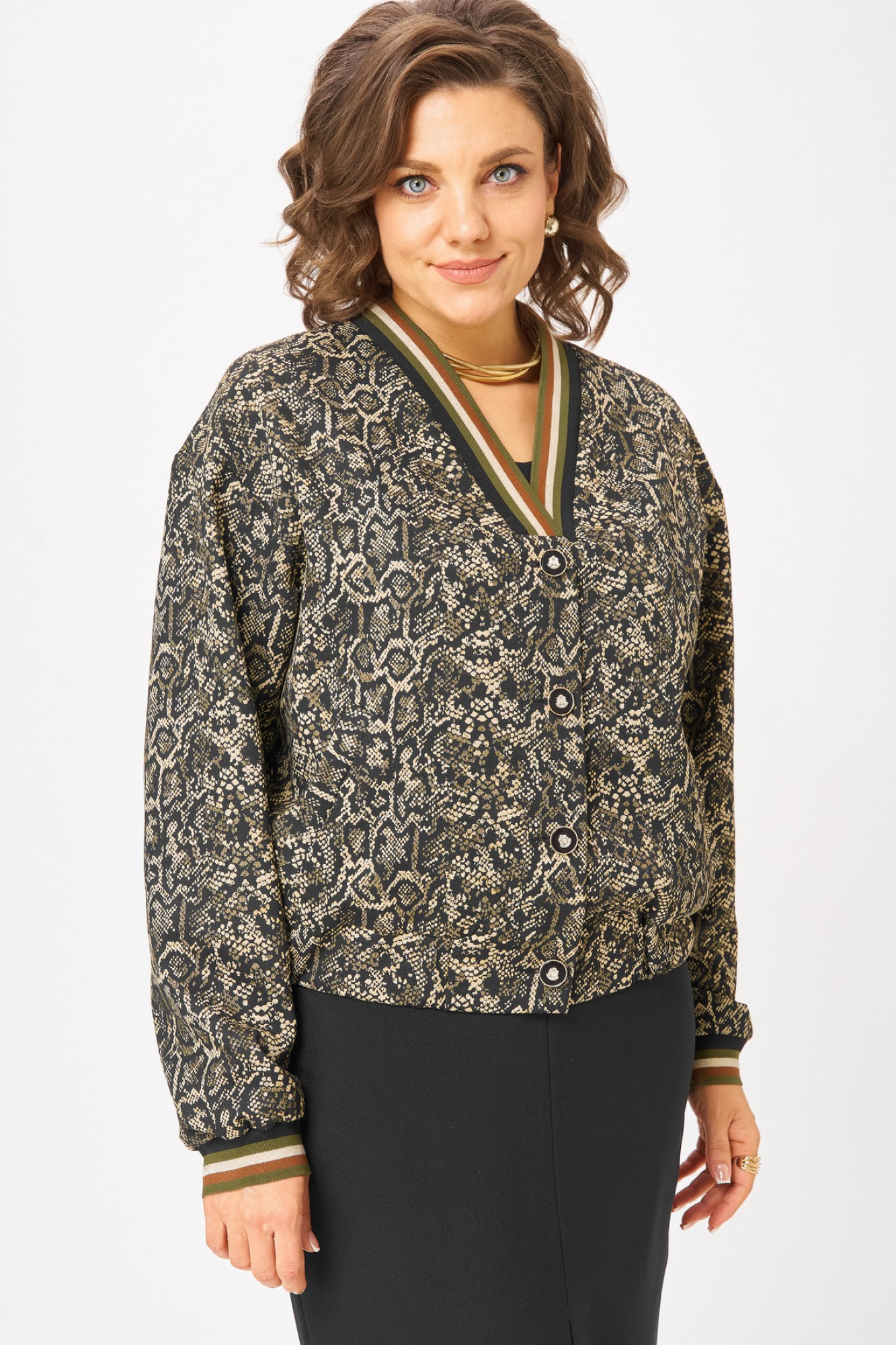 Жакет-бомбер из текстильной ткани, свободный, со спущенной линией плеча, с центральной застежкой на петли-пуговиы, на подкладке. Горловина V-образная, переходящая в стойку. Детали переда с прорезными карманами с листочкой. Спинкацельная. Рукав втачной, одношовный. По низу жакета планка с резинкой.