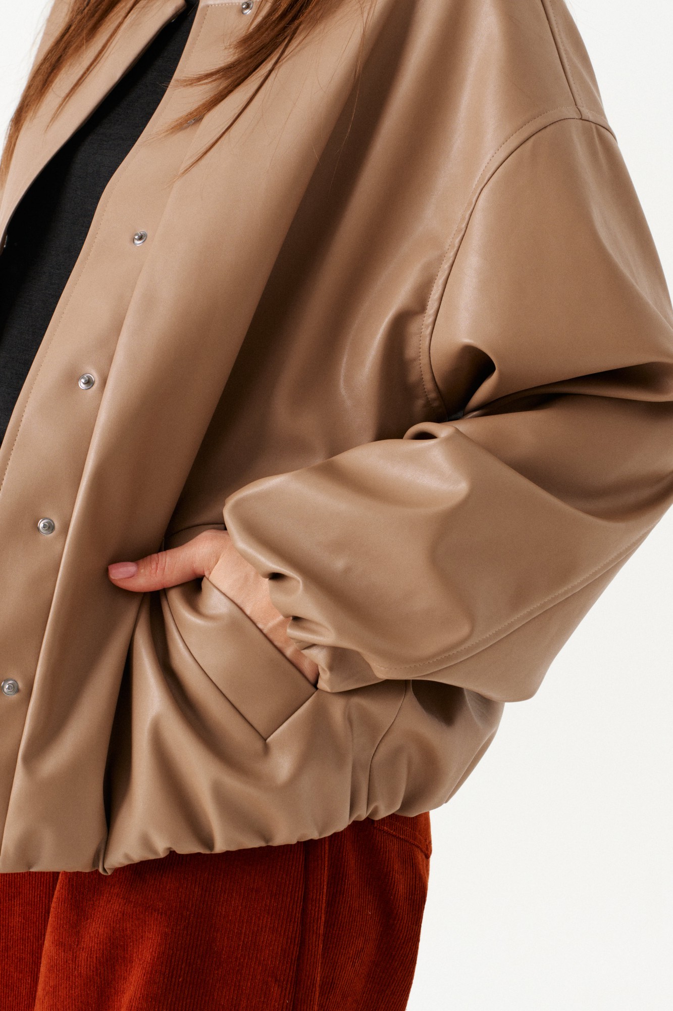 Бомбер из искусственной кожи, свободный, со спущенной линией плеча, с центральной застежкой на потайные кнопки, на подкладке. Горловина округлой формы с воротником-стойкой. Детали переда с прорезными карманами с листочкой. Спинка со средним швом. Рукав втачной, двухшовный.