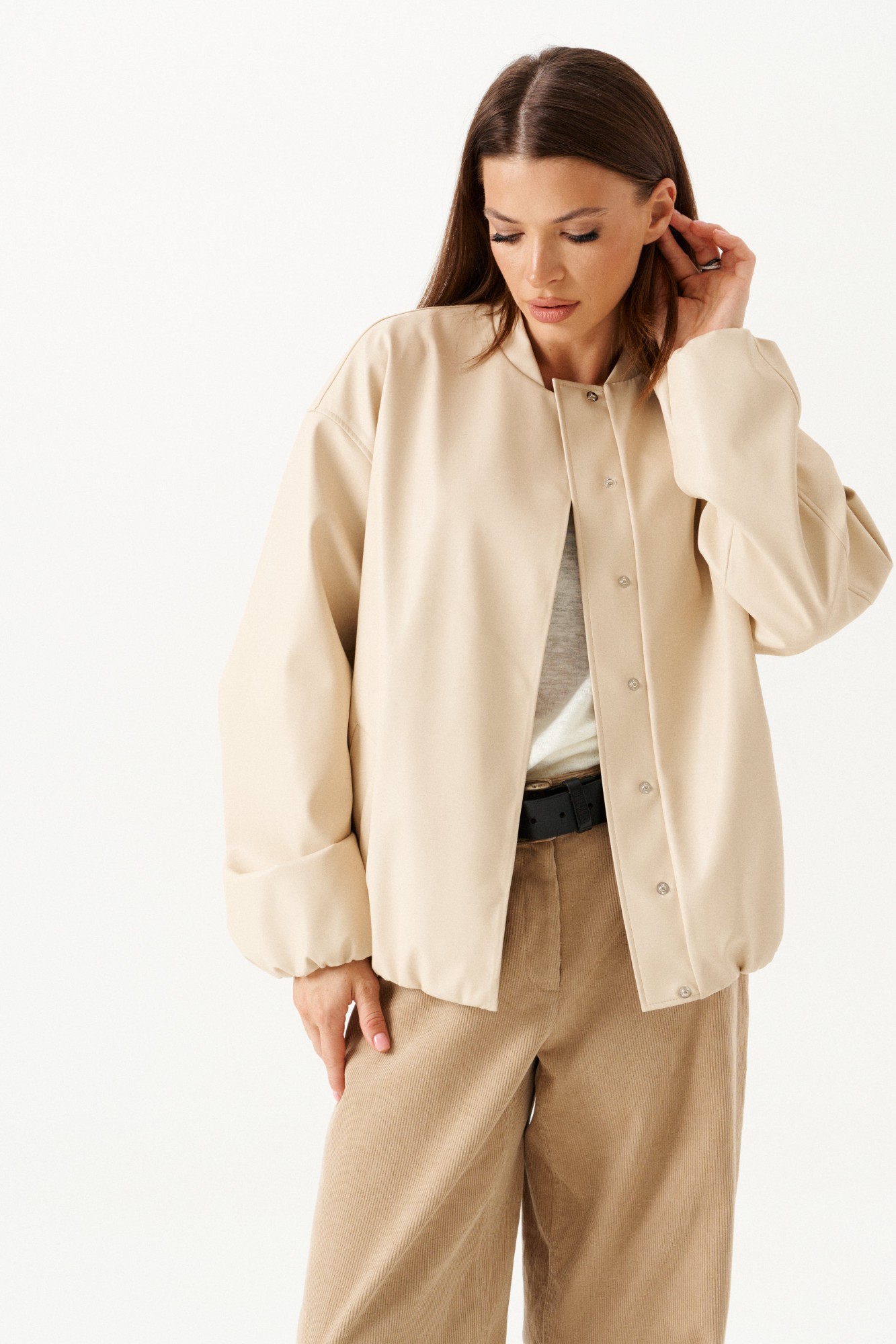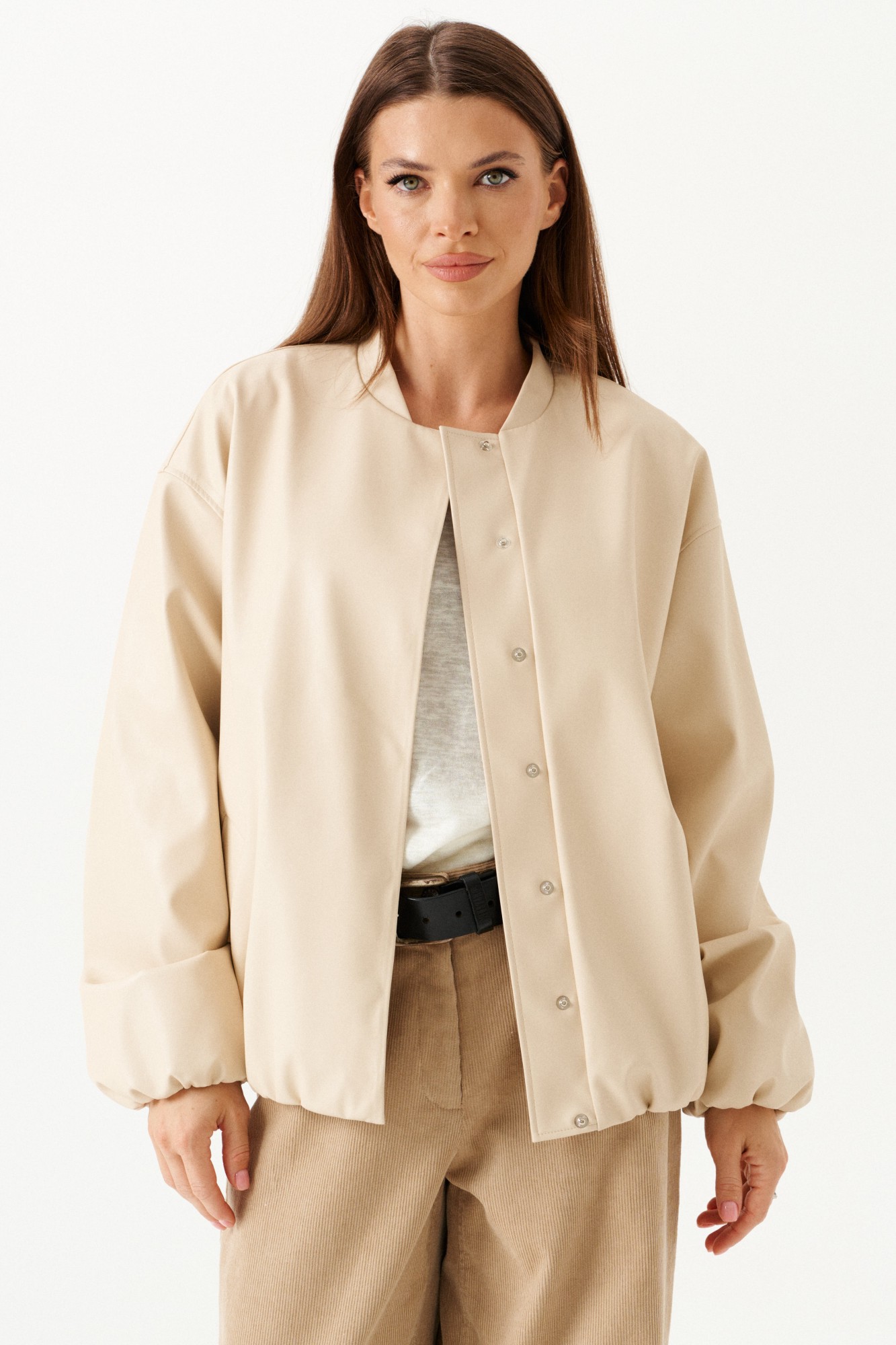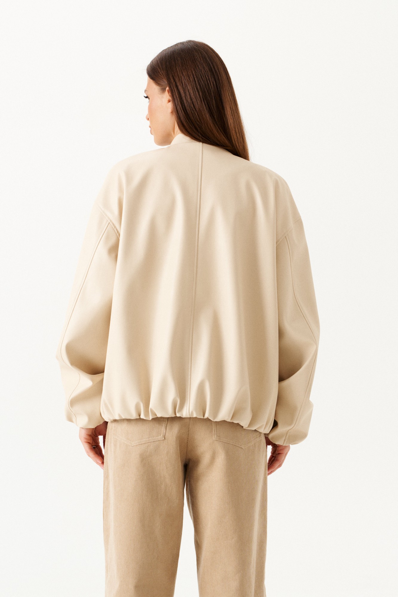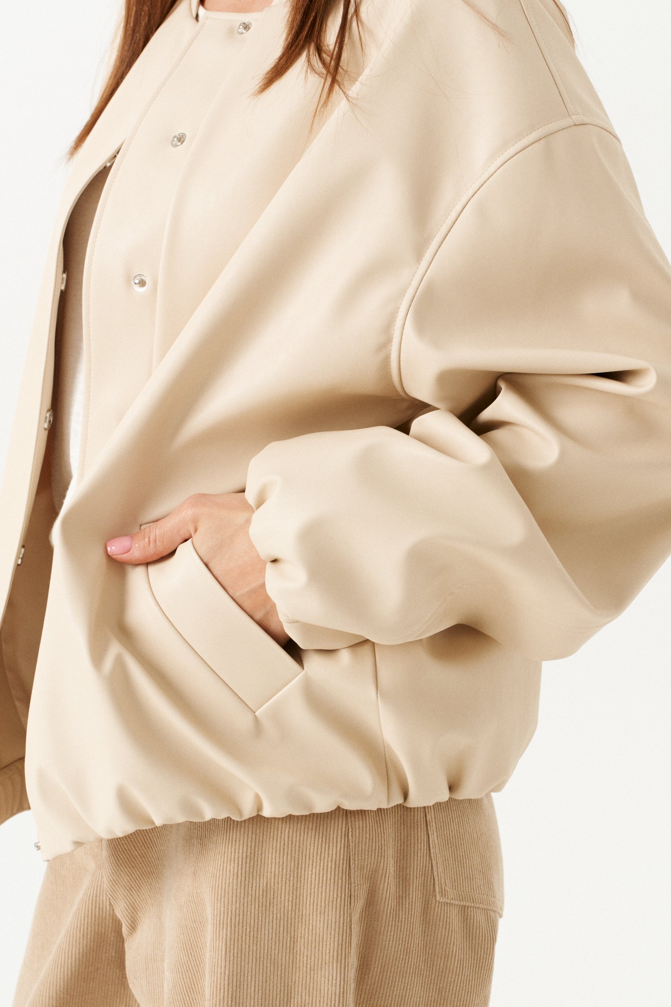 Бомбер из искусственной кожи, свободный, со спущенной линией плеча, с центральной застежкой на потайные кнопки, на подкладке. Горловина округлой формы с воротником-стойкой. Детали переда с прорезными карманами с листочкой. Спинка со средним швом. Рукав втачной, двухшовный.