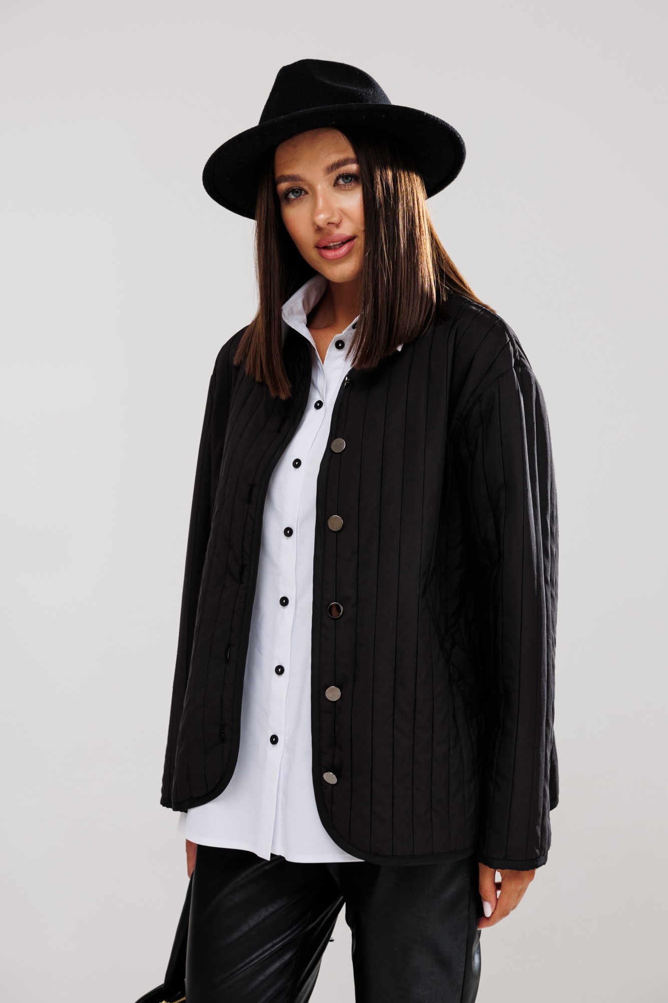 Жакет на подкладке из актуального стеганого полотна, прямого свободного силуэта с прибавками умеренного направления oversize. Линия плеча чуть спущена. Рукав втачной, двухшовный. Длина рукава 60-62 см. На полочке расположены прорезные косые карманы с листочкой. Горловина округлая, а также низ бортов с закругленным краем. Застежка фронтальная вертикальная на петли/пуговицы. На спинке жакета настрочена в качестве декоративного элемента нашивка, в тон изделия. Длина жакета по спинке 66-69 см в зависимости от размерного ряда. Представленная фурнитура может отличаться от представленной на фото/видео материале. Особые рекомендации: рекомендуется холодная деликатная ручная стирка, без использования отбеливающих СМС, без интенсивного трения. Сушка в вертикальном положении. ВТО с минимальным паром.