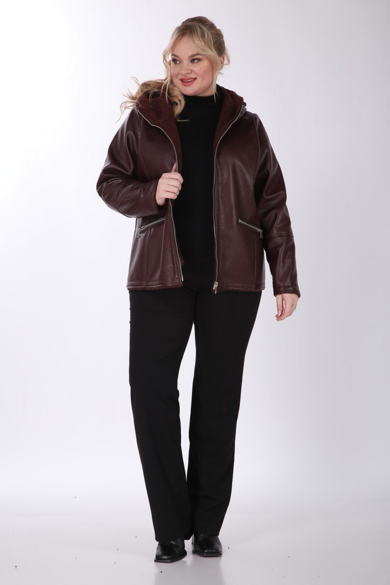 Изделие выполнено из высококачественной мягкой экокожи, которая не трескается и не растягивается, в отличие от натуральной кожи. Все молнии на изделии металлические. Куртка без подкладки и утеплителя.