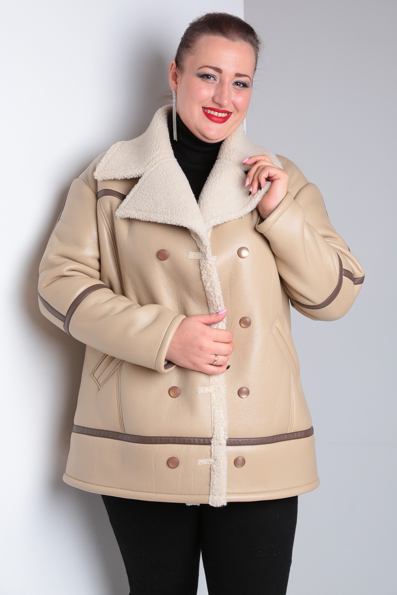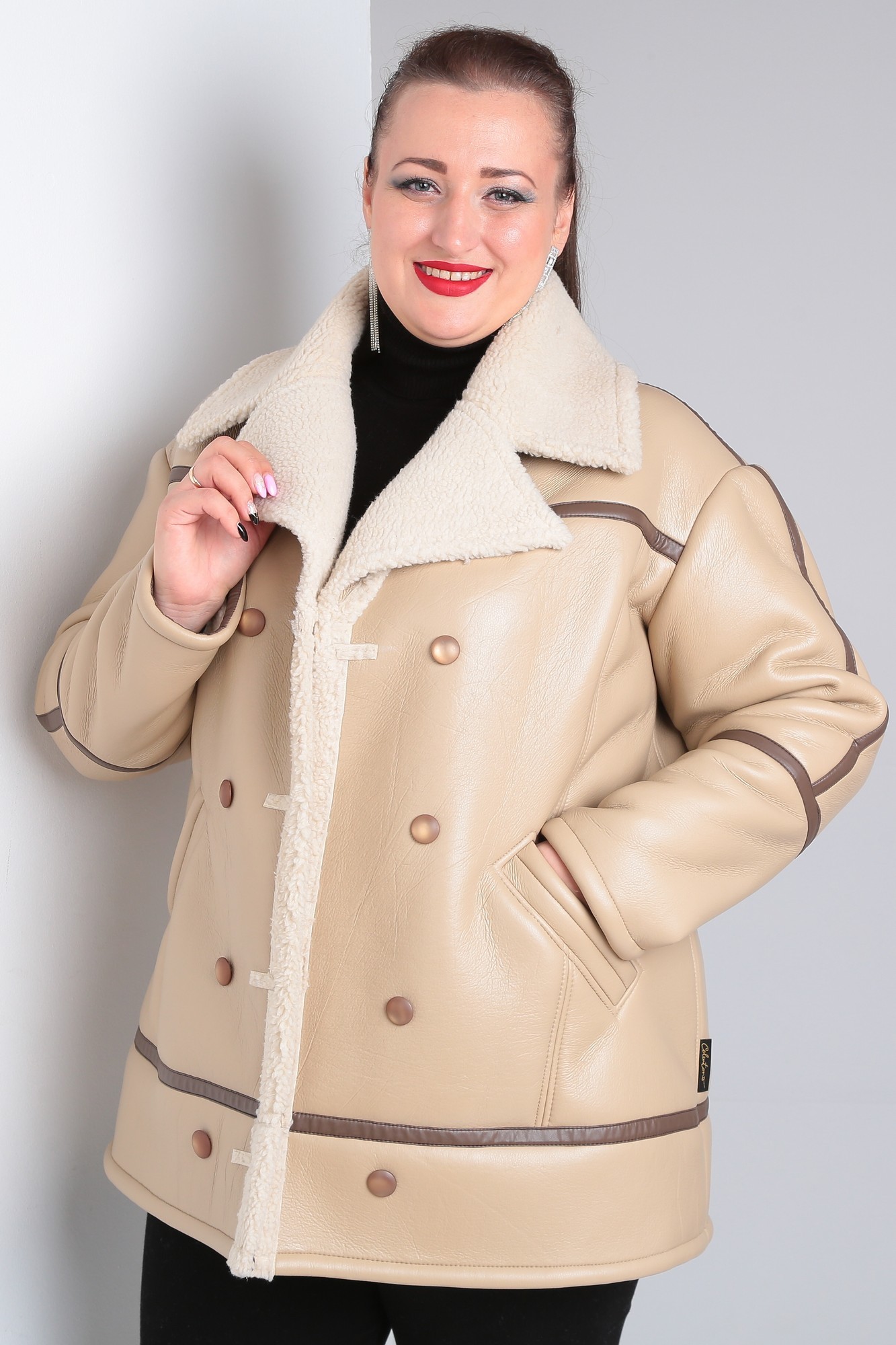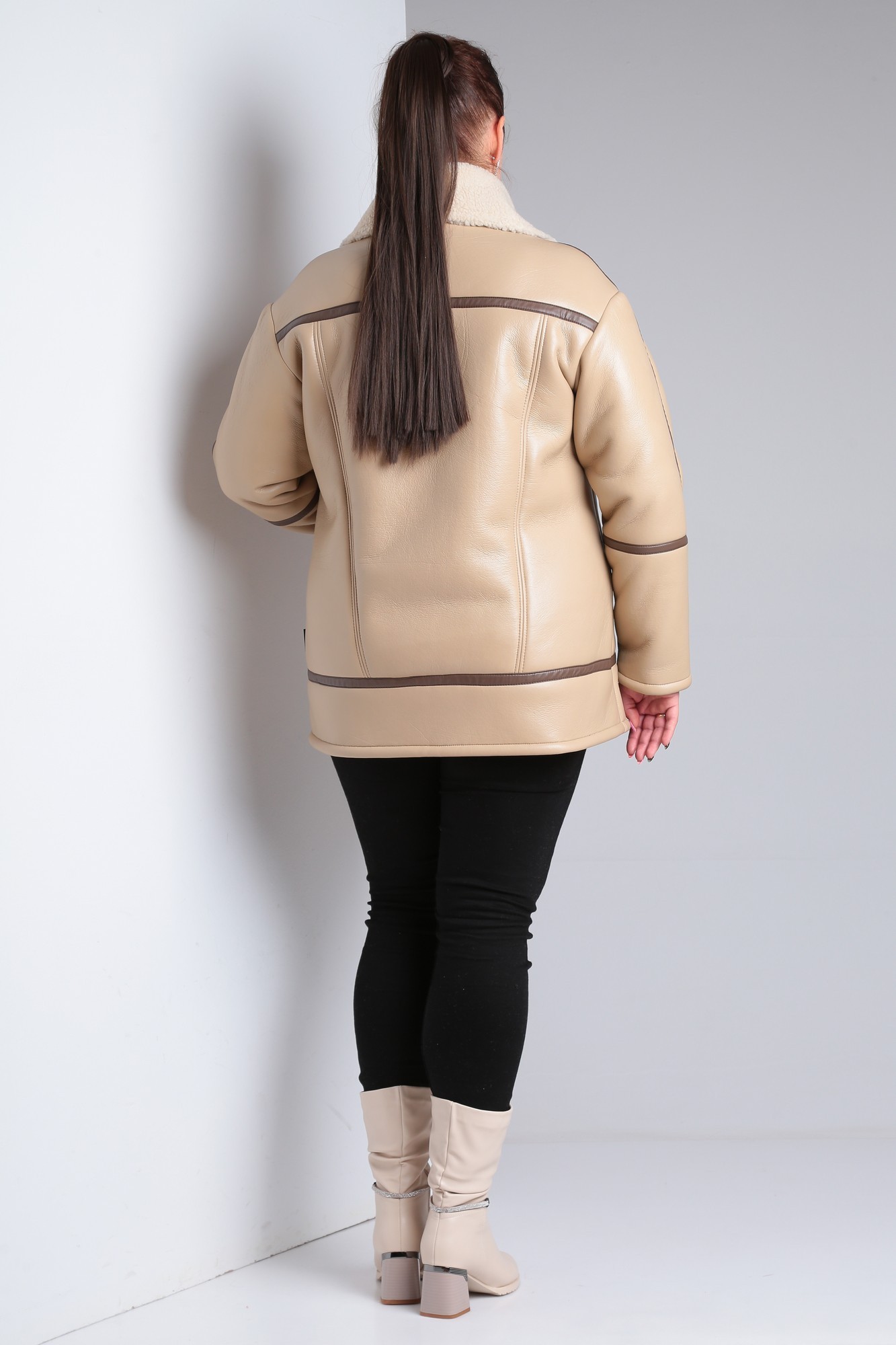 Воротник втачной пиджачного типа. Застежка двубортная на петли и пуговицы. Полочка с рельефами, на полочке расположены прорезные карманы с листочкой. Спинка разрезная с кокеткой. Рукав одношовный с подрезами, плечо спущено. Швы, внутренняя часть листочки кармна, снизу внутренняя часть рукавов и изделия фрагментарно обработаны отделочной планкой контрастного цвета из экокожи. В модели есть прибавка на верхнюю одежду.