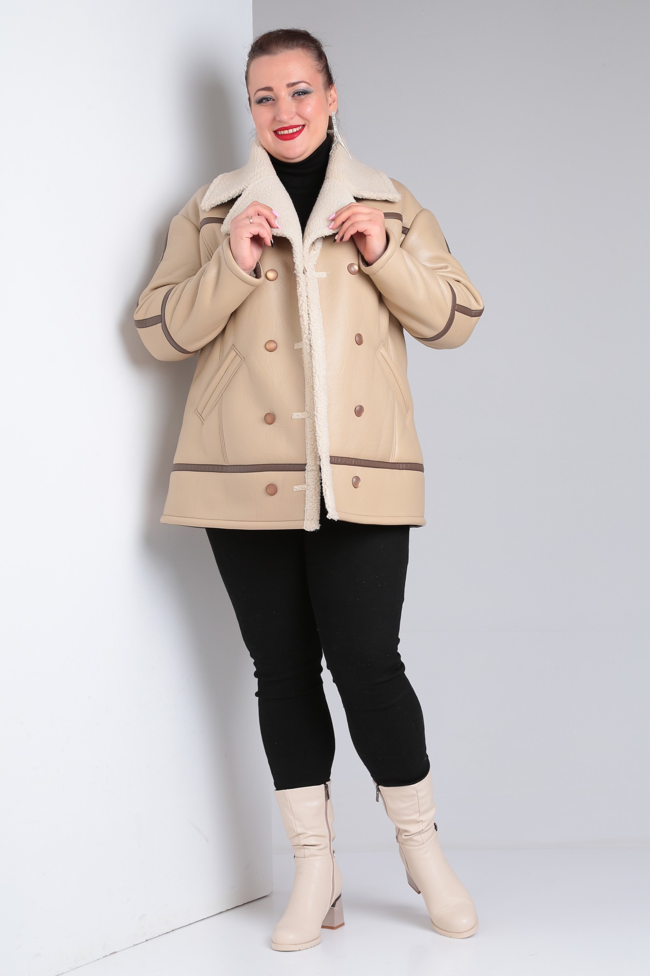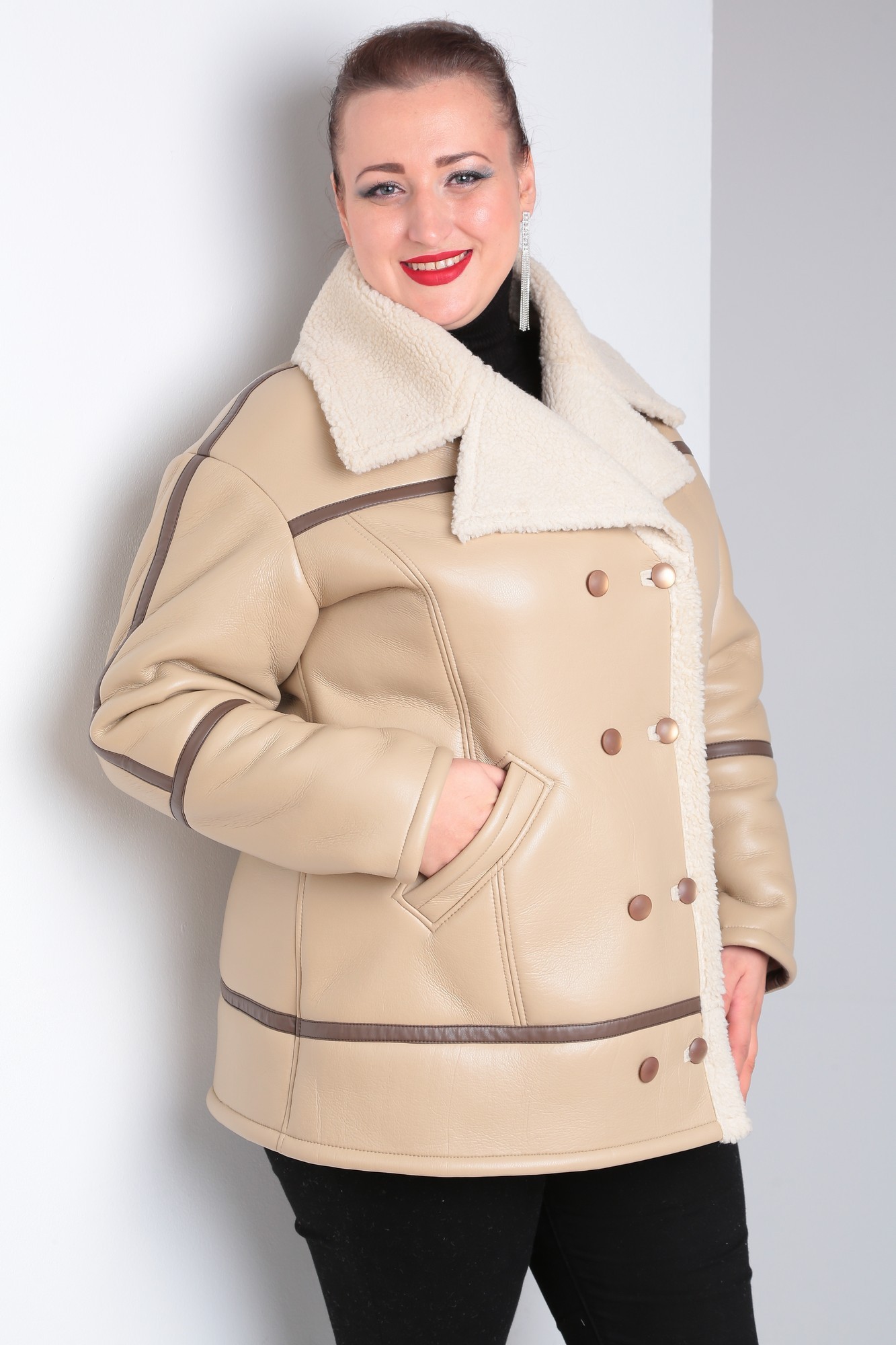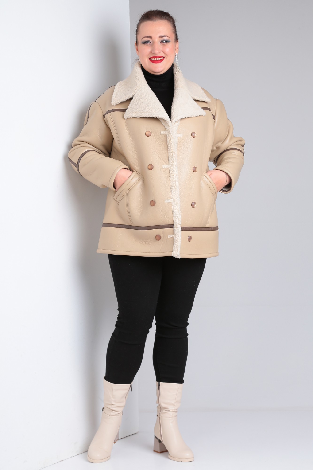 Воротник втачной пиджачного типа. Застежка двубортная на петли и пуговицы. Полочка с рельефами, на полочке расположены прорезные карманы с листочкой. Спинка разрезная с кокеткой. Рукав одношовный с подрезами, плечо спущено. Швы, внутренняя часть листочки кармна, снизу внутренняя часть рукавов и изделия фрагментарно обработаны отделочной планкой контрастного цвета из экокожи. В модели есть прибавка на верхнюю одежду.
