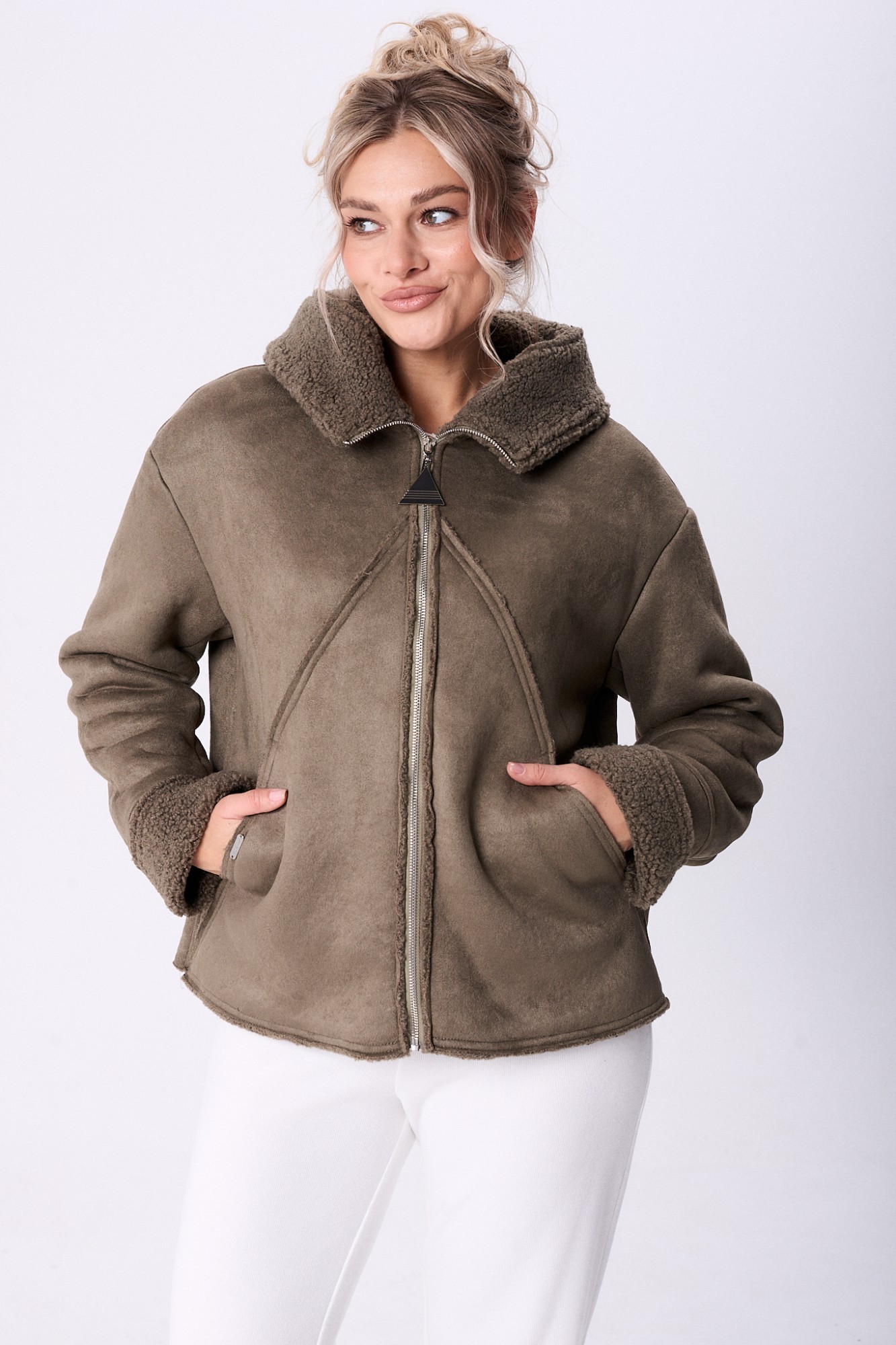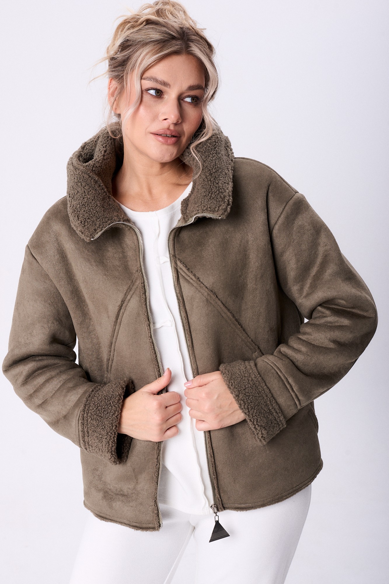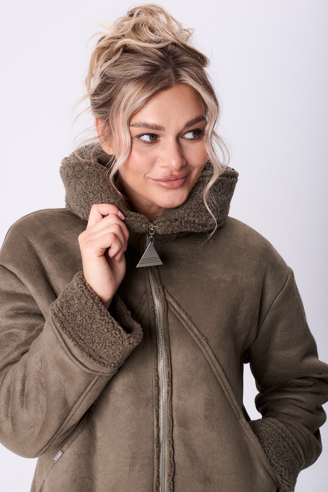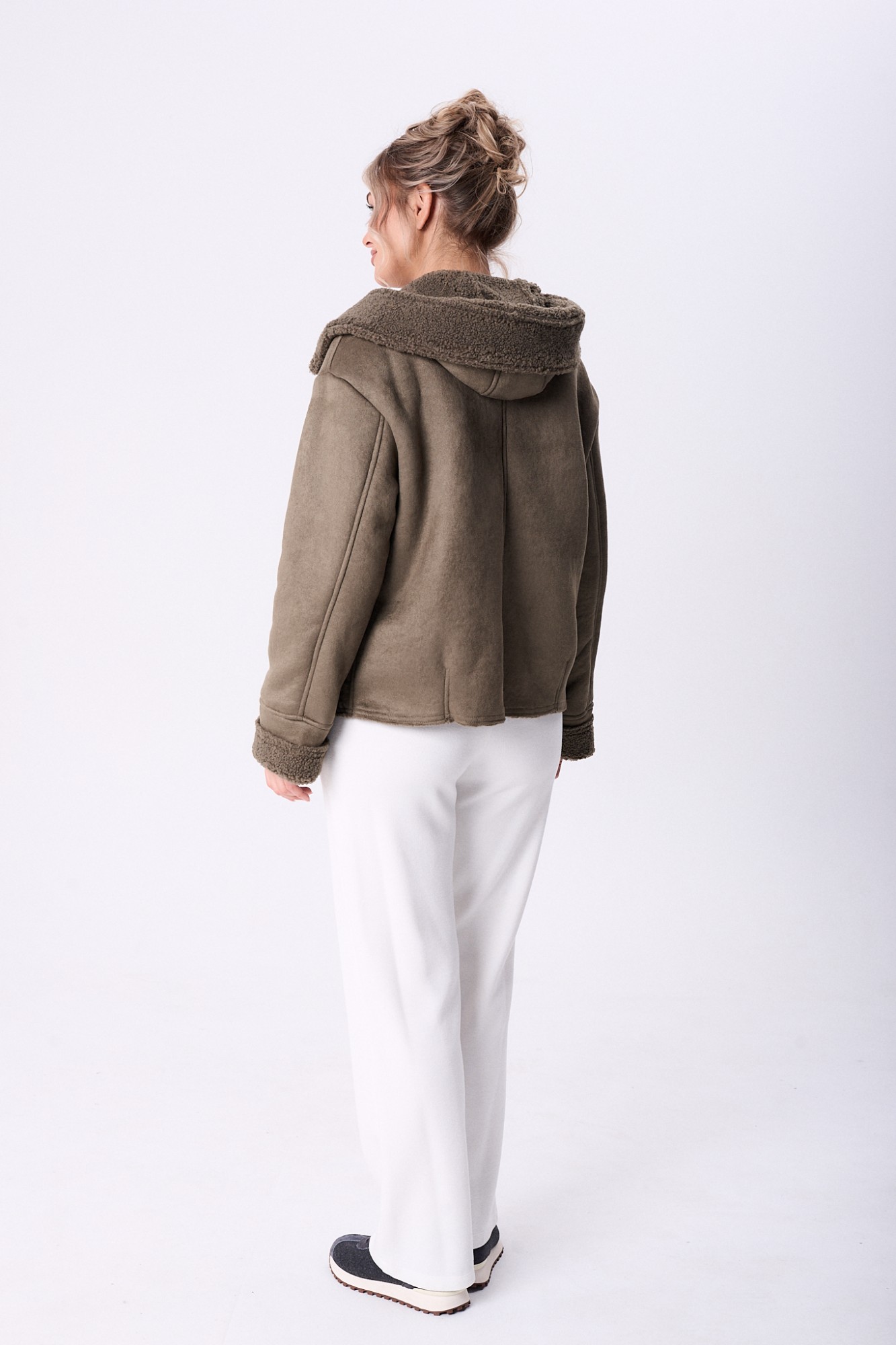 Дубленка женская полуприлегающего силуэта с центральной застежкой на тесьму-молнию. По спинке средний шов, вытачки по горловине. По переду накладные карманы фигурной формы. Рукав втачной 2-шовный с притачным манжетам, спущенная линия плеча. Капюшон с центральной частью и откидной отделочной деталью по отлету. В качестве отделки используется фурнитура.