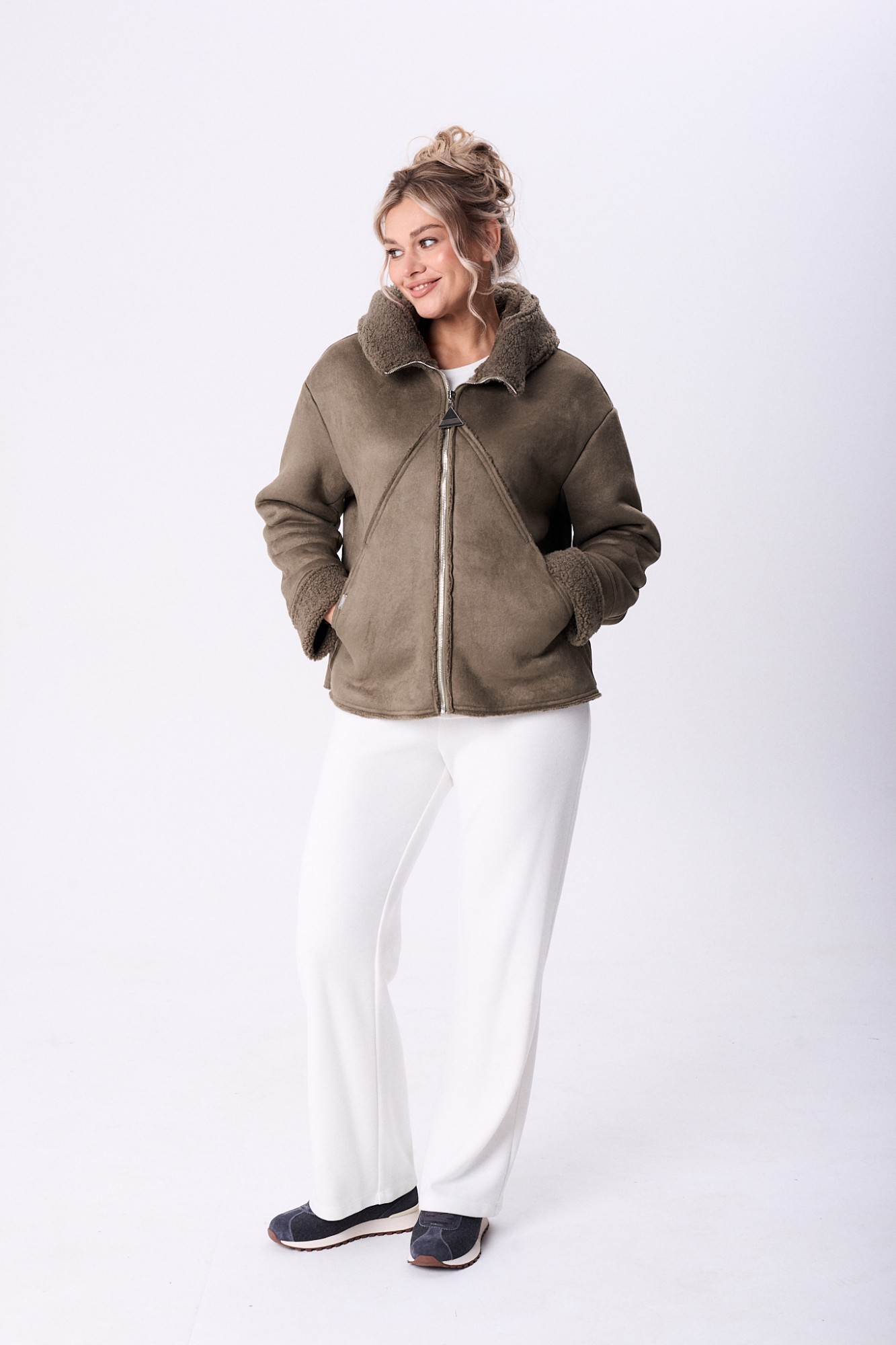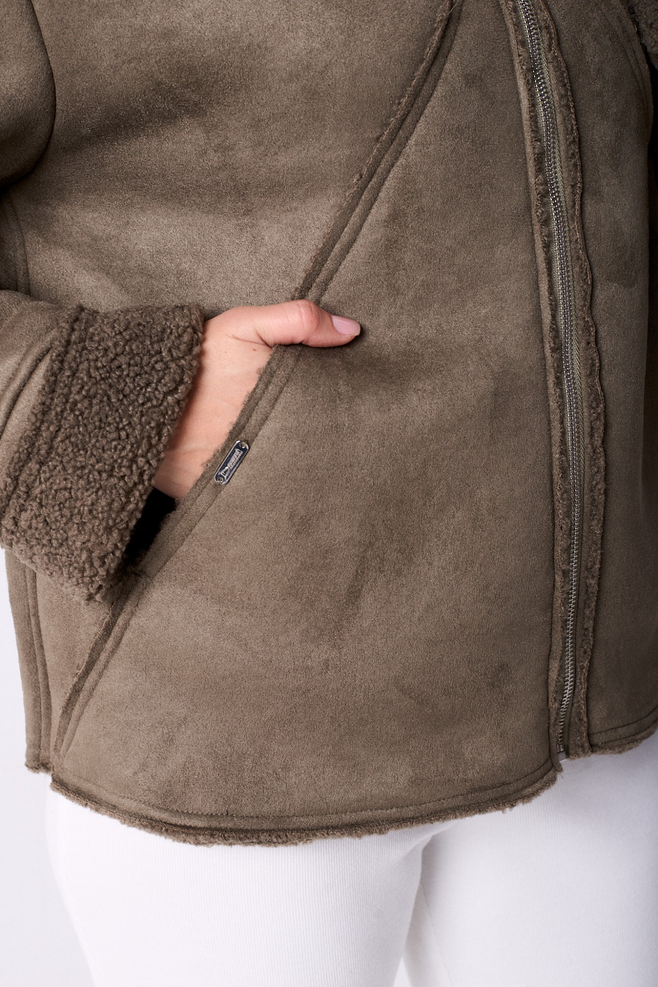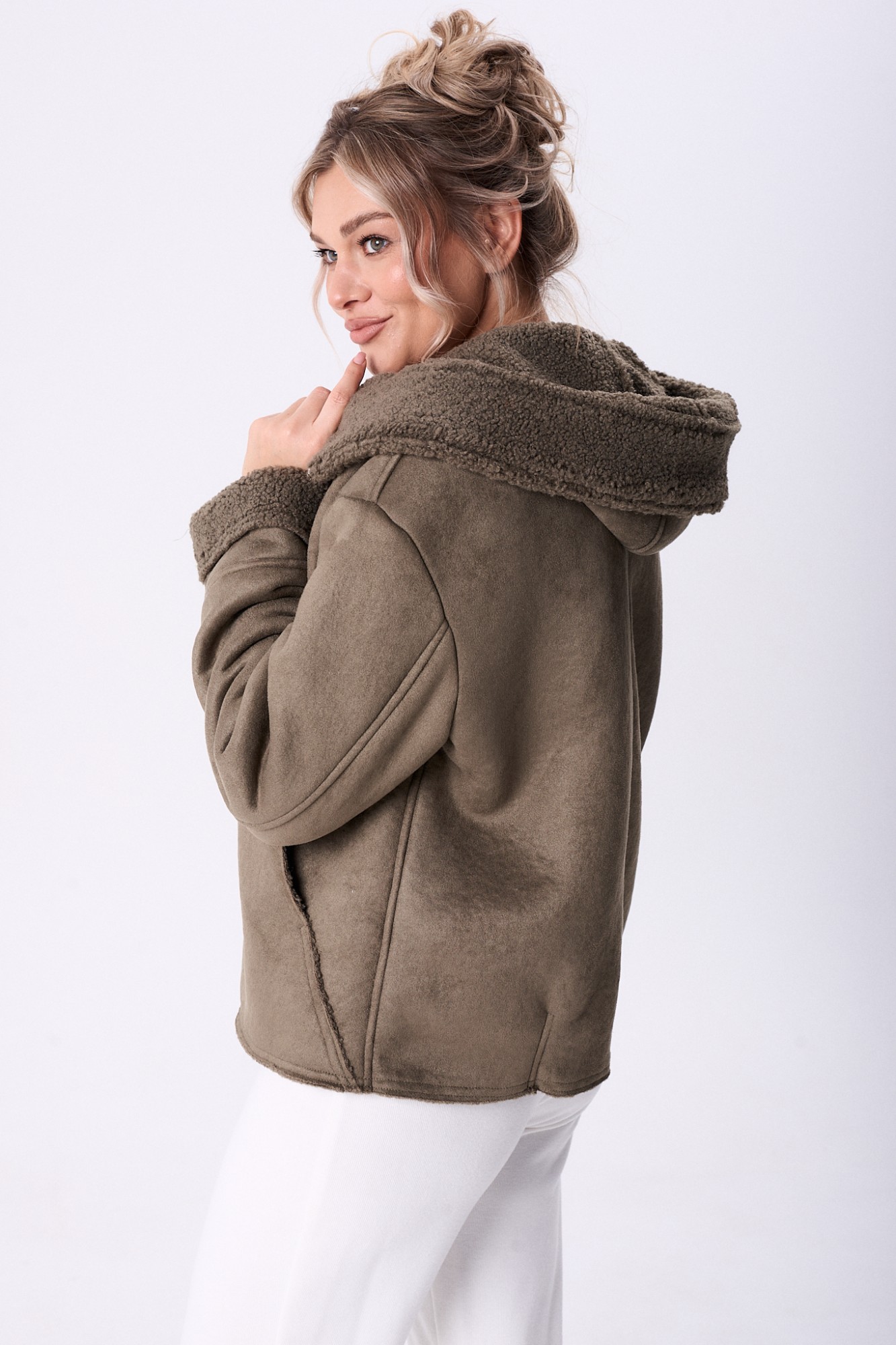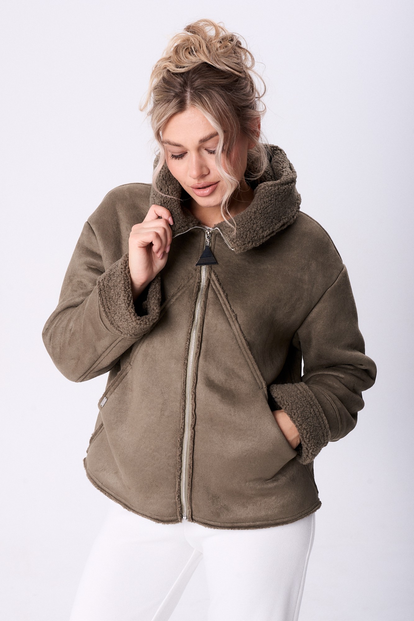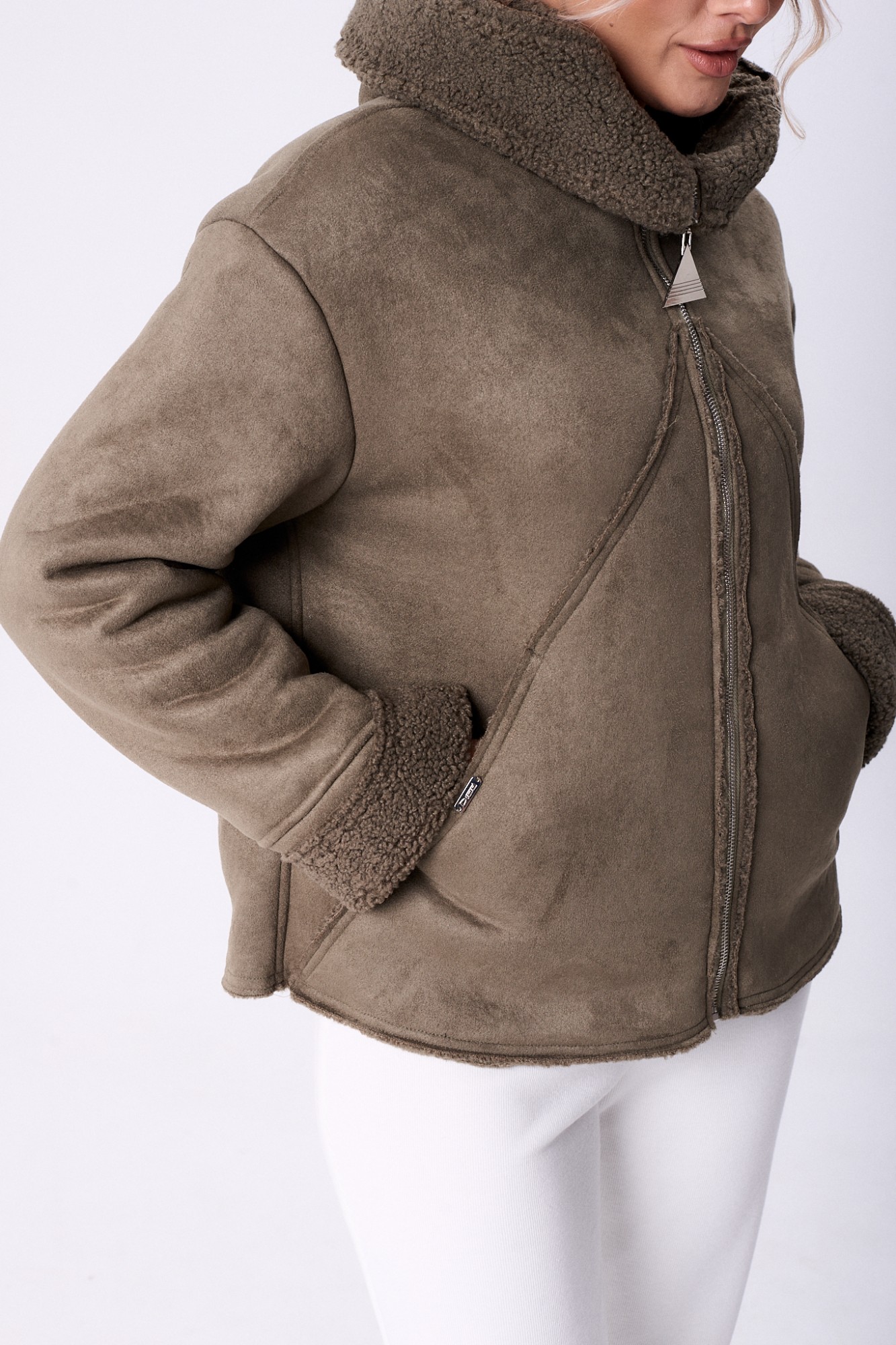 Дубленка женская полуприлегающего силуэта с центральной застежкой на тесьму-молнию. По спинке средний шов, вытачки по горловине. По переду накладные карманы фигурной формы. Рукав втачной 2-шовный с притачным манжетам, спущенная линия плеча. Капюшон с центральной частью и откидной отделочной деталью по отлету. В качестве отделки используется фурнитура.