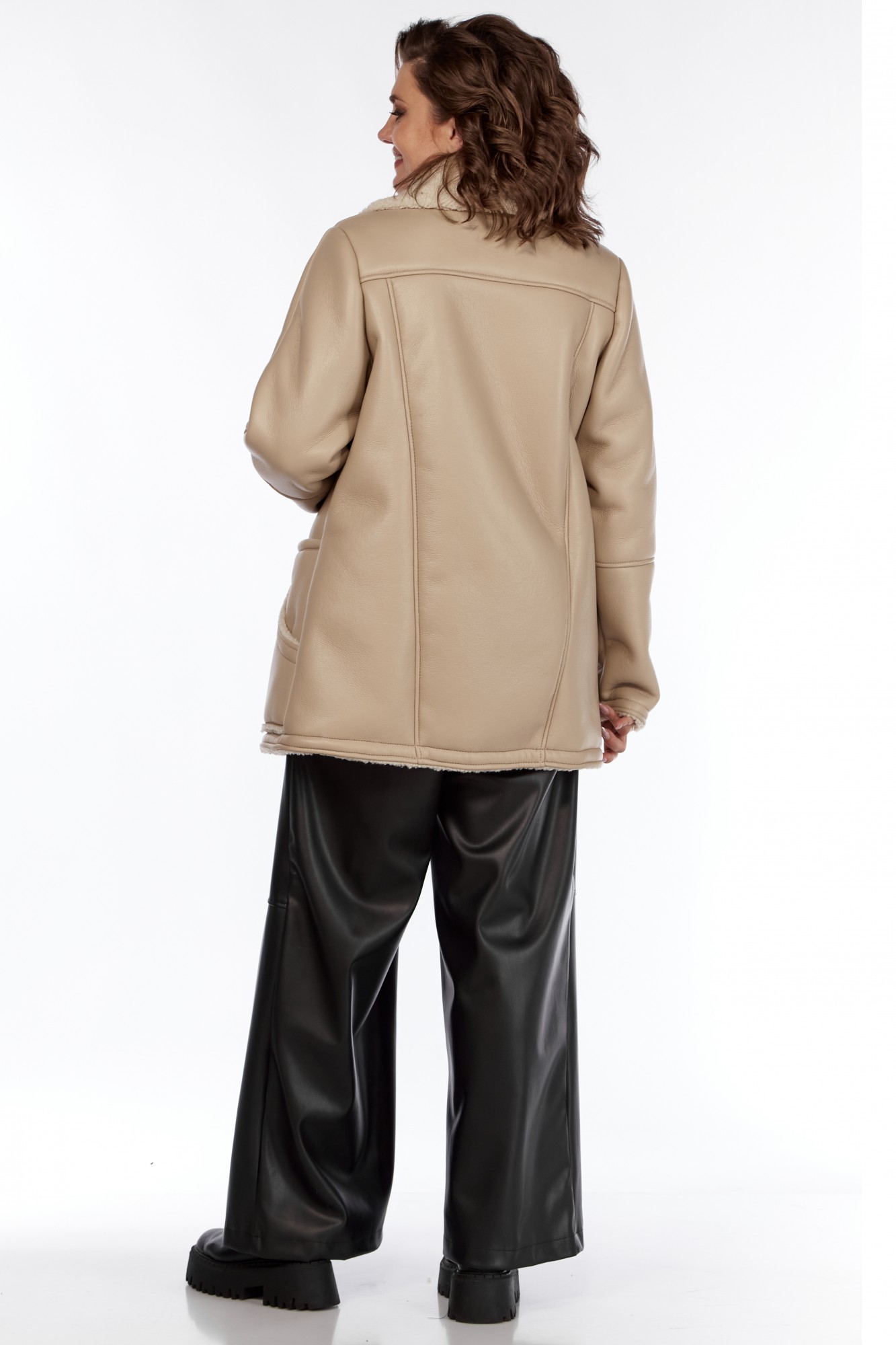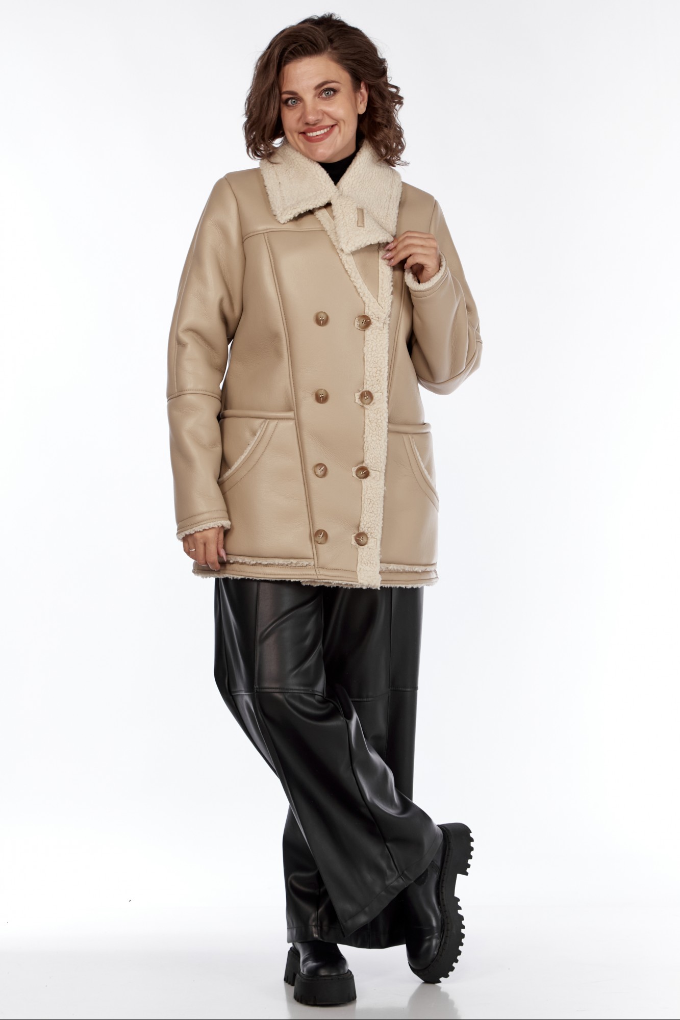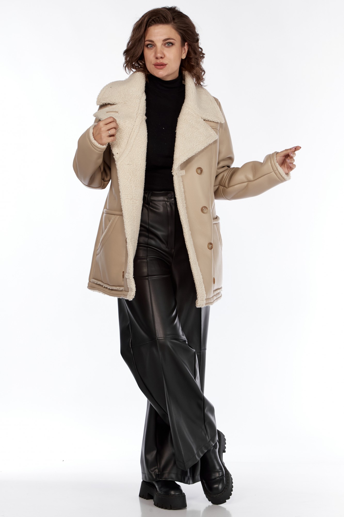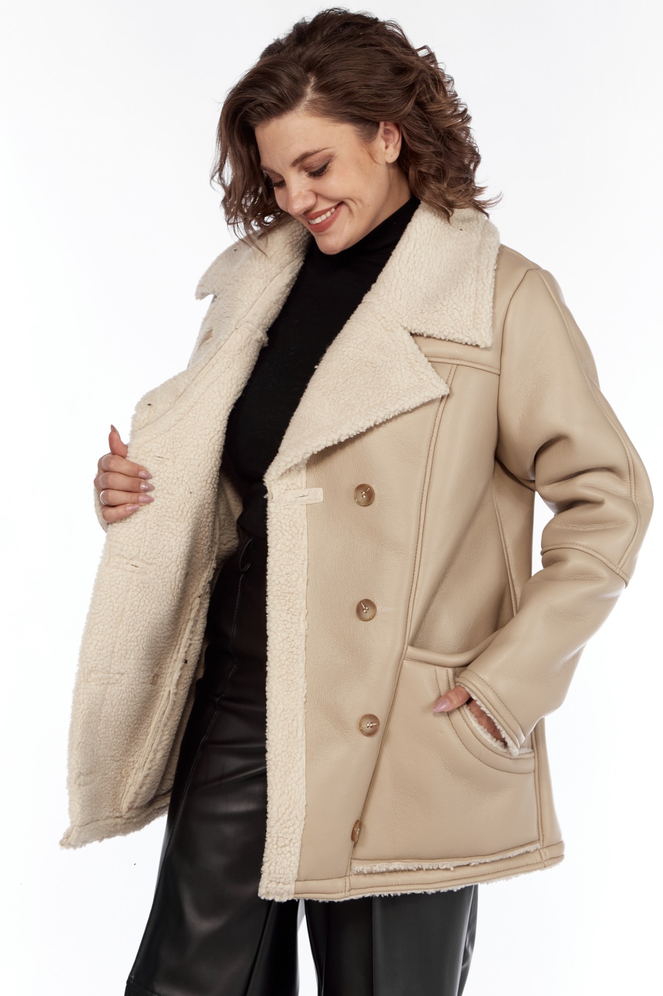 Дубленка женская от Celentano. Выполнена из экокожи с меховой изнанкой. Полочка и спинка разрезные. На полочке рельефы и 4 функциональных кармана. Дубленка двубортная с застежкой на петли и пуговицы. Пальто с отложным воротником, пиджачного типа. Рукав втачной одношовный с подрезами. В модели есть прибавка на верхнюю одежду. Изделие выполнено из мягкой и легкой экокожи. Пальто без подкладки и утеплителя, изнанка - экомех. По температурному режиму подходит для еврозимы (до -5), осени и весны (демисезон). Примечание: Перед первой примеркой рекомендуется пройти изнанку (мех) изделия липким роликом для чистки одежды. Рост модели 170 см., размер 52.