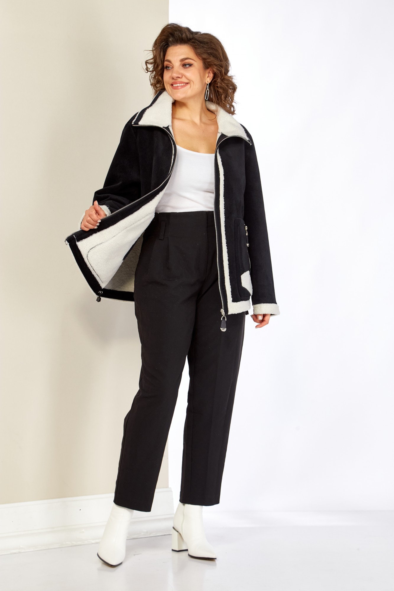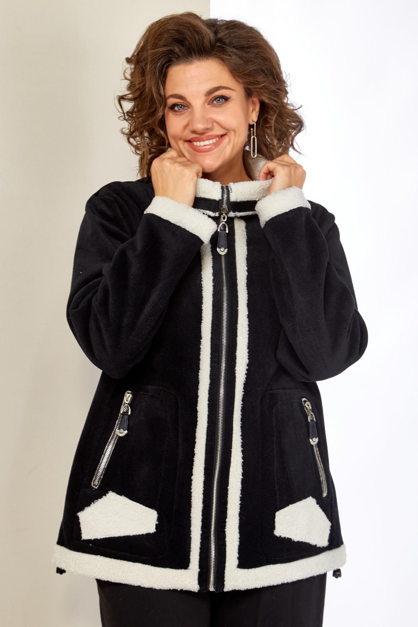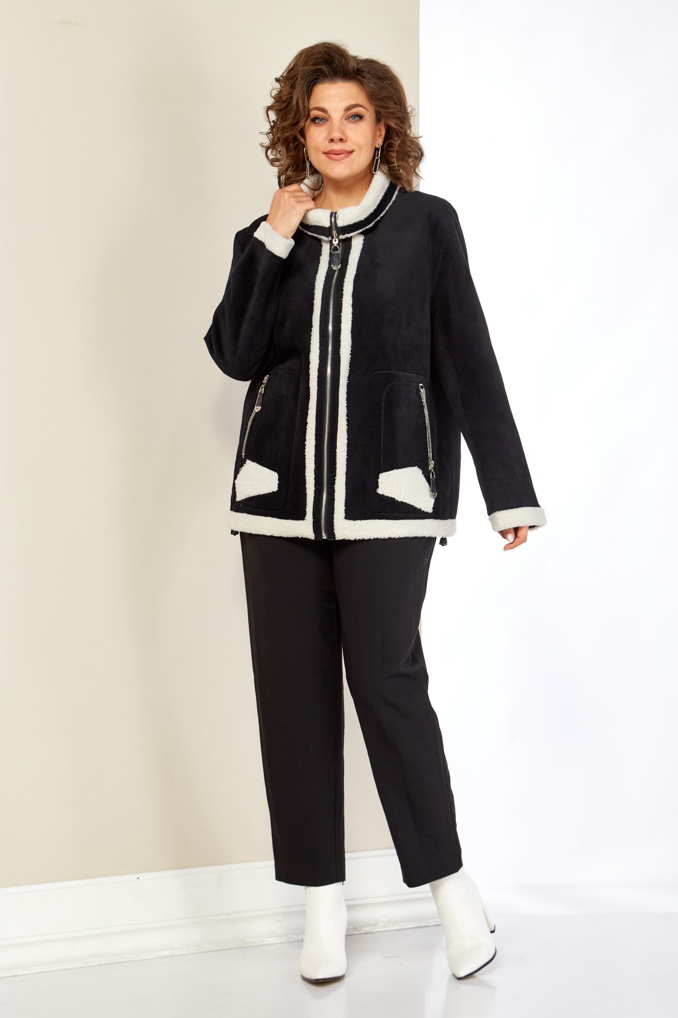 Представляем стильный жакет с воротником-стойкой, классического кроя с декоративными элементами в виде отделки из эко-меха. Жакет выполнен из качественных материалов, включая плотный, мягкий трикотаж в рубчик и эко-мех. Застежка центральная на молнию с двойным бегунком. По переду жакета функциональные накладные, прорезные карманы на молнии с оригинальной кожаной подвеской в тон основной ткани. По низу рукавов и низа изделия отделка с эко-меха, что придает изделию оригинальный вид. Рукав втачной.