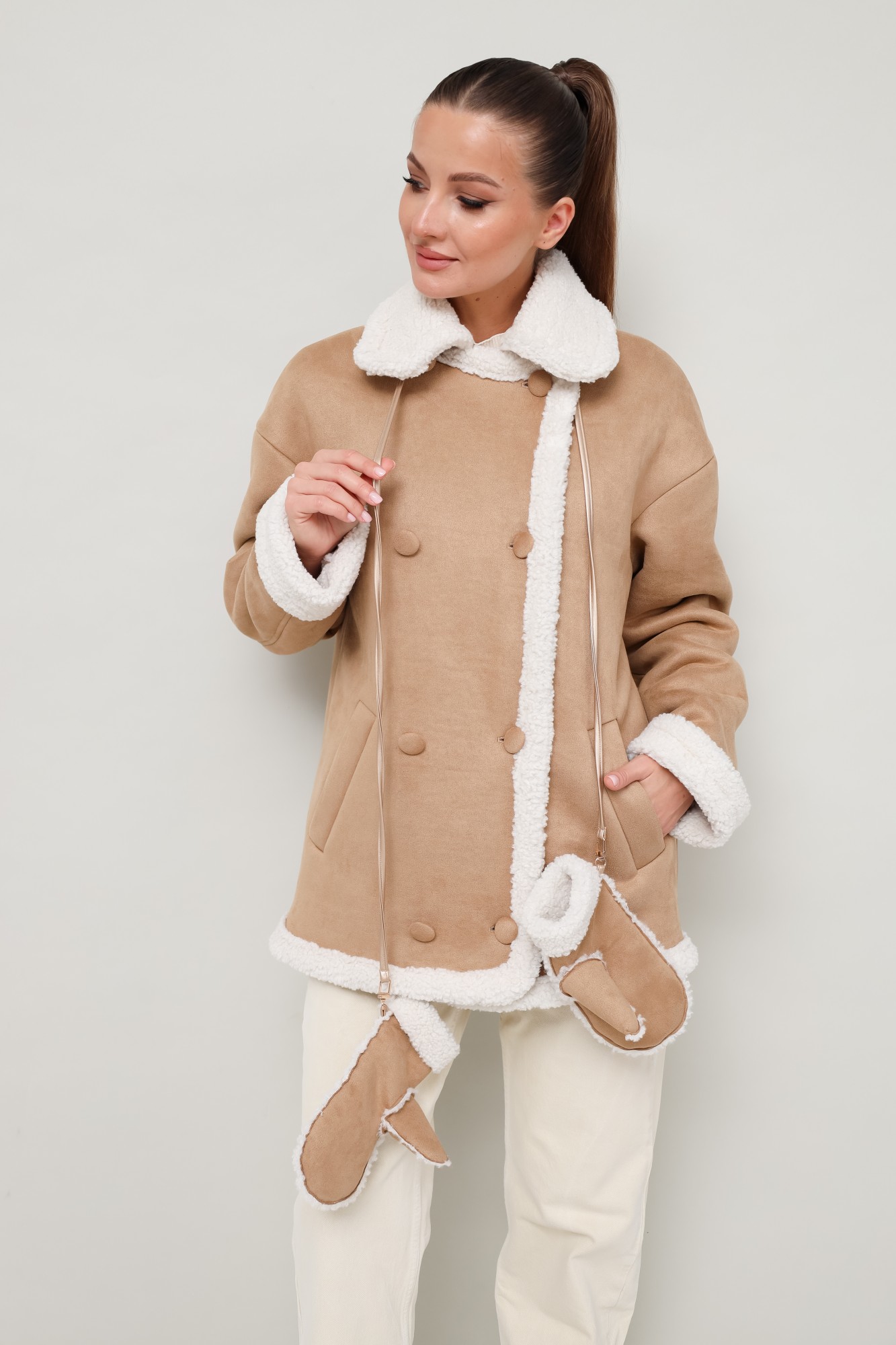 Женская дубленка прямого силуэта, длиной до середины бедра. Воротник и лацканы отложные. Застёжка двубортная на петли и обтяжные пуговицы. Спереди обработаны функциональные карманы с листочкой. Спущенная линия втачивая плеча, длинные двухшовные рукава с отворотом. Спинка с отрезной кокеткой. Дубленка декорирована искусственным мехом, который придает образу благородную мягкость и уют. Рукавицы из искусственного меха с отложными манжетами. Стильный и акцентный аксессуар, который гармонично дополнит образ с дубленкой. В комплекте шнур с креплением на карабин.