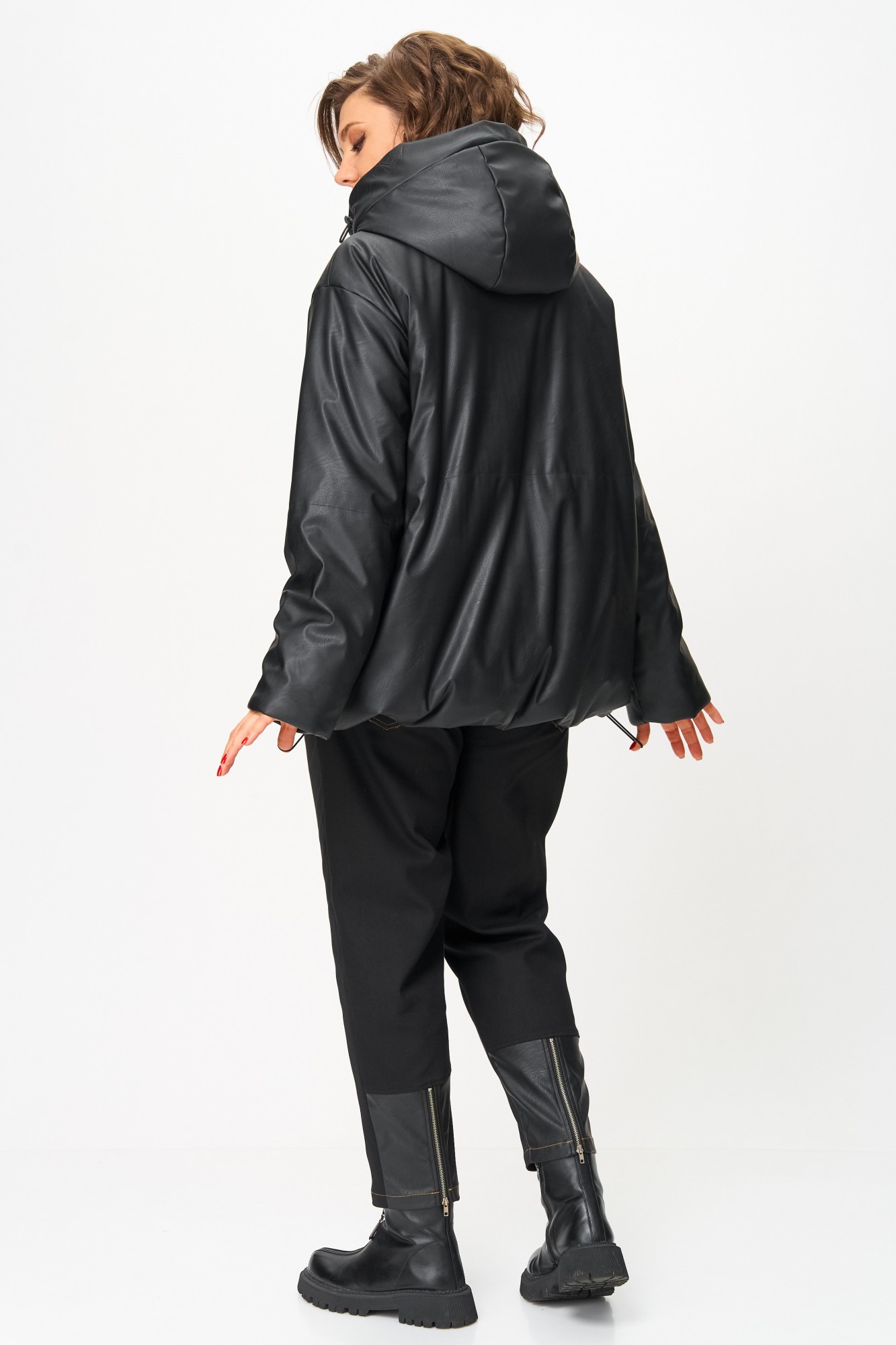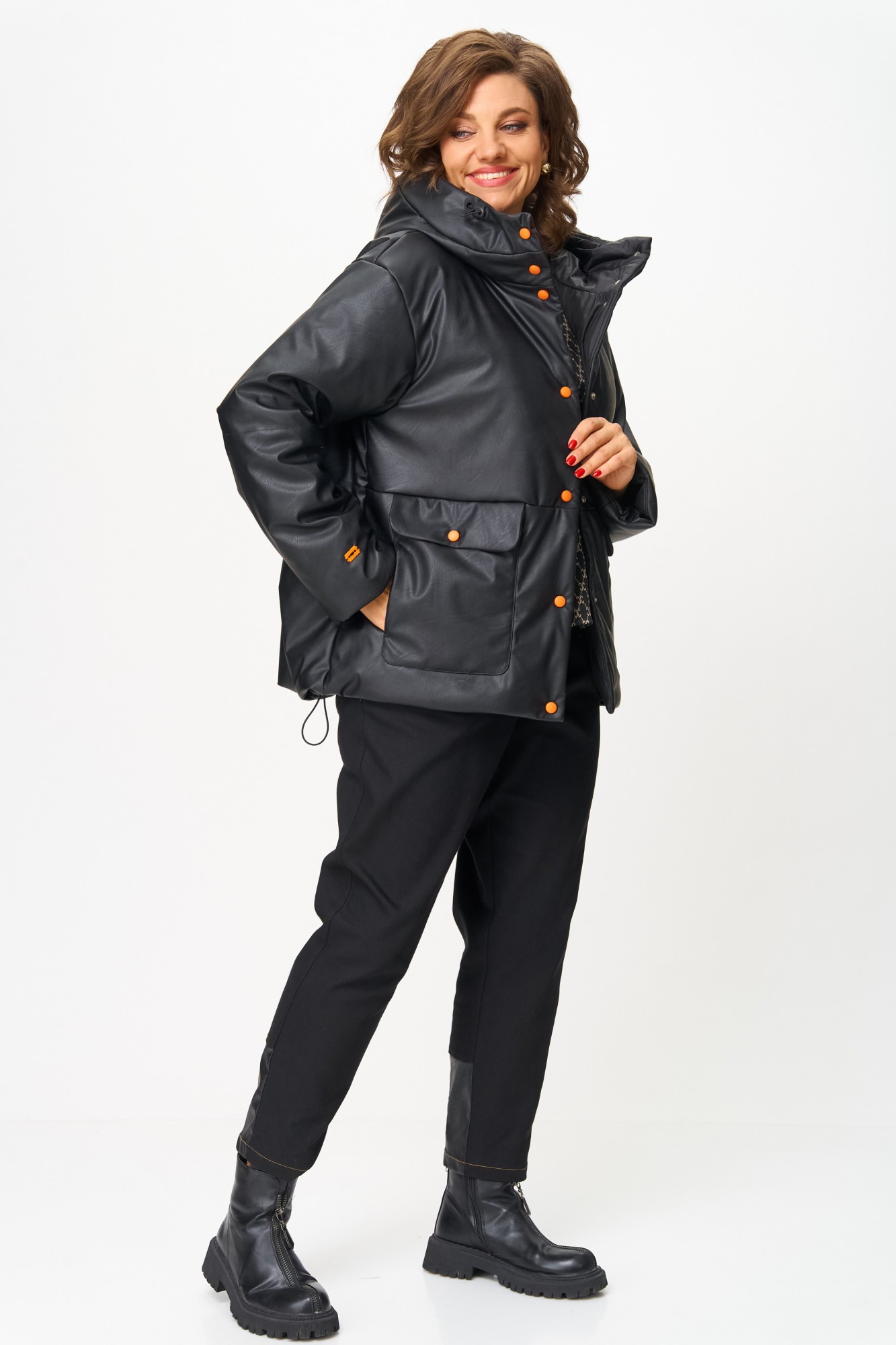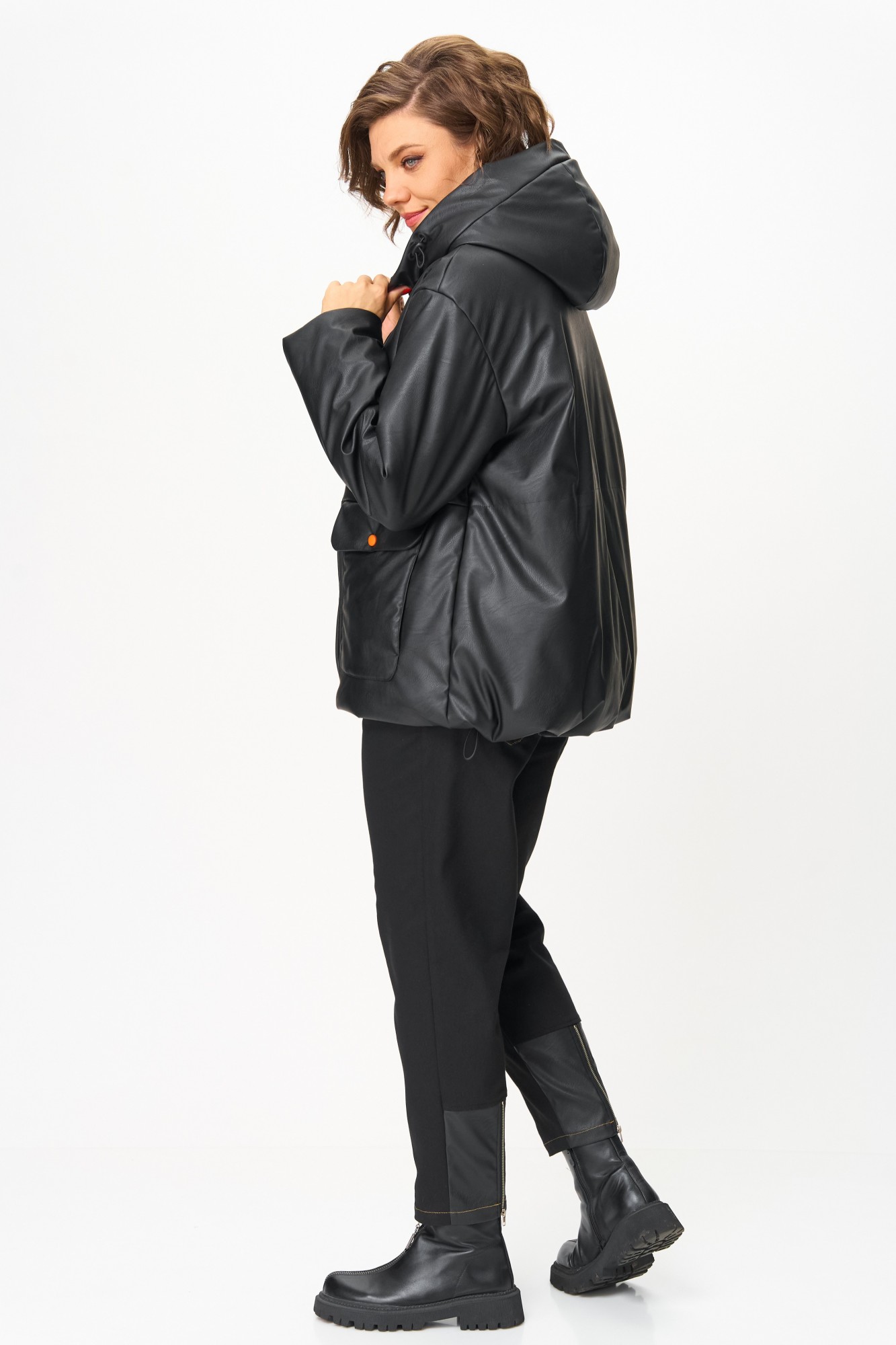Куртка утеплённая женская прямого силуэта, выполнена из экокожи, стёганной с утеплителем. Изделие со спущенным плечом, с втачным одношовным рукавом, с капюшоном, с центральной застёжкой на кнопки контрастного цвета. Перед с накладными карманами с клапанами, низ изделия фигурный, по низу спинки и капюшону регулируемая стяжка. Утеплитель Hoopon 150гр/м2, рекомендуется для эксплуатации при температуре +5 / -10 градусов (стоит учитывать индивидуальную восприимчивость к холоду). Подойдёт на рост 164-170см