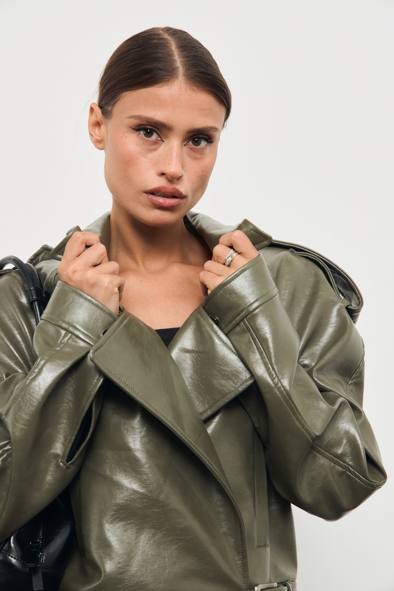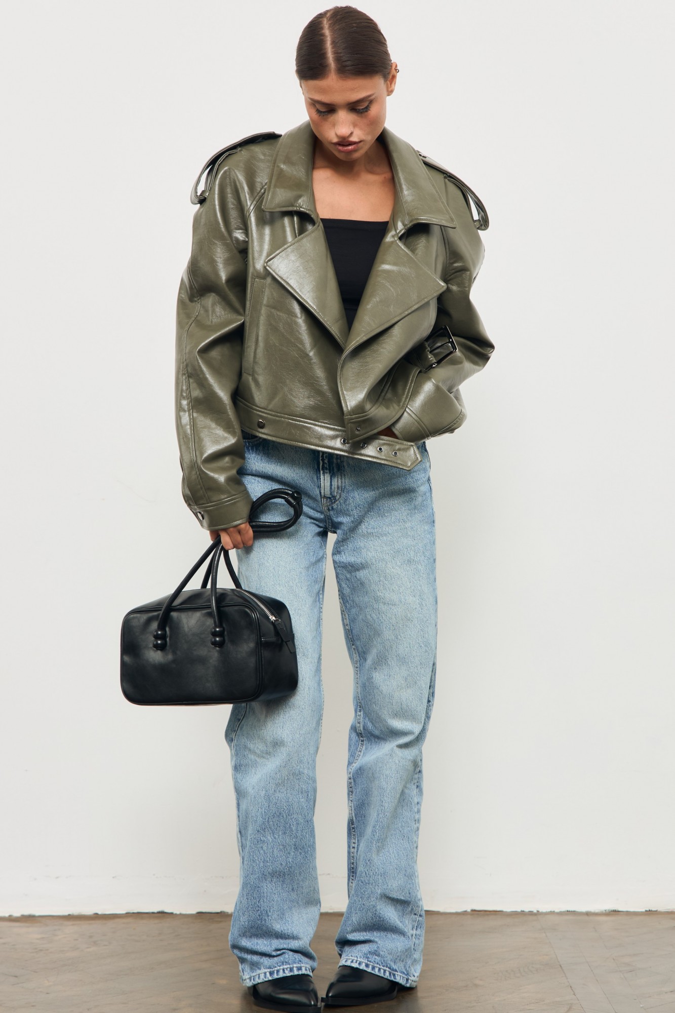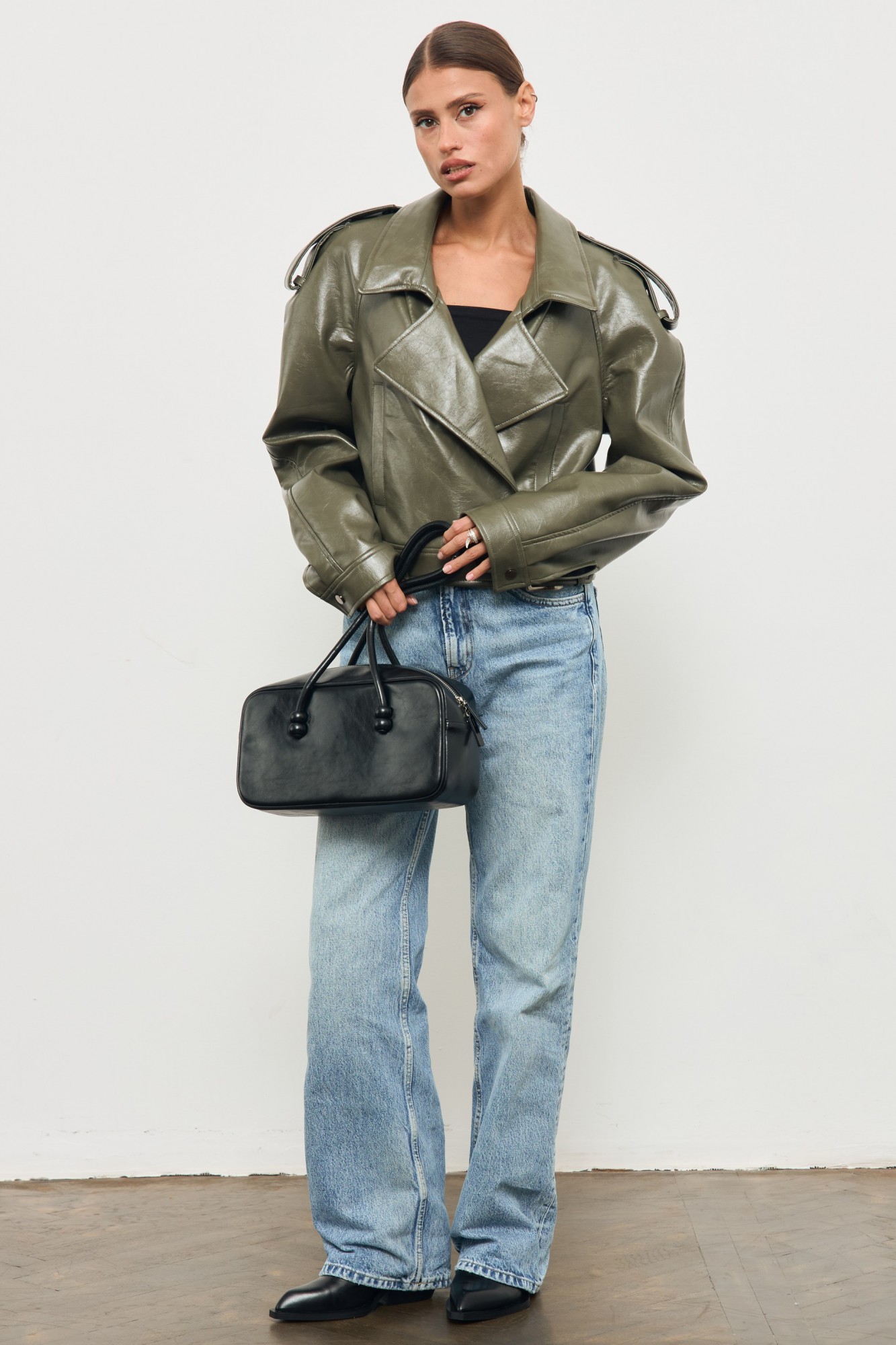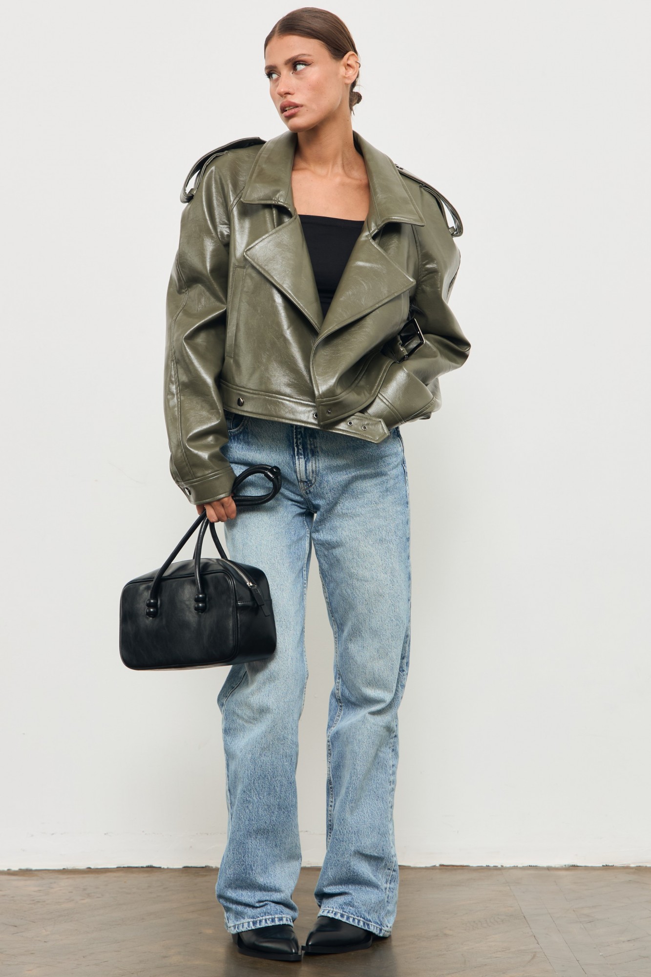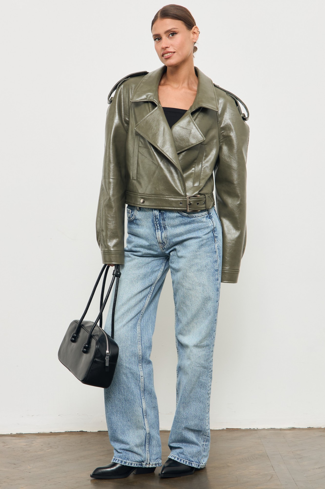 Куртка из экокожи, по переду застежка на кнопки. По низу функциональный пояс из основной ткани изделия. Спущенная линия плеча, по низу рукава манжета с патой.