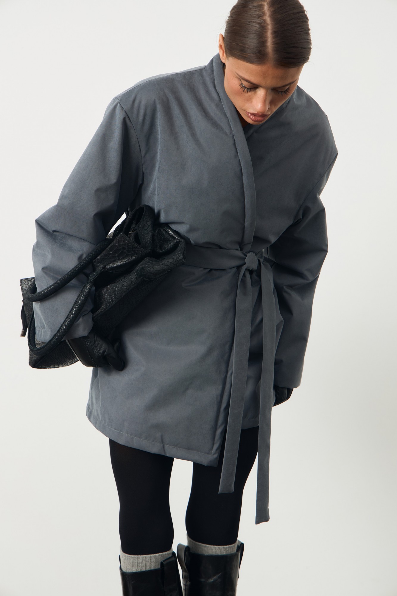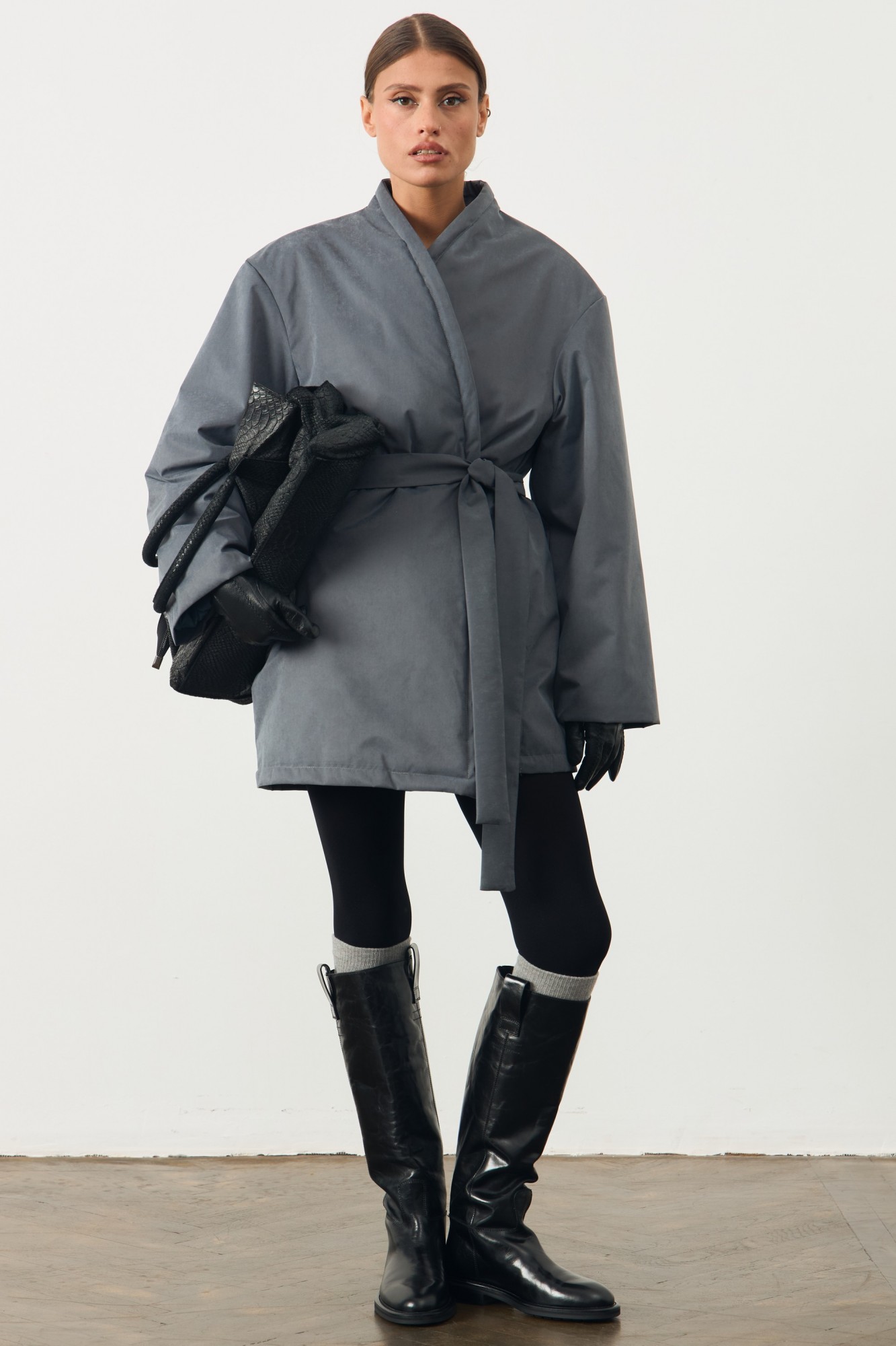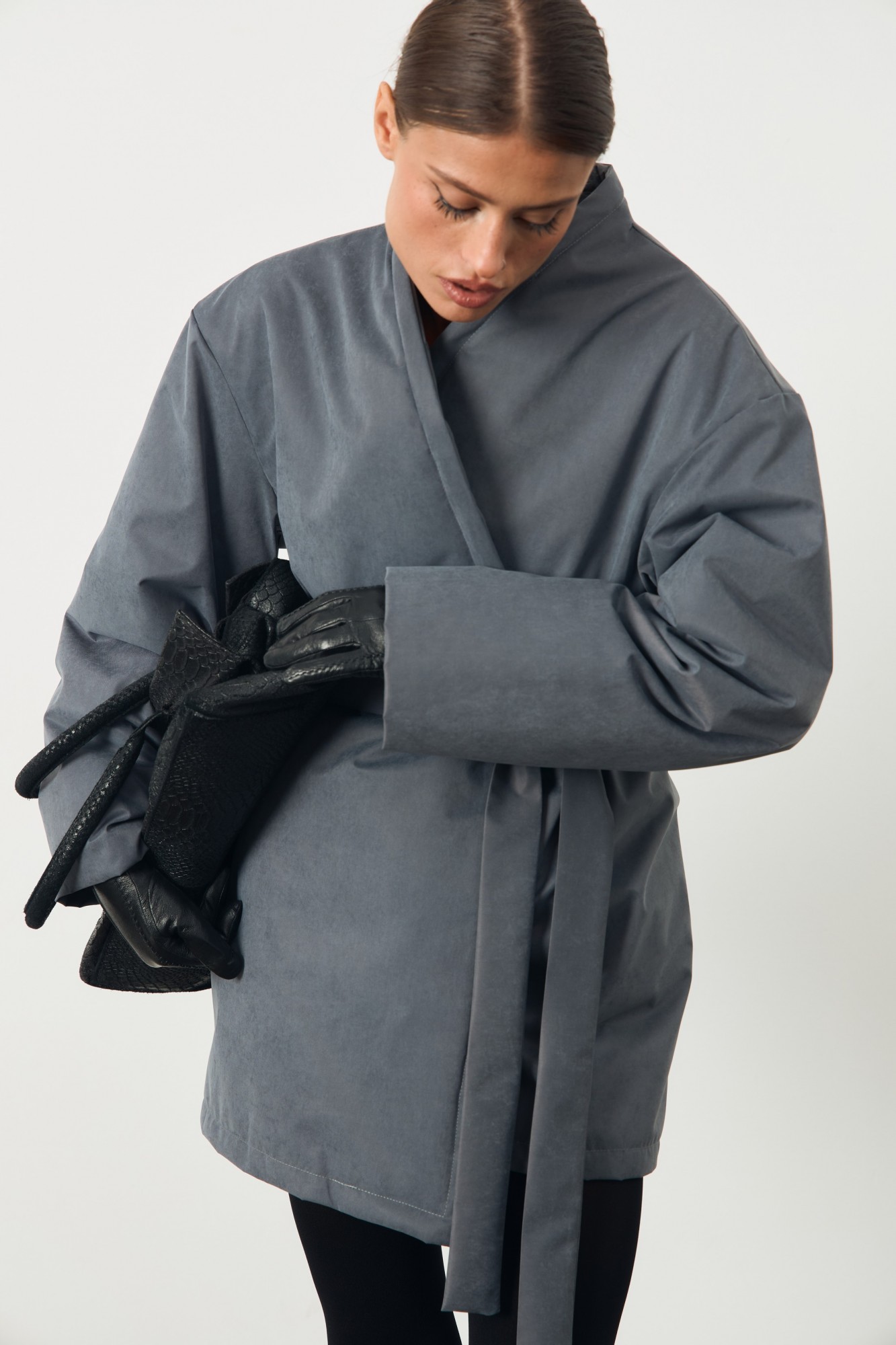 Куртка-кимоно из водостойкой плащевой ткани. В боковых швах карманы. По краю борта отстрочки. Модель с поясом.