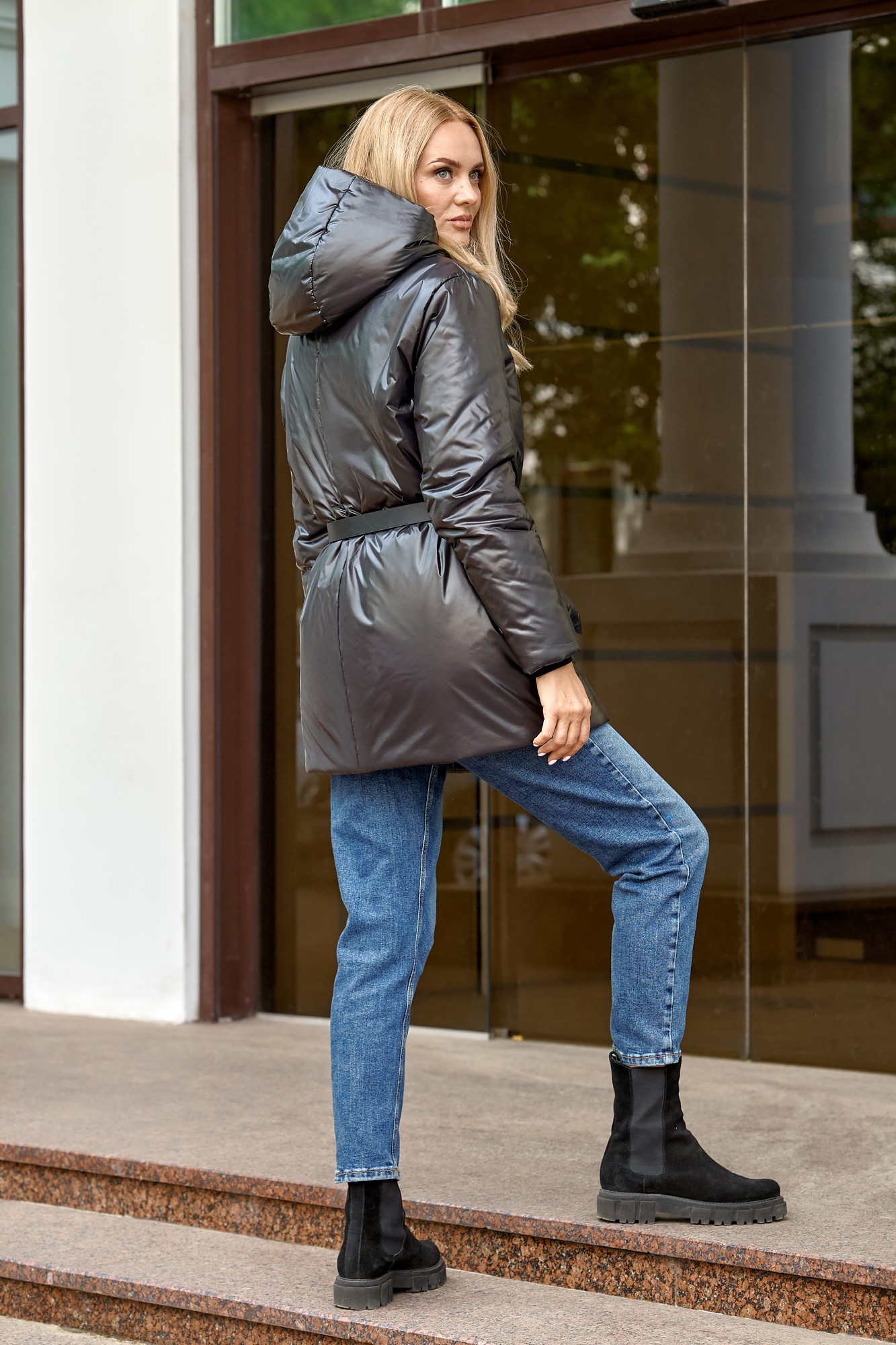 Куртка женская утепленная (до минус 10) из плащевой ткани, под съемный пояс из кожзаменителя, утеплитель изософт. Прямого силуэта, рукав втачной на спущенной пройме, с капюшоном, застежка спереди на молнию с двумя бегунками, по низу карманы с клапанами, сверху слева карман-обманка с нашивкой под ним. Изделие на подкладке.