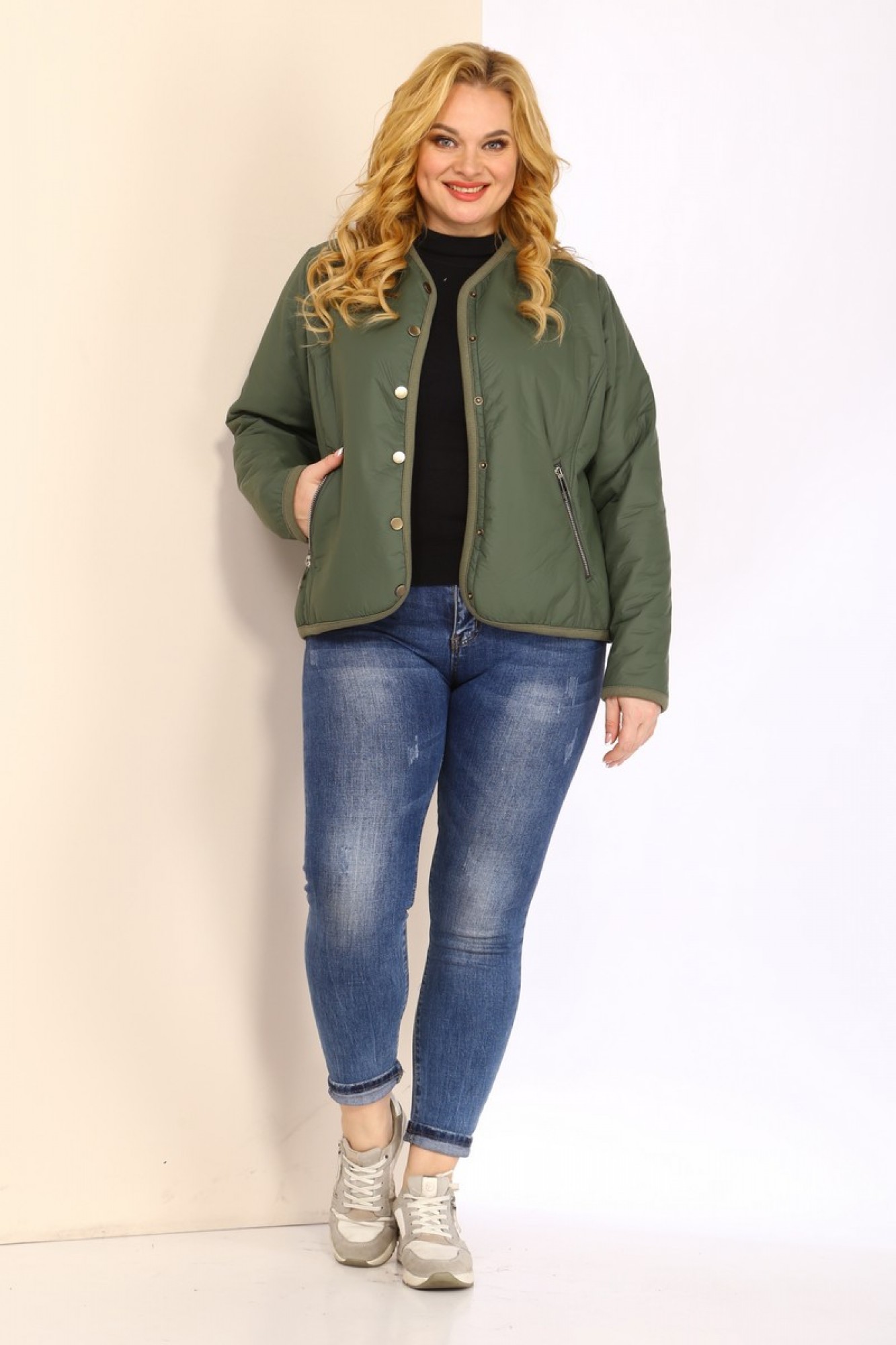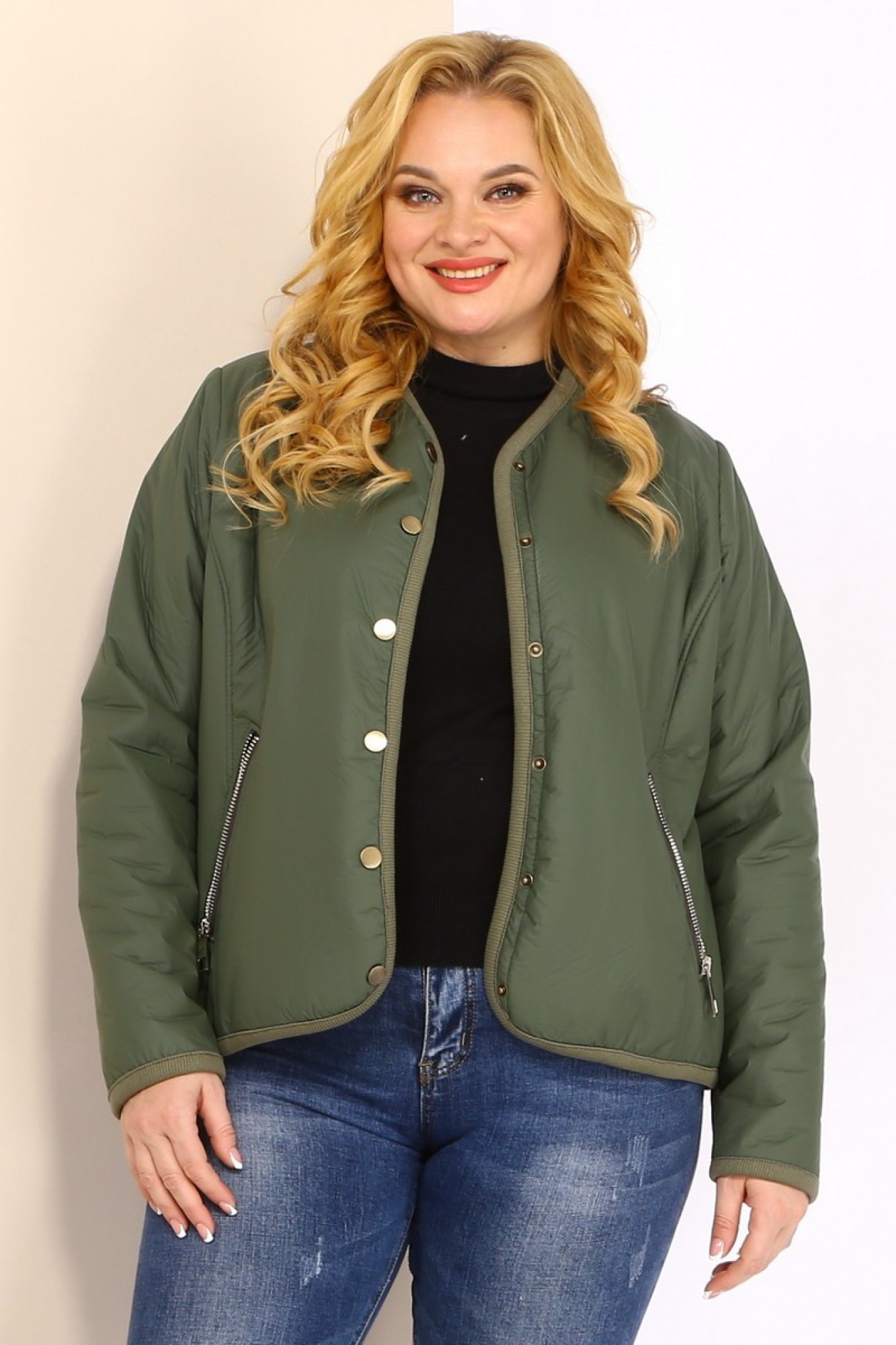 Застежка центральная на кнопки, на полочке выполнены рельефы и функциональные карманы на молнии. Спинка с центральным швом, рукав втачной одношовный. Все края куртки обработаны широкой трикотажной окантовкой.