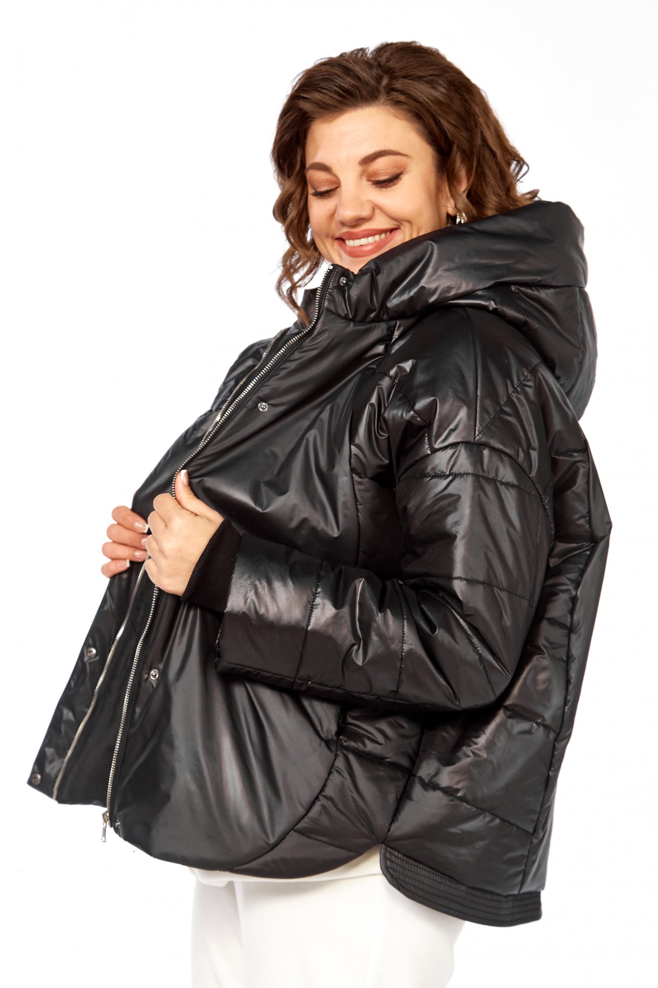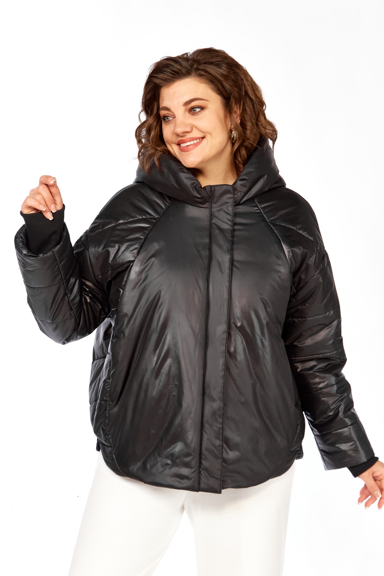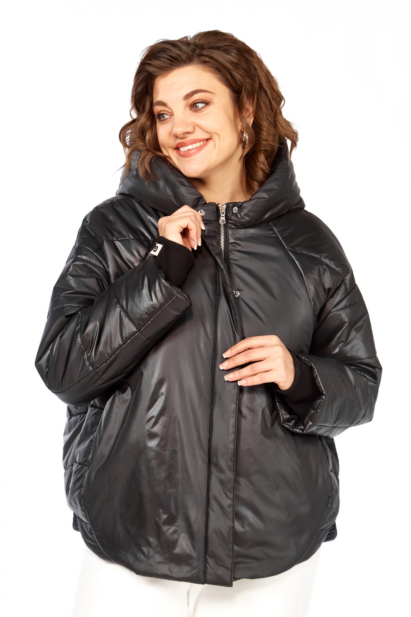 Куртка женская с центральной застежкой на тесьму-молнию и кнопки, спущенная линия плеча. По спинке рельефные швы от горловины до низа, по низу притачная отделочная планка. По переду рельефные швы от горловины до низа, в рельефных швах обработаны карманы. рукав втачной одношовный с манжетам по низу. Капюшон с центральной частью и отделочной деталью по отлету. Утеплитель синтепон 150 гр.