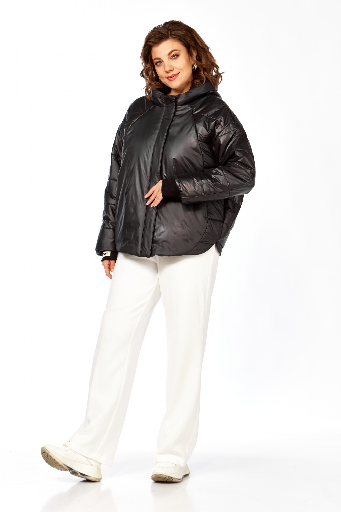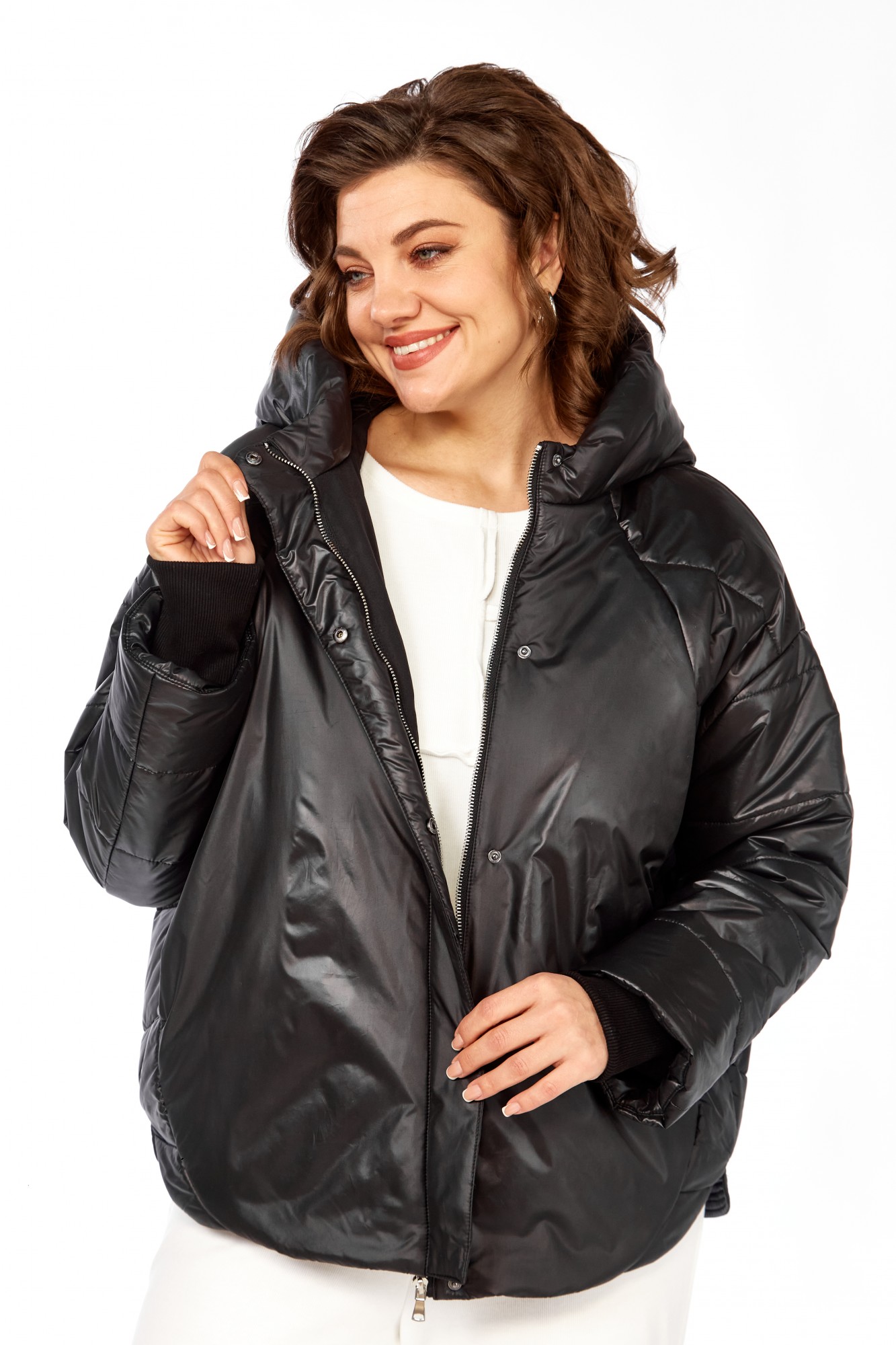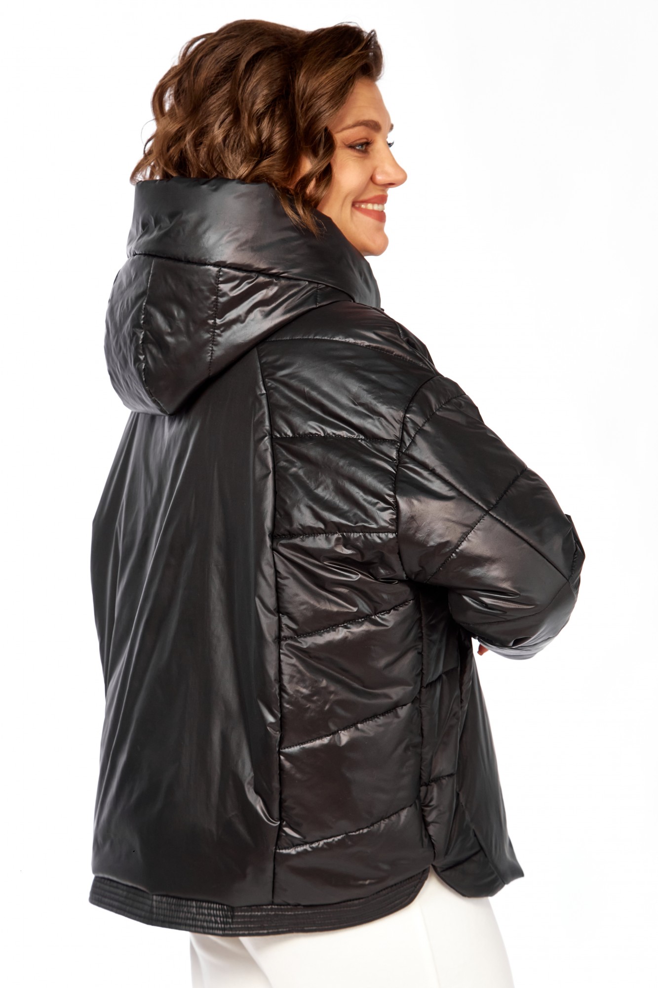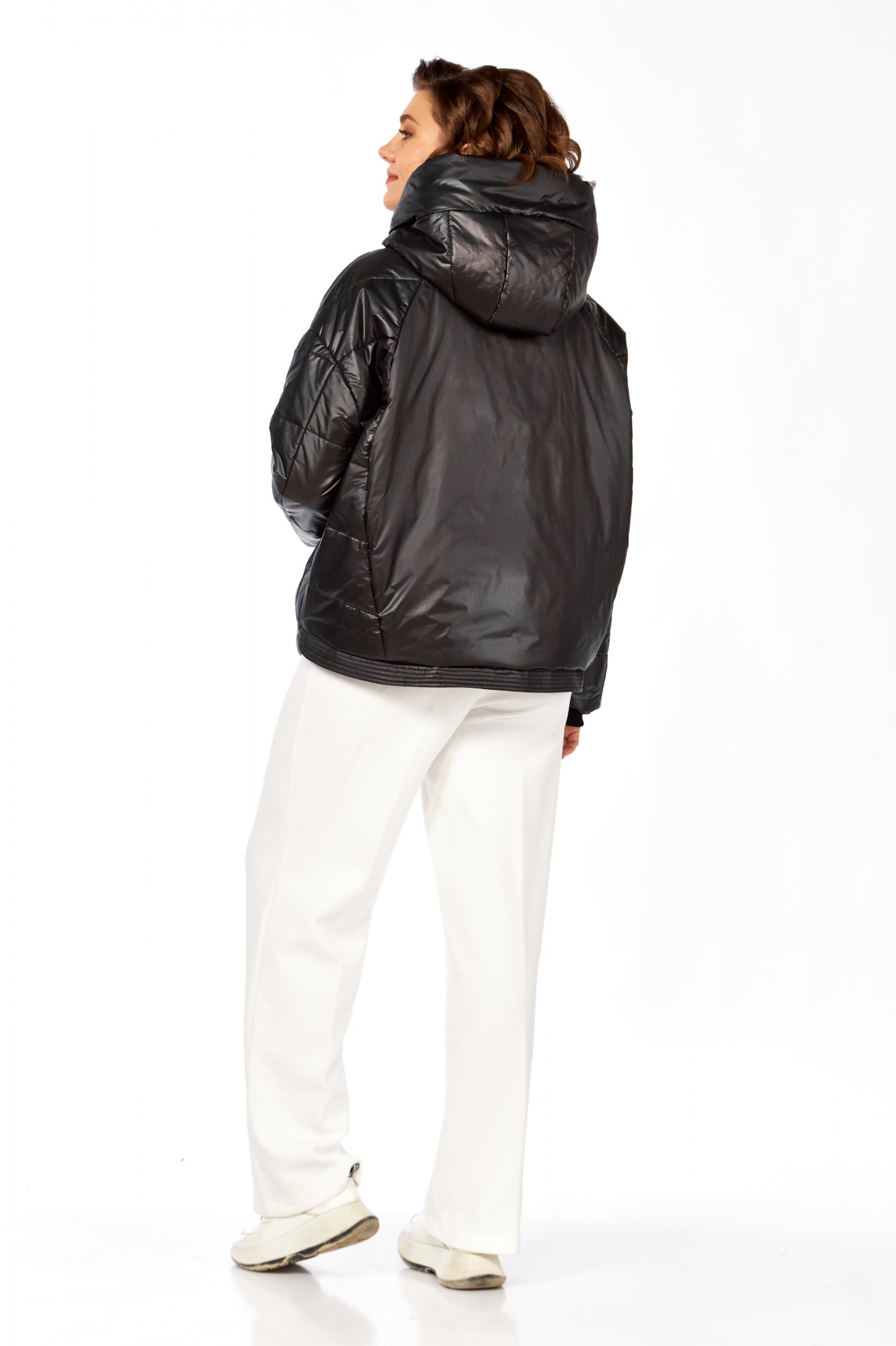 Куртка женская с центральной застежкой на тесьму-молнию и кнопки, спущенная линия плеча. По спинке рельефные швы от горловины до низа, по низу притачная отделочная планка. По переду рельефные швы от горловины до низа, в рельефных швах обработаны карманы. рукав втачной одношовный с манжетам по низу. Капюшон с центральной частью и отделочной деталью по отлету. Утеплитель синтепон 150 гр.