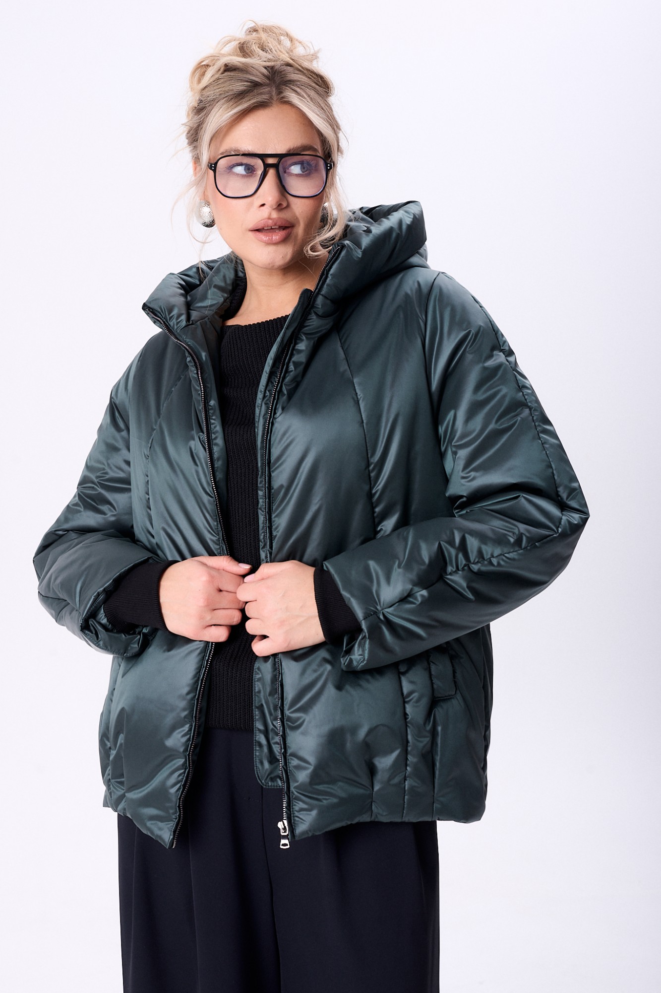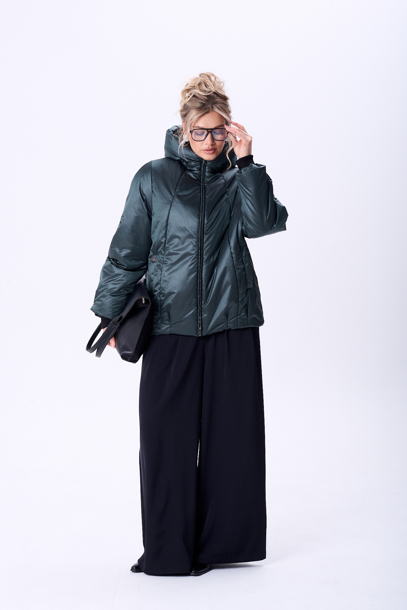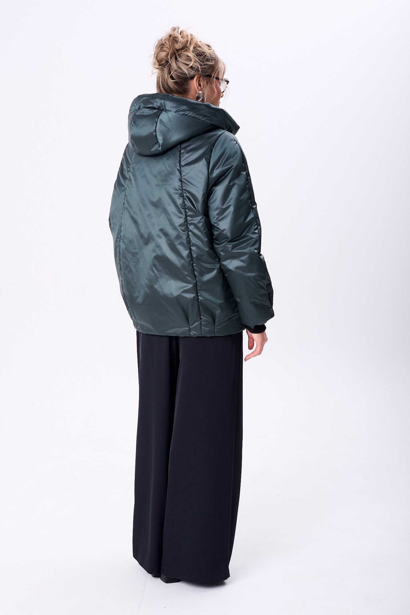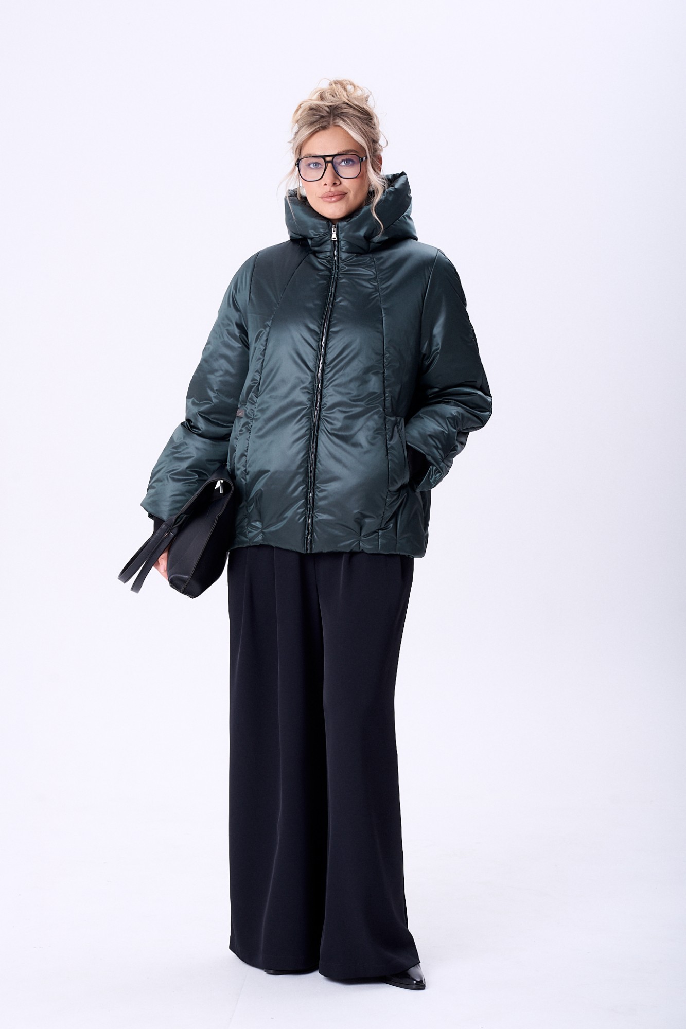 Куртка женская с центральной застежкой на тесьму-молнию. По спинке рельефные швы от горловины до низа, по низу заложены складки. По переду рельефные швы от горловины до низа, по низу заложены складки, обработаны карманы с втачной вытачкой. Рукав полуреглан 2шовный. Капюшон с центральной частью и отделочной деталью по отлету. В качестве отделки используется фурнитура. Утеплитель синтепон 150 гр.