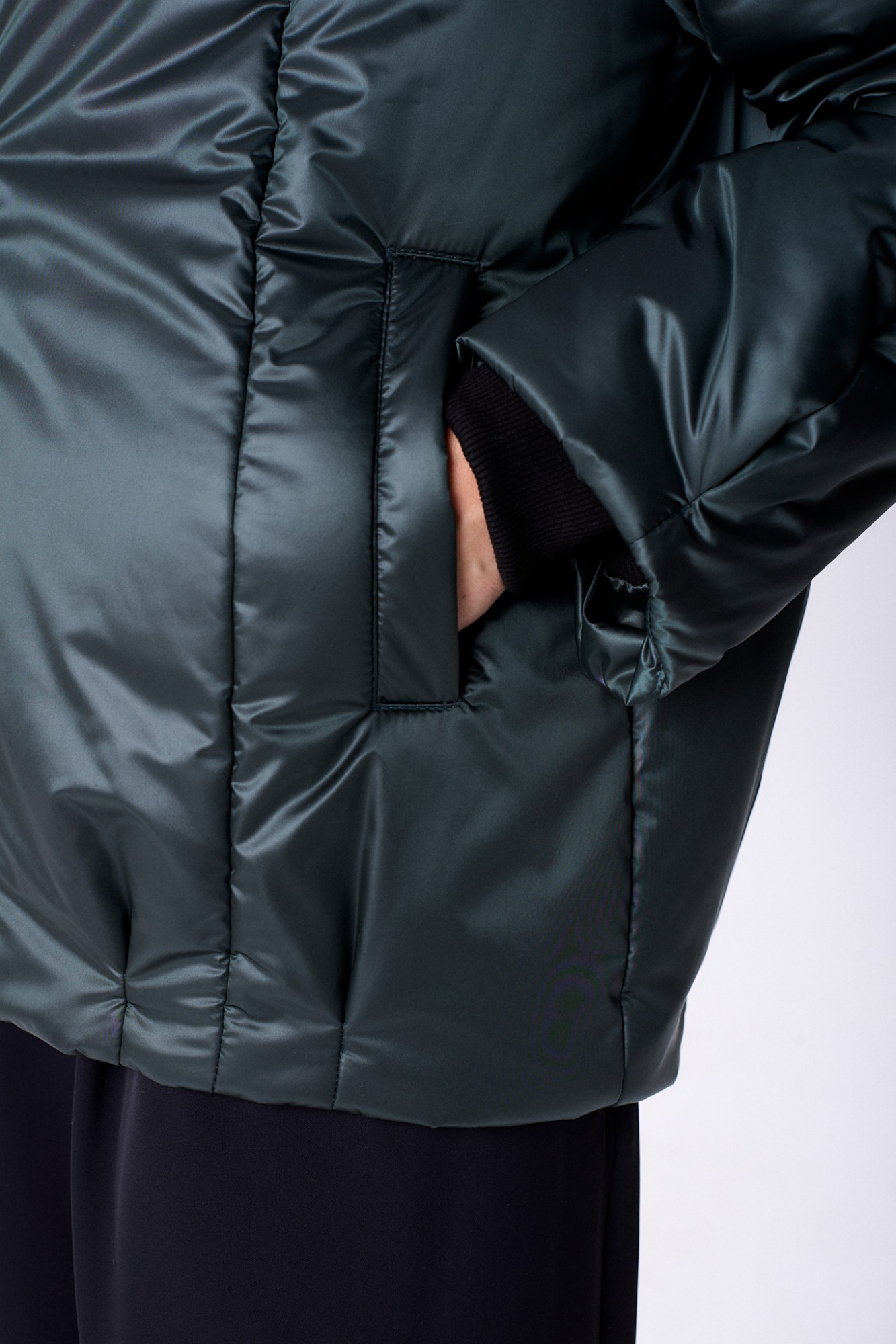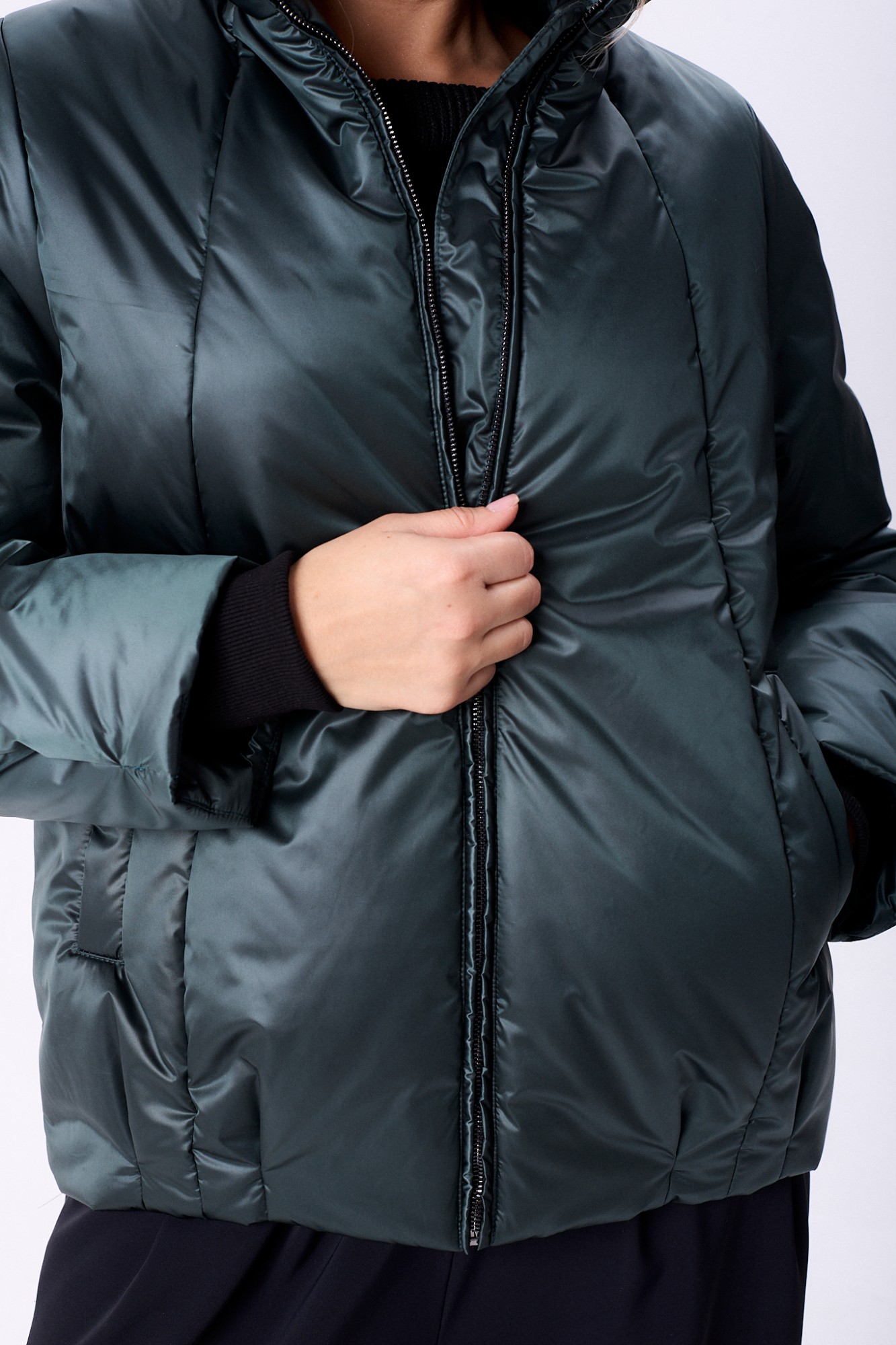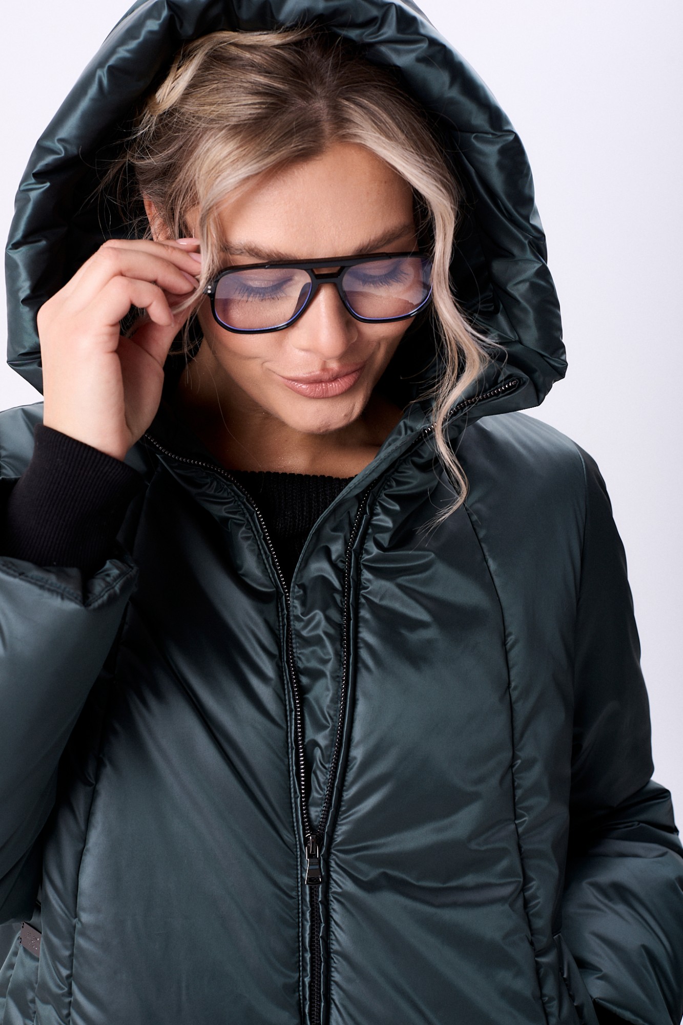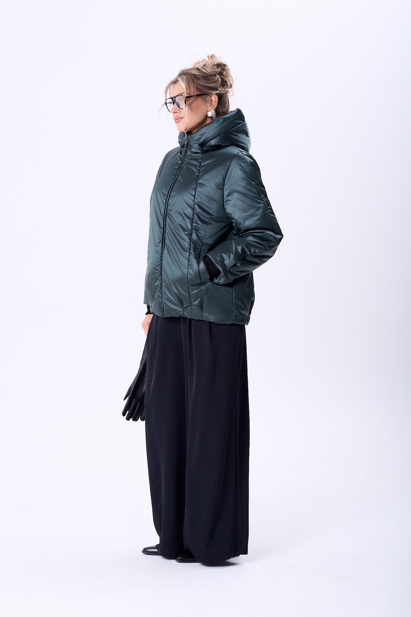 Куртка женская с центральной застежкой на тесьму-молнию. По спинке рельефные швы от горловины до низа, по низу заложены складки. По переду рельефные швы от горловины до низа, по низу заложены складки, обработаны карманы с втачной вытачкой. Рукав полуреглан 2шовный. Капюшон с центральной частью и отделочной деталью по отлету. В качестве отделки используется фурнитура. Утеплитель синтепон 150 гр.