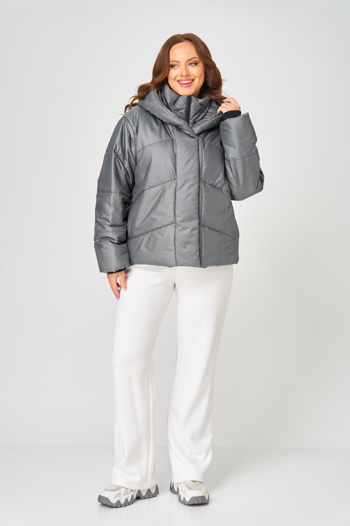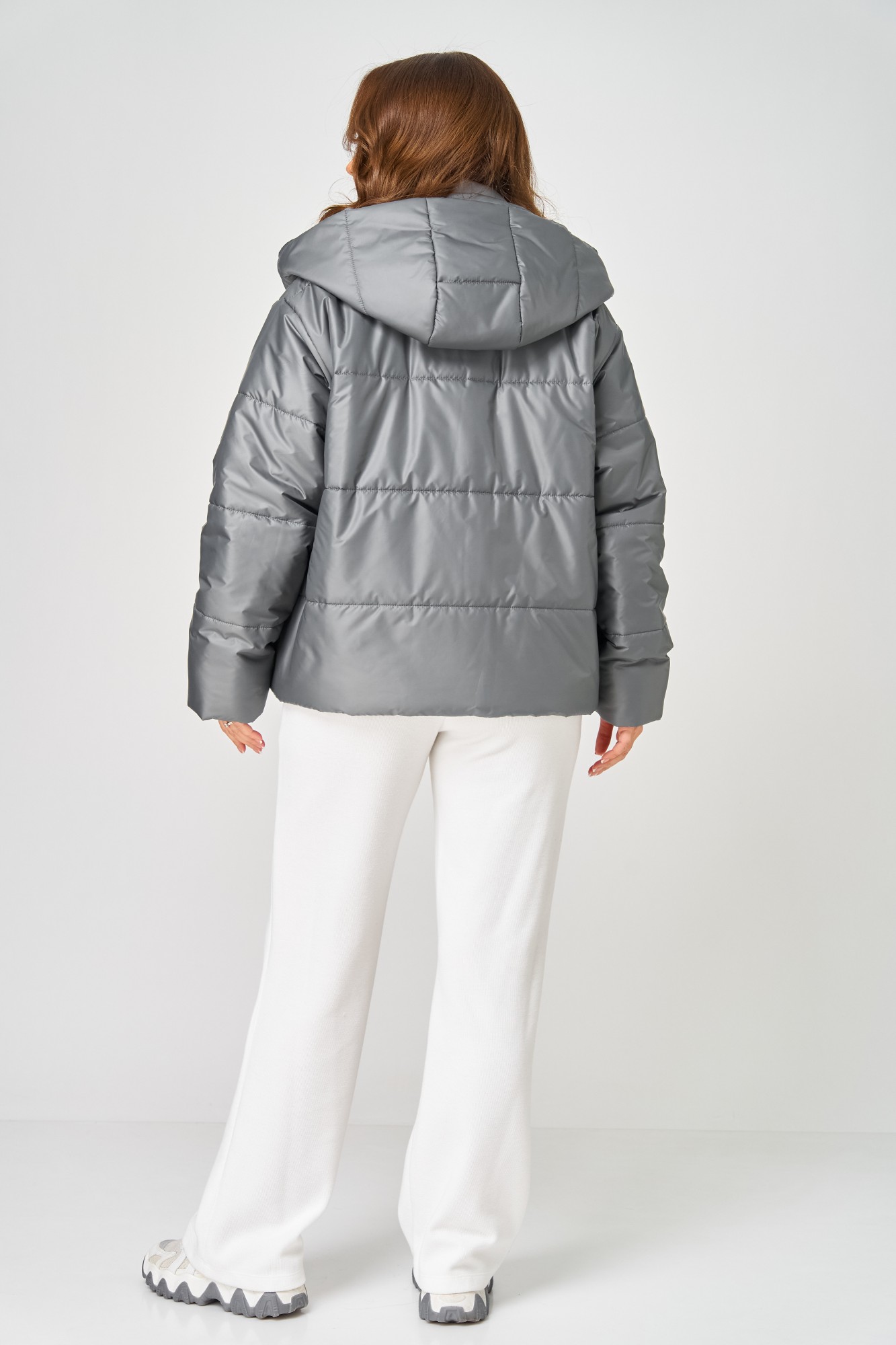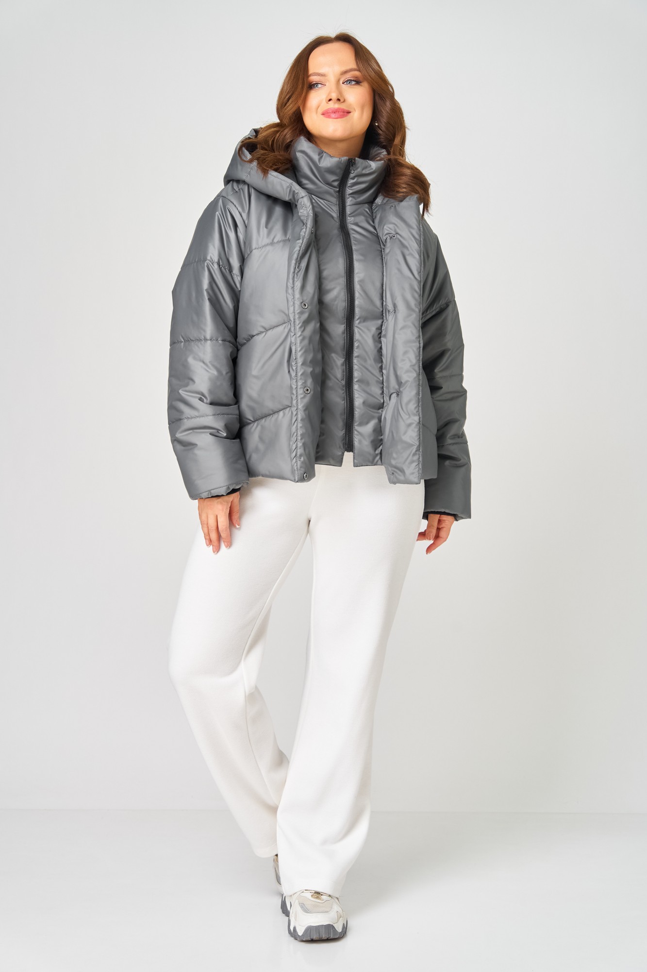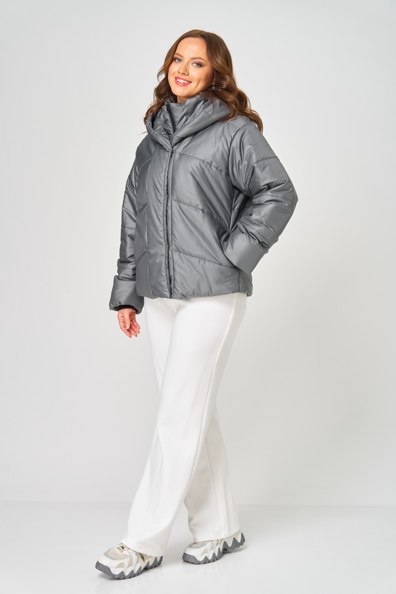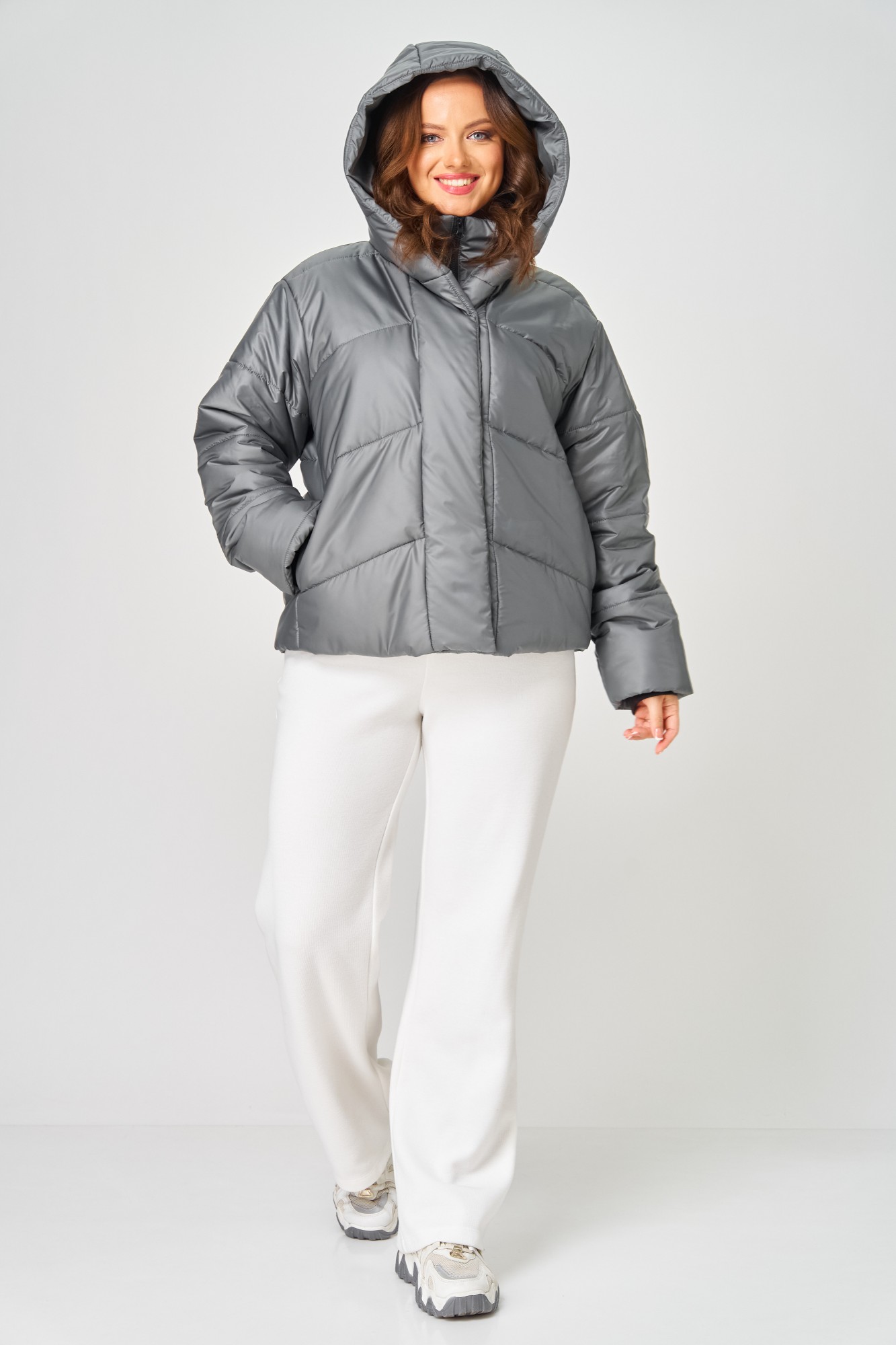 Куртка женская с центральной застёжкой на молнию и потайные кнопки. Спинка с горизонтальной стяжкой. Полочка выстегана по косой. В боковых швах обработаны карманы. Рукав втачной одношовный с трикотажными манжетами из-под подгибки. Воротник-капюшон переходящий в планку с кнопками. Внутренний воротник-стойка с манишкой на молнии. Куртка на утеплителе. Температурный режим до - 10 градусов.