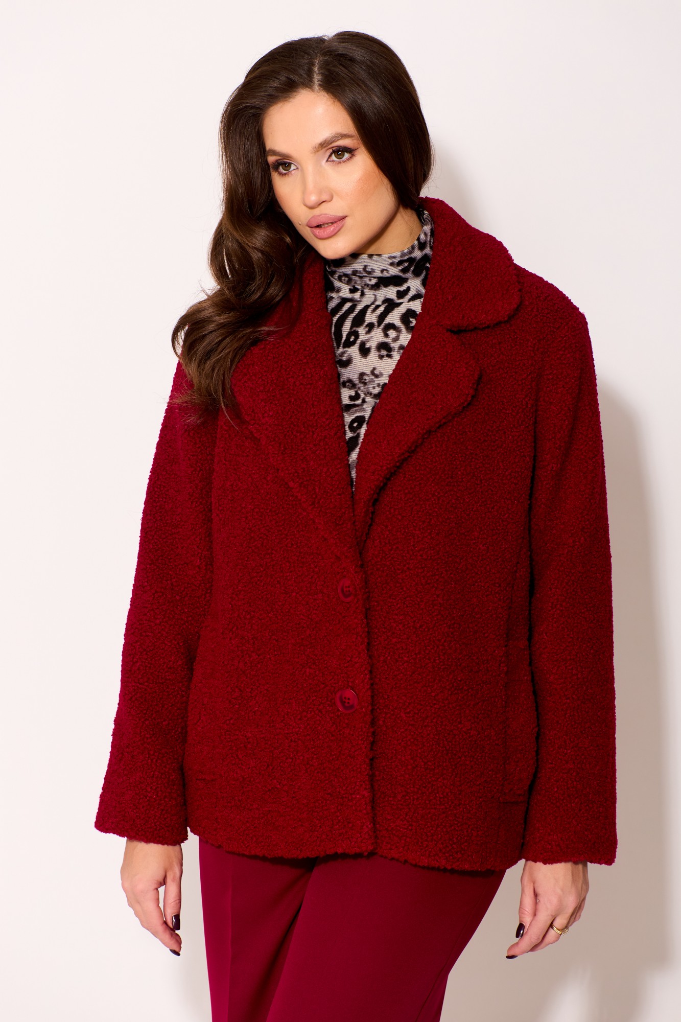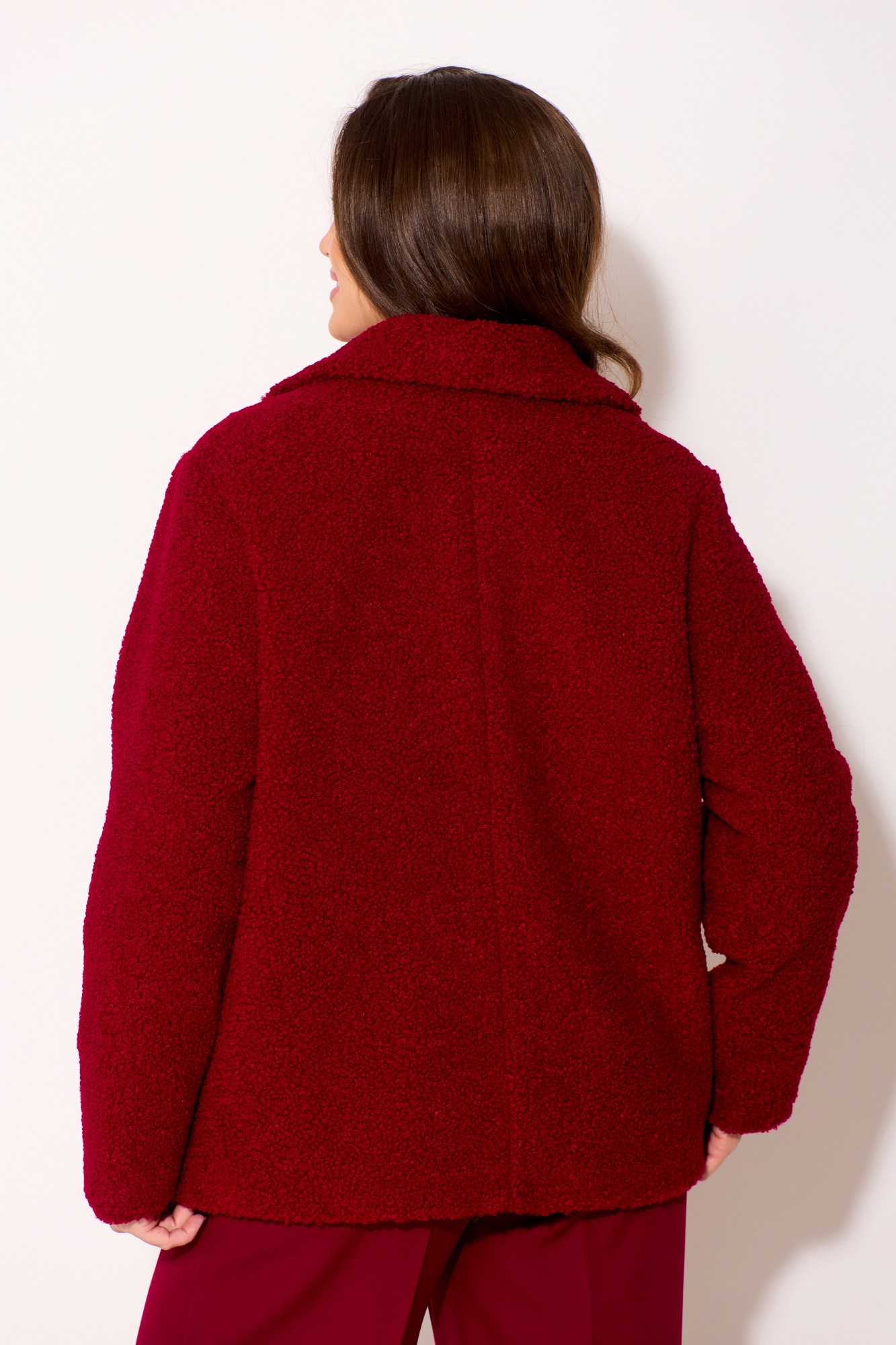 Описание: Куртка свободного силуэта выполнен из пальтовой ткани "Барашек". Воротник пиджачного типа с закругленными концами. Застежка на две петли и пуговицы. Перед с рельефными швами, в которых обработаны карманы с листочками с надстрочными концами. Рукав втачной двухшовный. Куртка на подкладке.