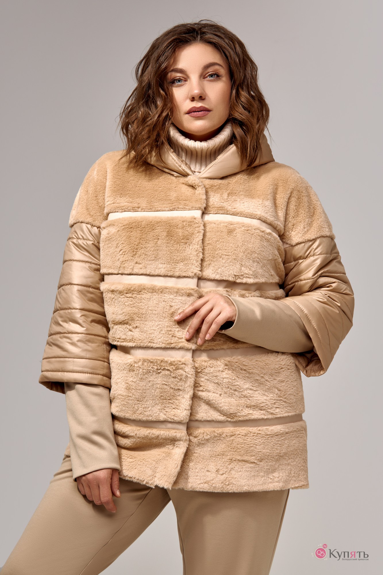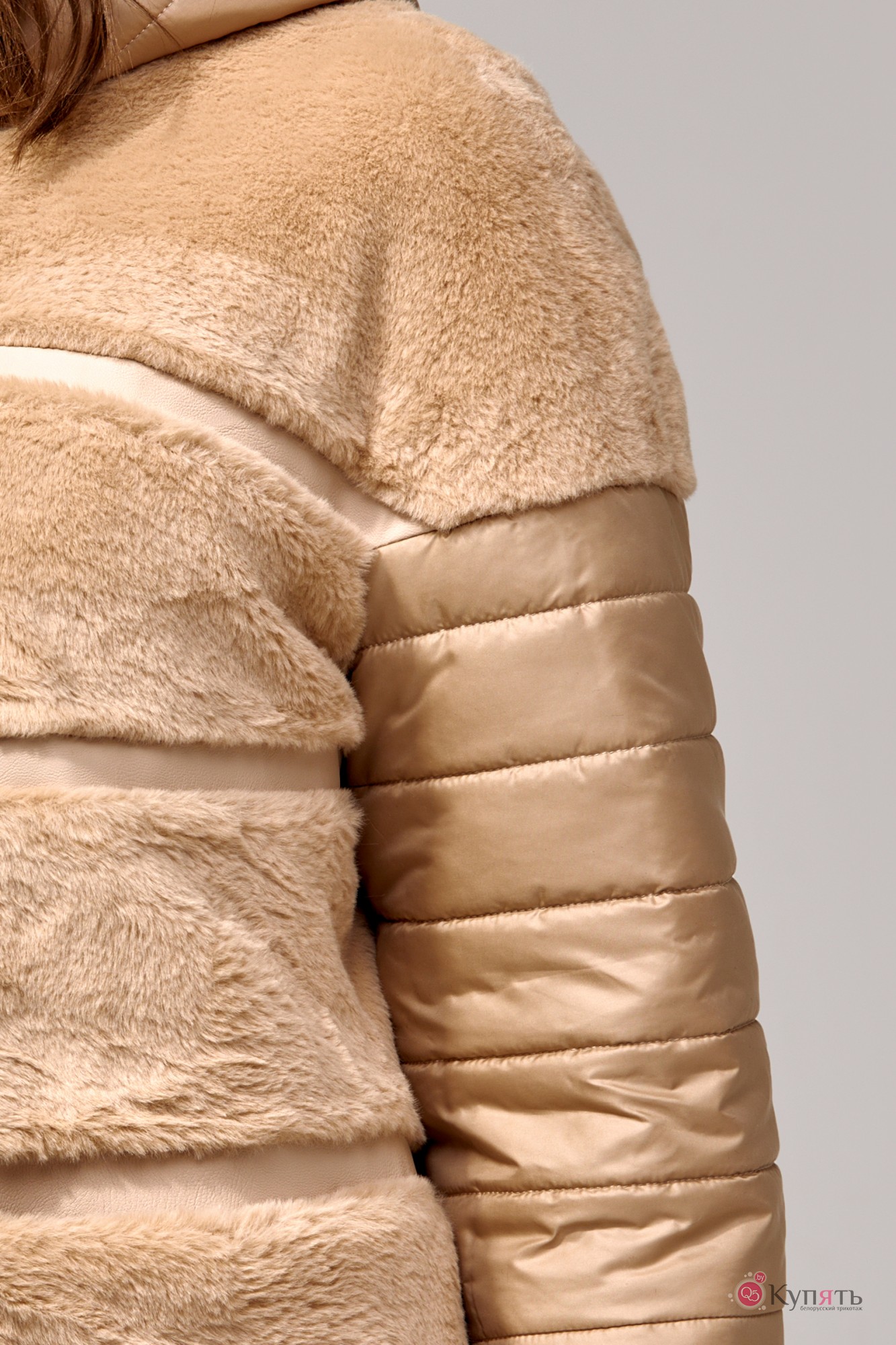 Куртка женская прямого силуэта из искусственного меха со вставками из эко-кожи. Рукава выполнены из стеганой ткани на трикотажной манжете, плечи спущенные, по переду карманы и застежка на потайные кнопки.
