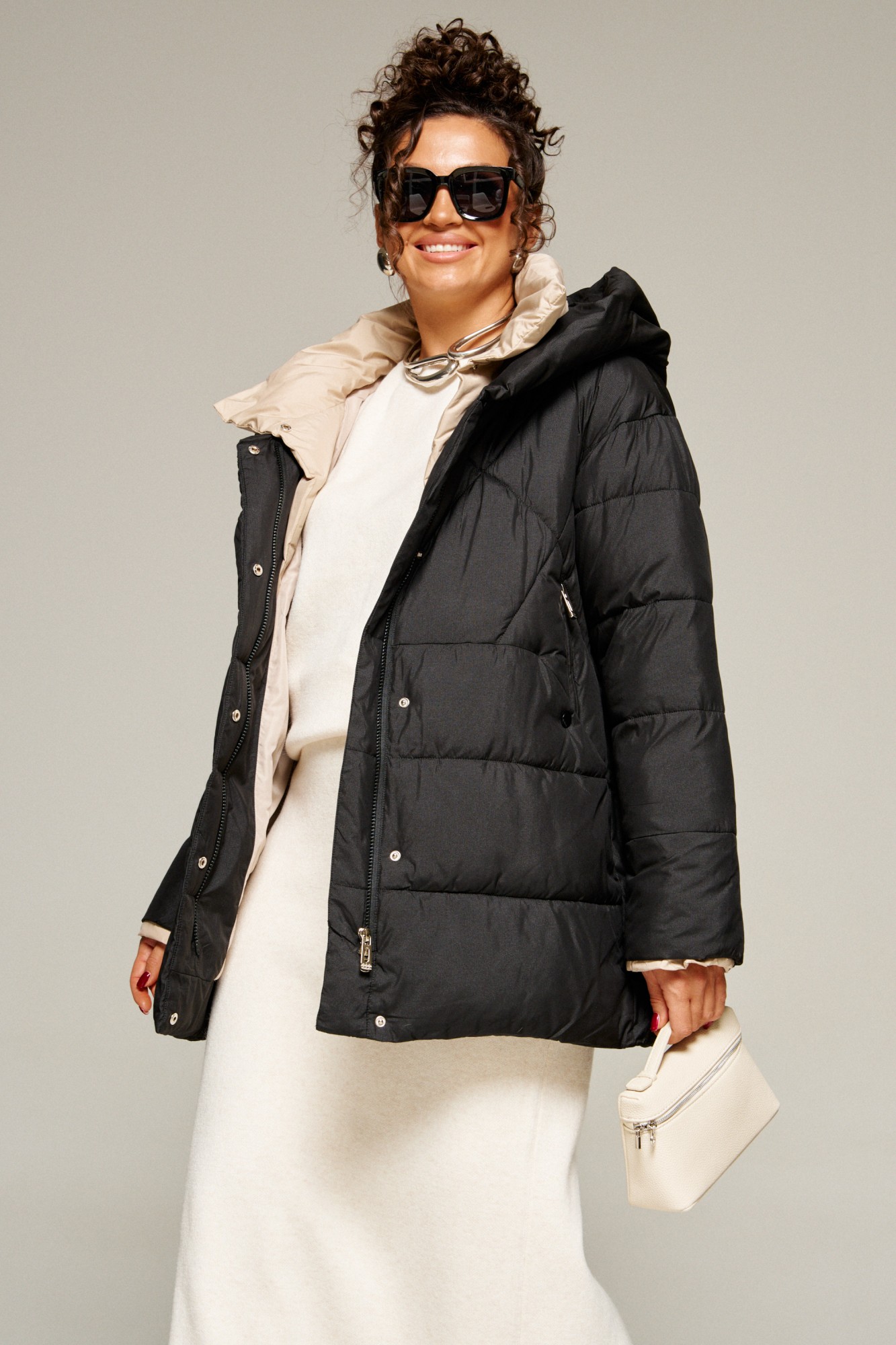 Застежка центральная на двустороннюю молнию от уровня груди до низа и кнопки по краю борта.
