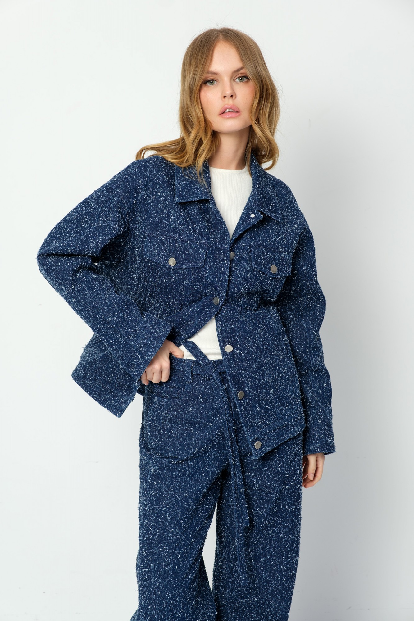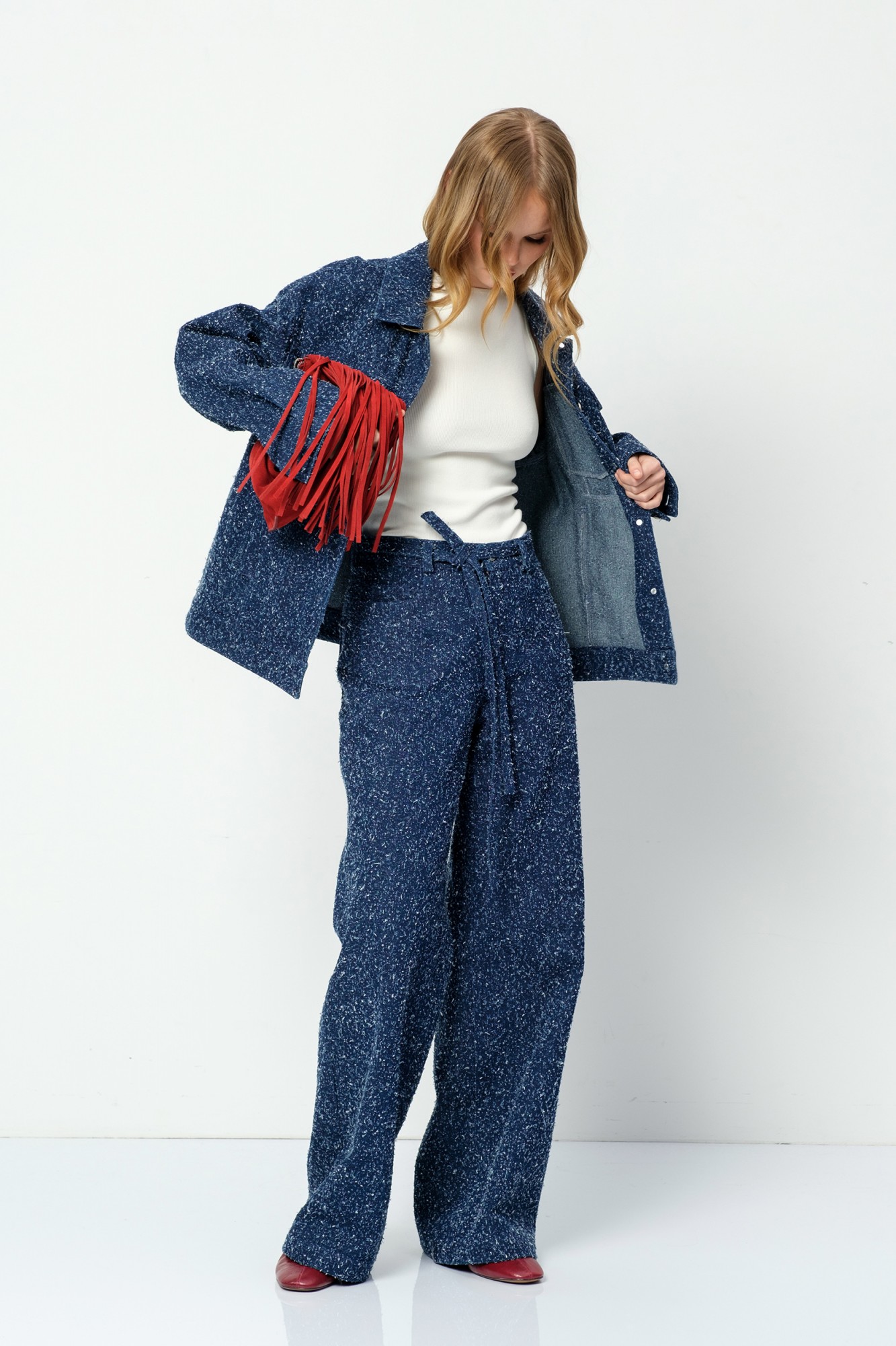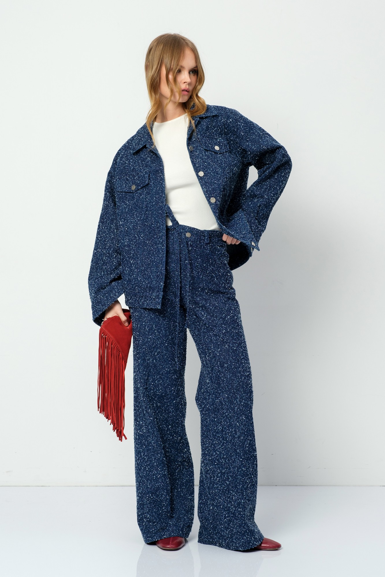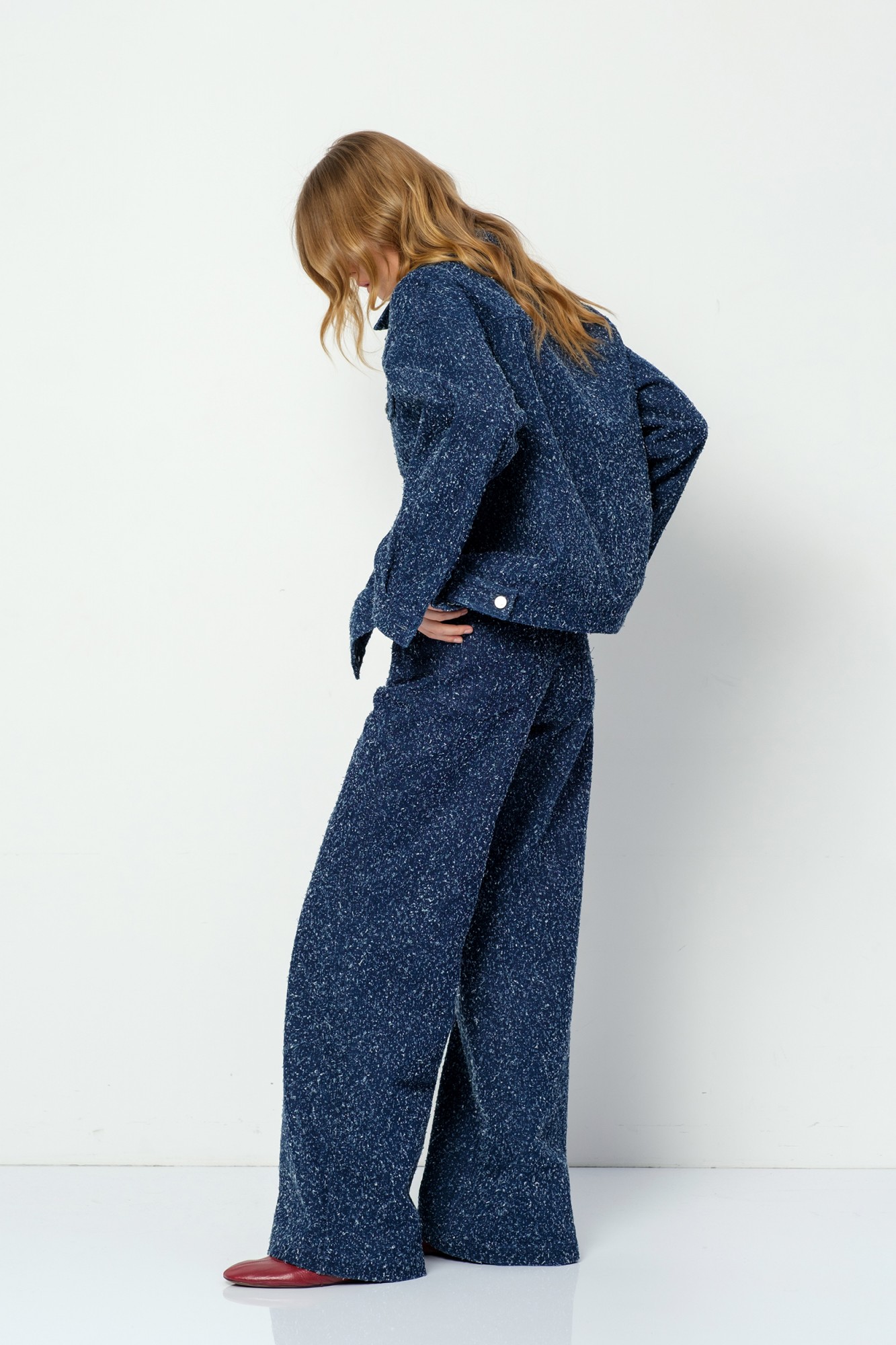 Свободная куртка из хлопкового джинса с перфорацией. Детали: куртка прямого силуэта, спущенная линия плеча, кокетки переда и спинки, рельефные швы, функциональные карманы, застежка на петли и металлические пуговицы, рукава длинные с притачными манжетами.