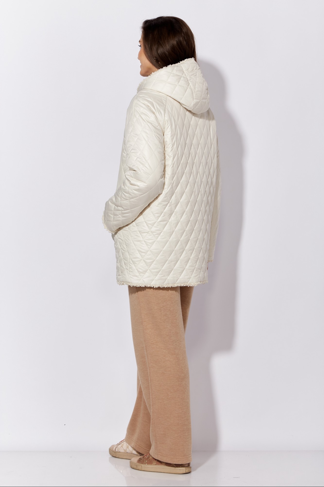 Куртка женская, демисезонная. Верх куртки - плащевка, стеганная на синтепоне. Подкладка - экомех барашек. Куртка прямого силуэта с длинным рукавом реглан. Длина рукава может регулироваться отворотом. По переду центральная застежка на молнию и прорезные, функциональные карманы. Горловина оформлена капюшоном-стойкой по переду.