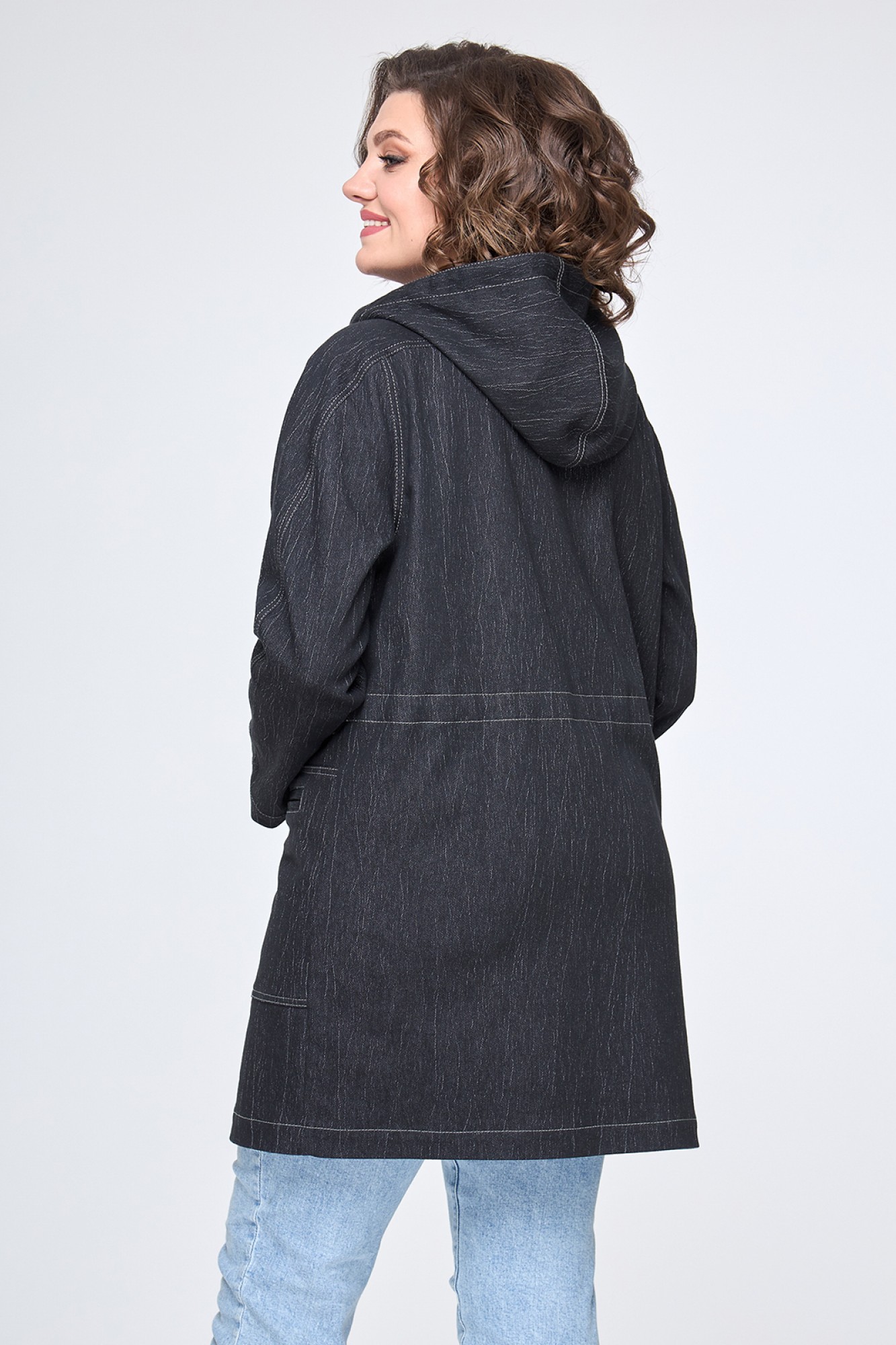 Модная женская куртка прямого силуэта из джинсовой ткани без подкладки. Куртка имеет не съемный функциональный капюшон, удобную застежку на молнию, закрытой планкой на кнопках, а также накладные карманы. Рукав реглан обеспечивает свободу и непринужденность. Объем по линии талии спереди фиксируется внутренней кулисой. Все швы изделия отстрочены, как это и предполагает джинсовый стиль.