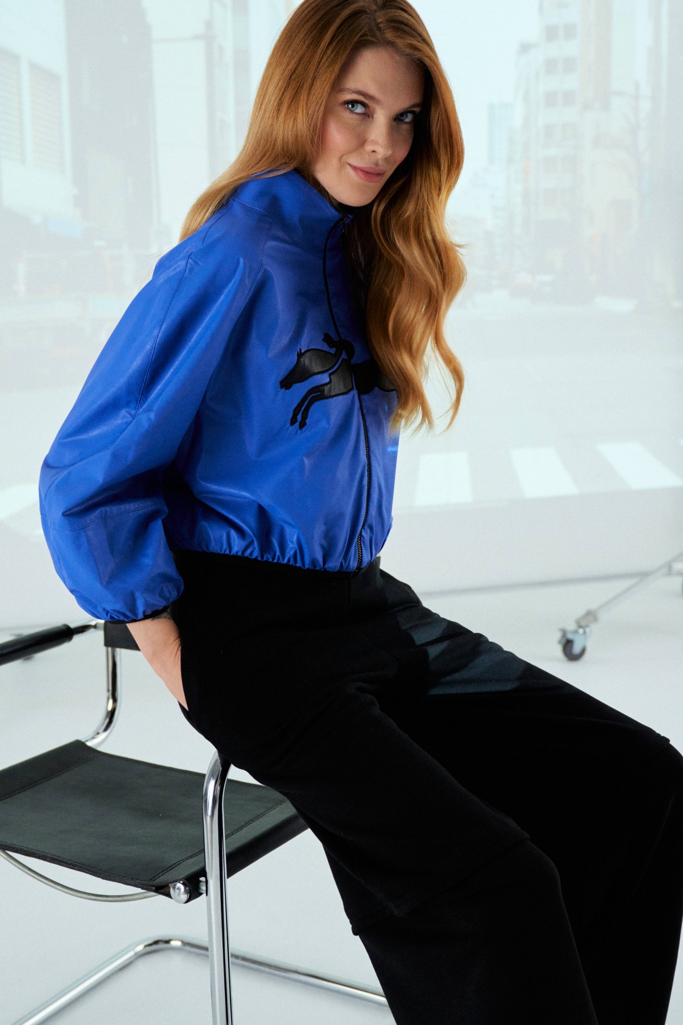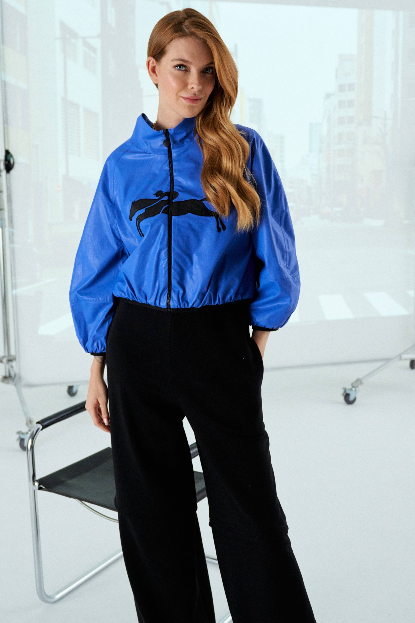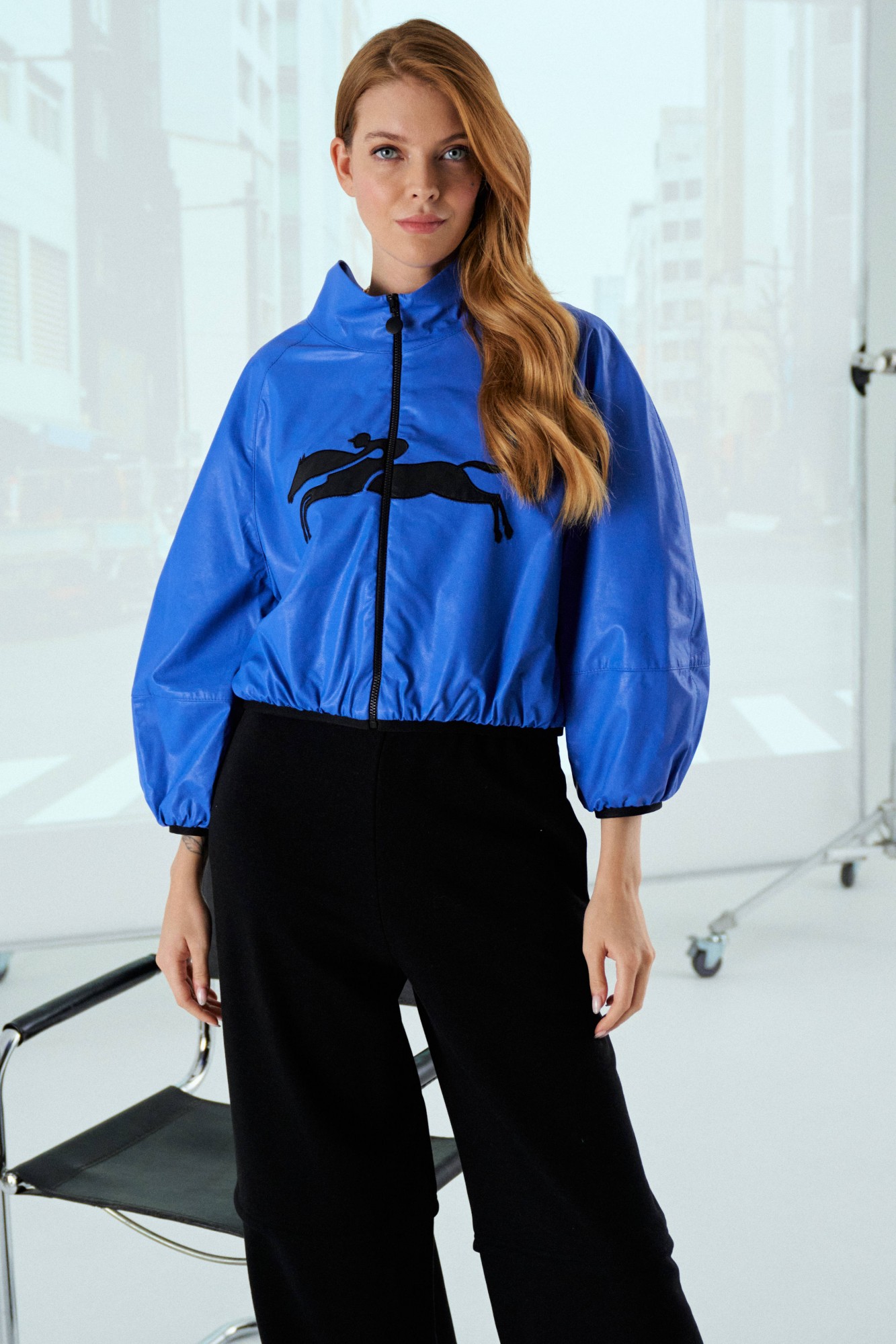 Куртка свободного силуэта из экокожи, на подкладке. Рукав реглан 3/4, объёмный с подрезом в области локтя, низ у рукава собран на эластичную тесьму. По горловине воротник стойка, застёжка на молнию. По переду аппликативная вышивка из экокожи, низ куртки собран на эластичную тесьму.