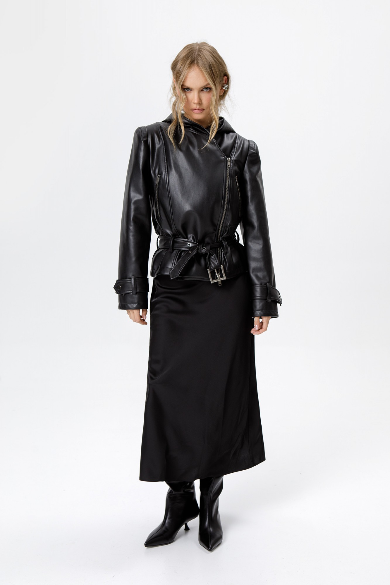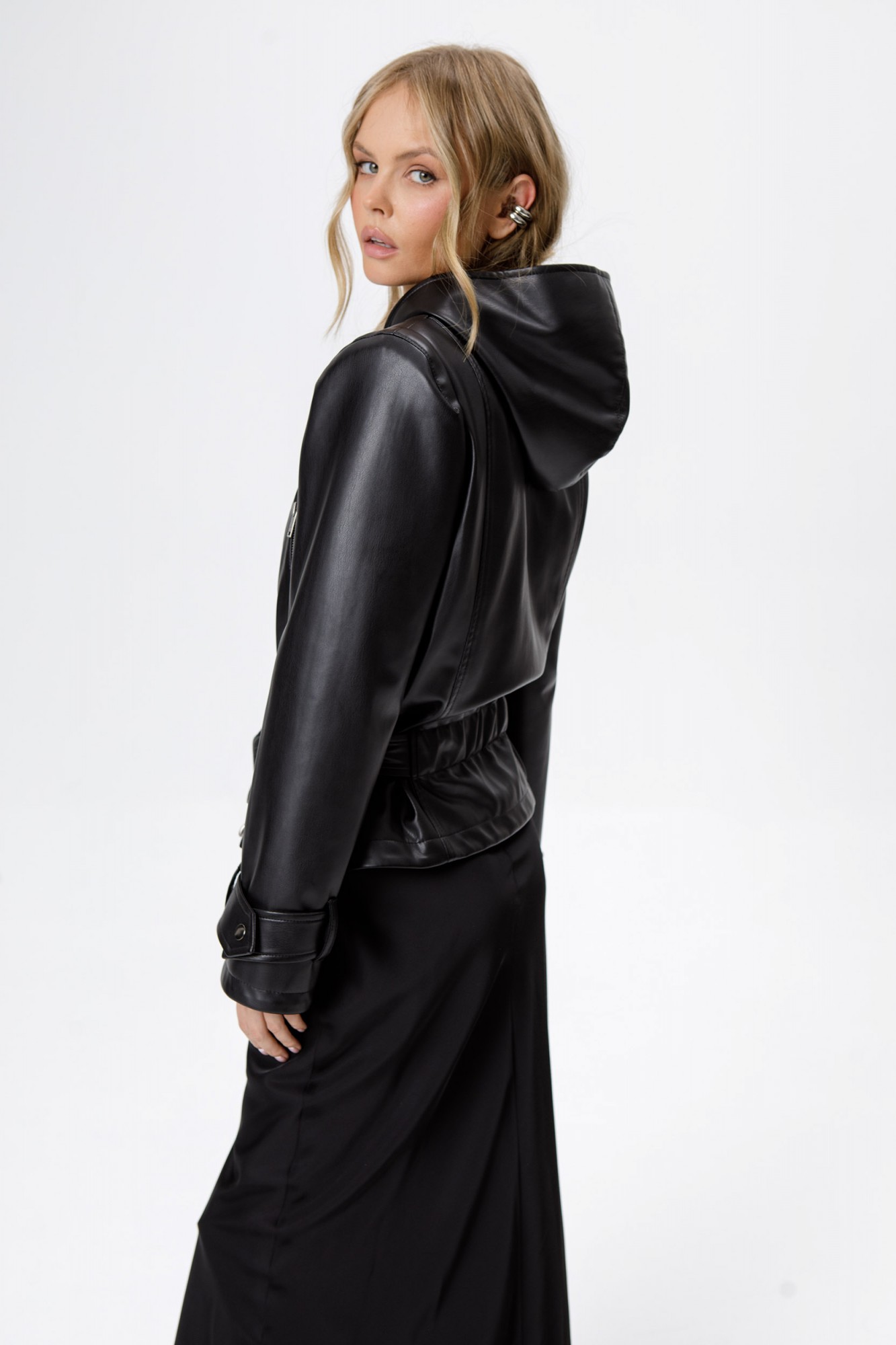 Куртка из экокожи с капюшоном и акцентными плечами.