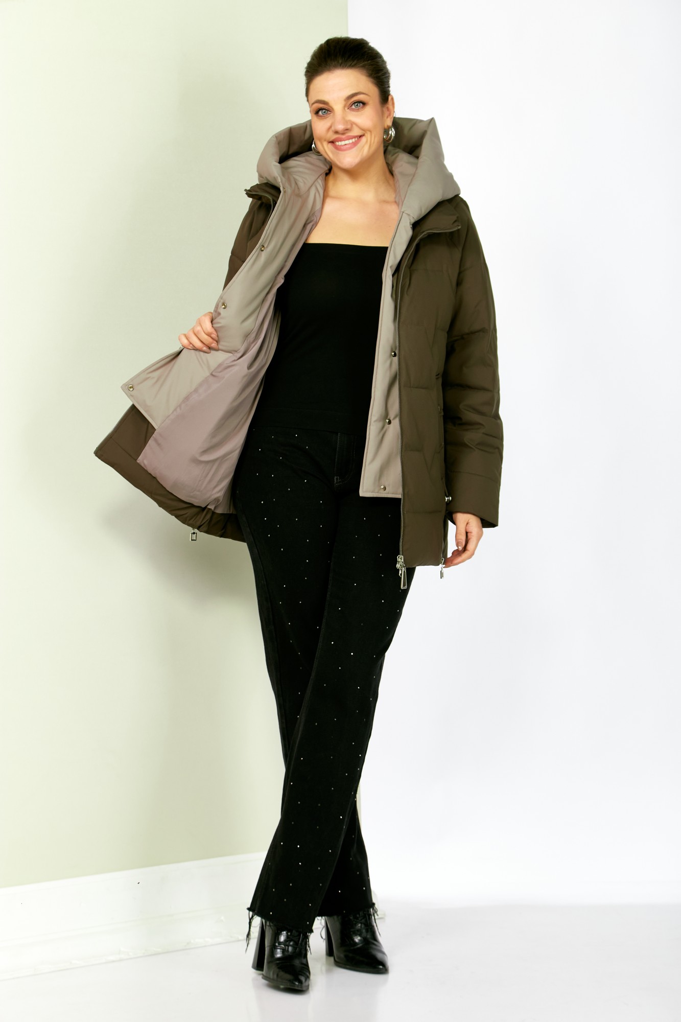 Капюшон не съемный. Спинка цельная. По низу боковых швов декоративная молния (действующая). Для защиты от ветра и мороза, рукава по низу дополнены внутренними трикотажными манжетами.