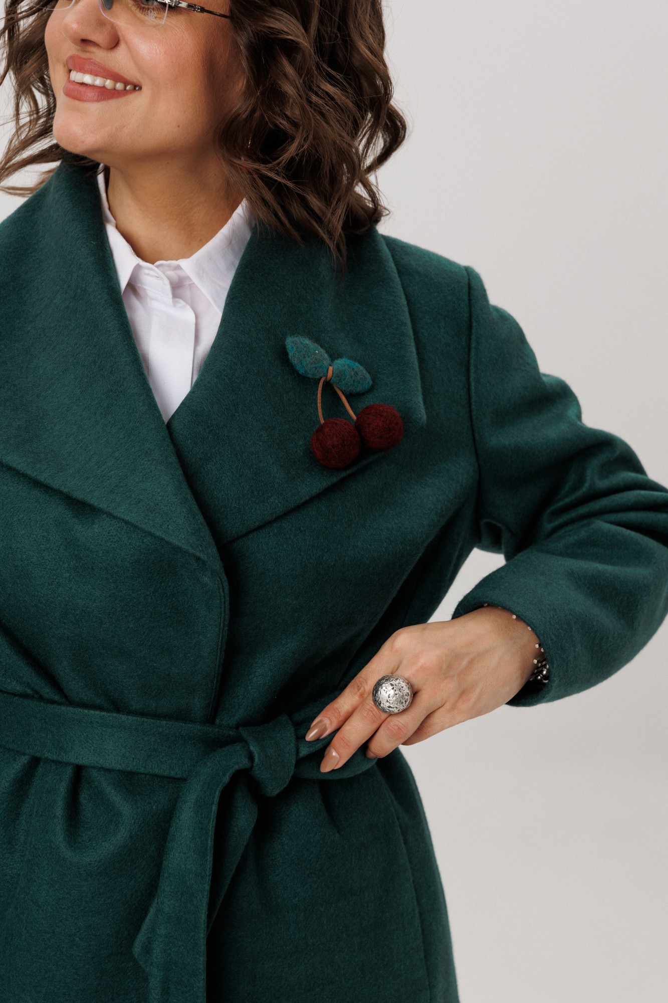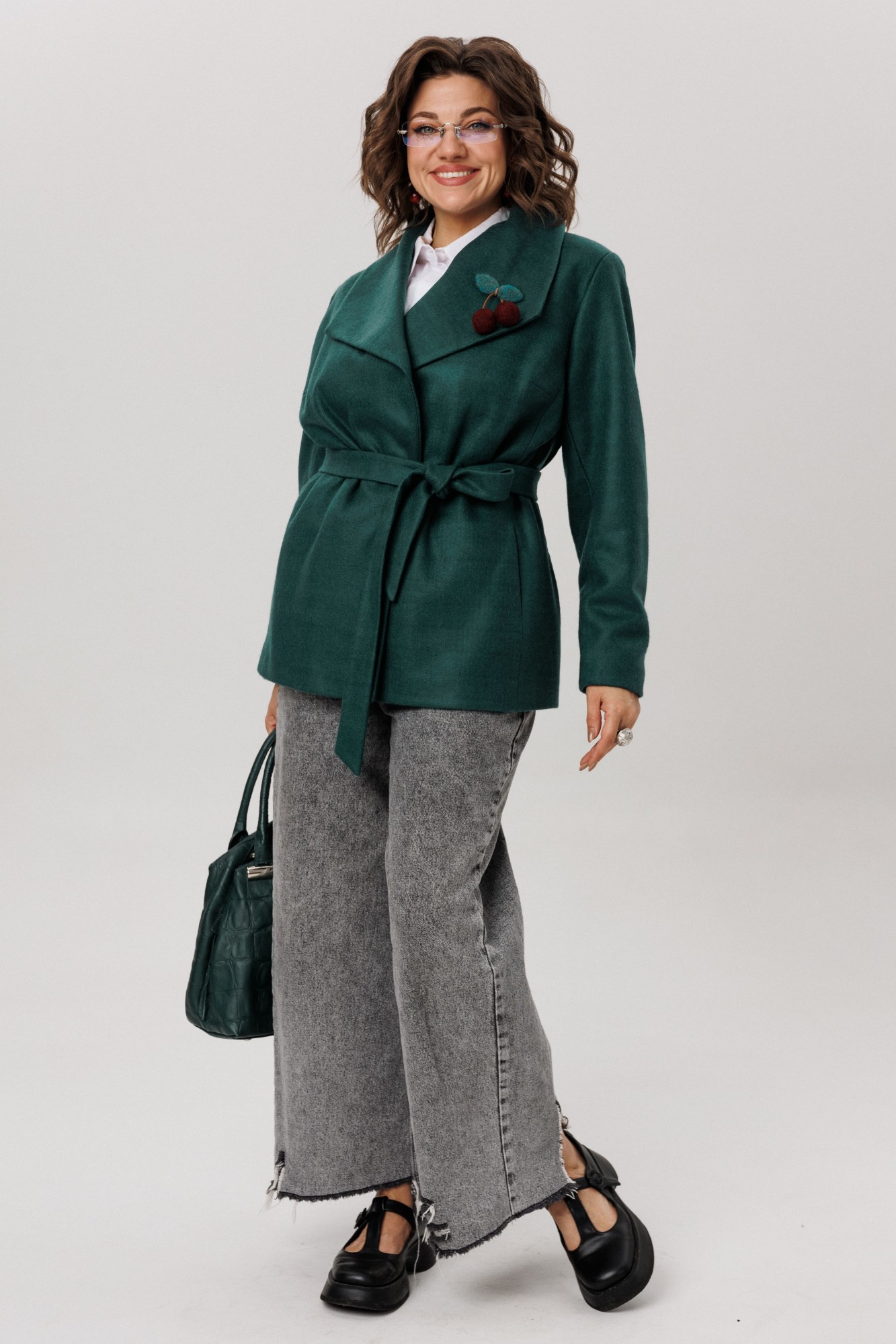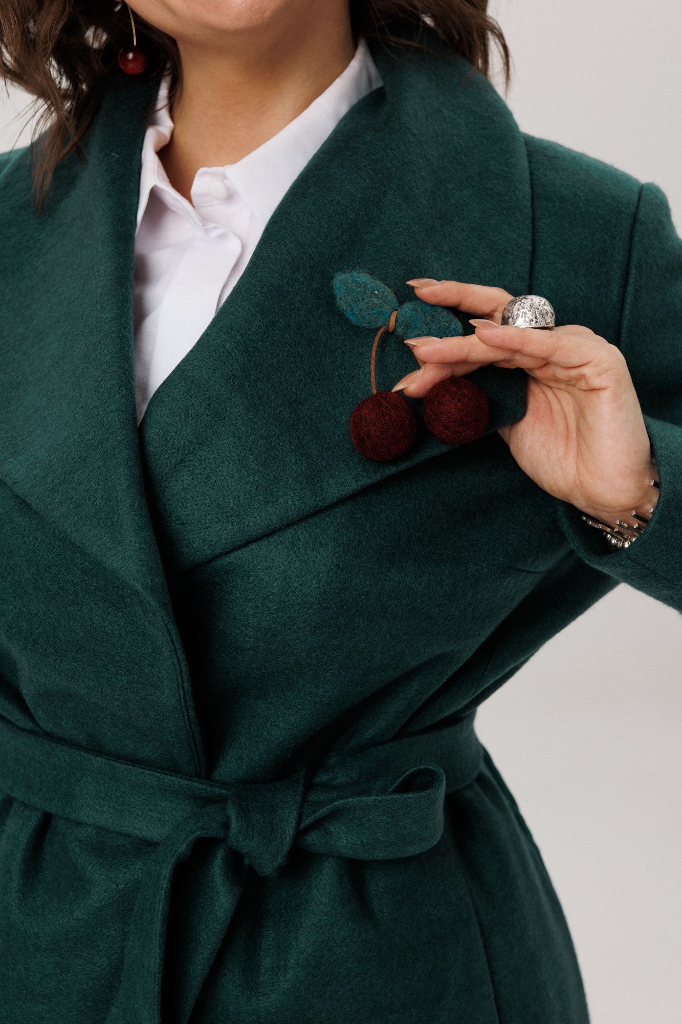 Неожиданным и очаровательным акцентом становится отделка на спинке, выполненная из курточной ткани. Однако главной душой жакета, становится брошь хэнд мэйд в виде вишен. Каждая ягодка хранит в себе частичку тепла и внимания, превращая эту вещь из просто одежды в уникальное произведение, притягивающее восхищенные взгляды.