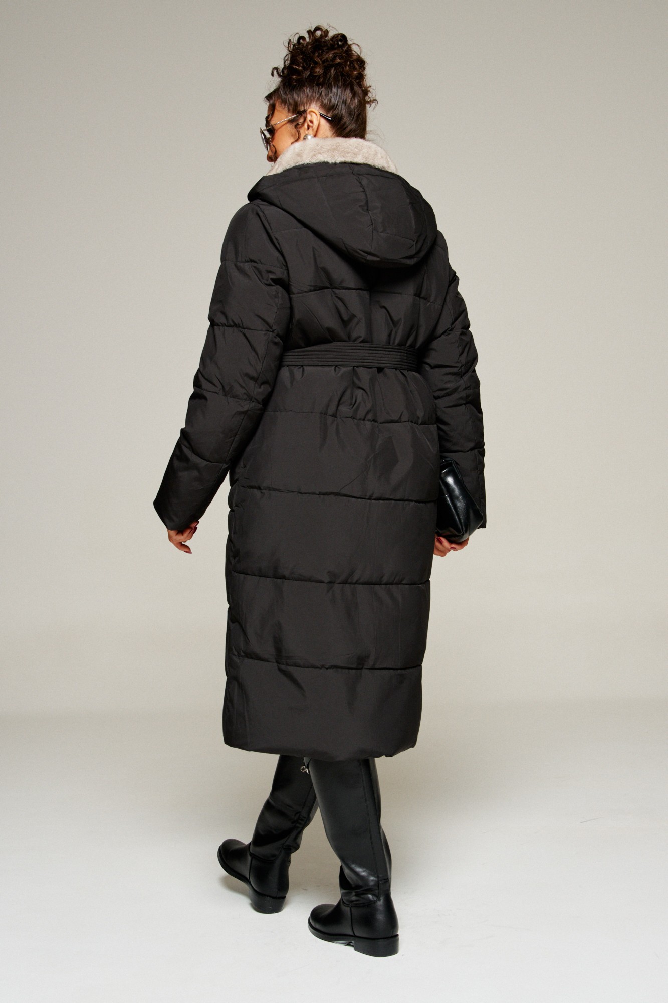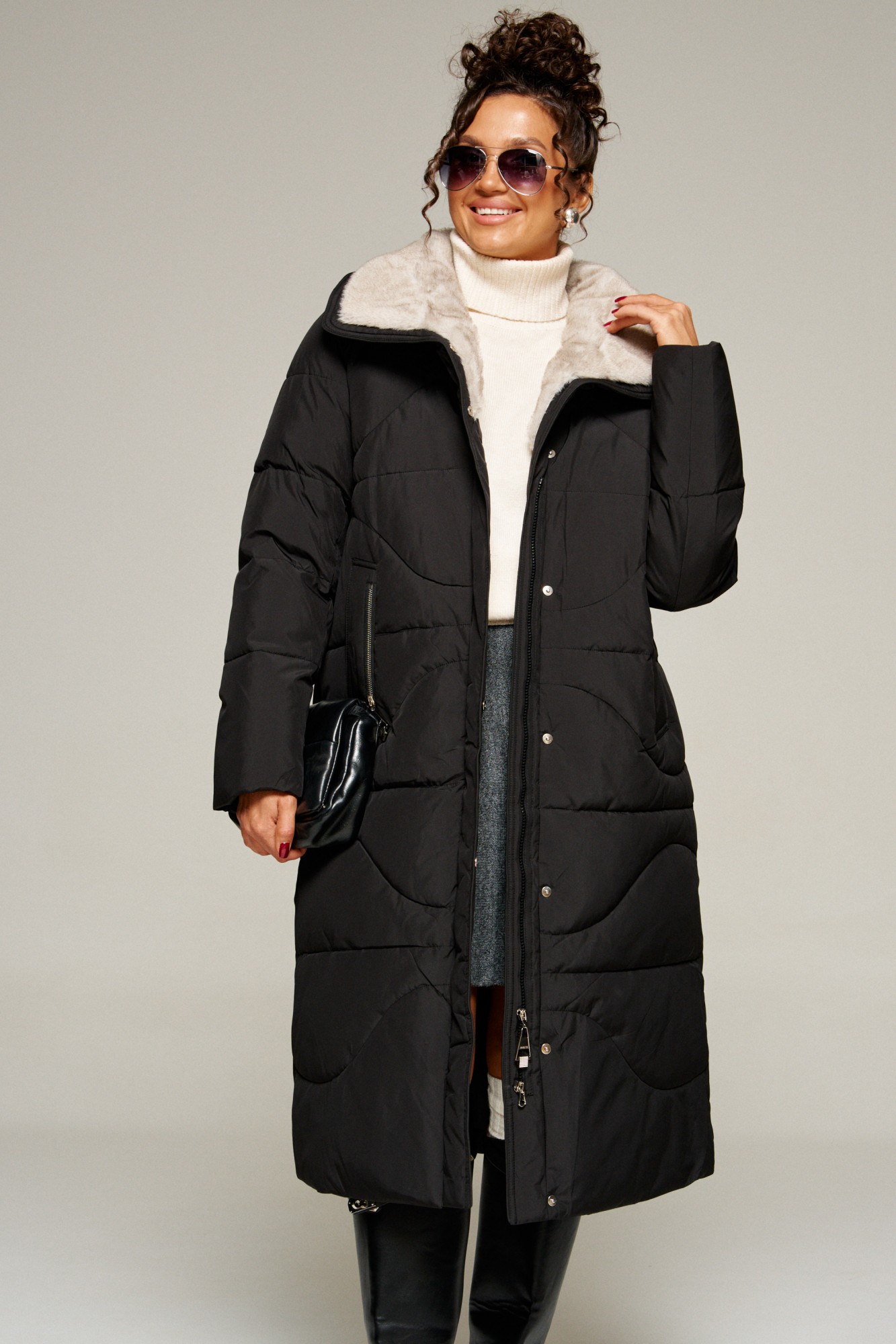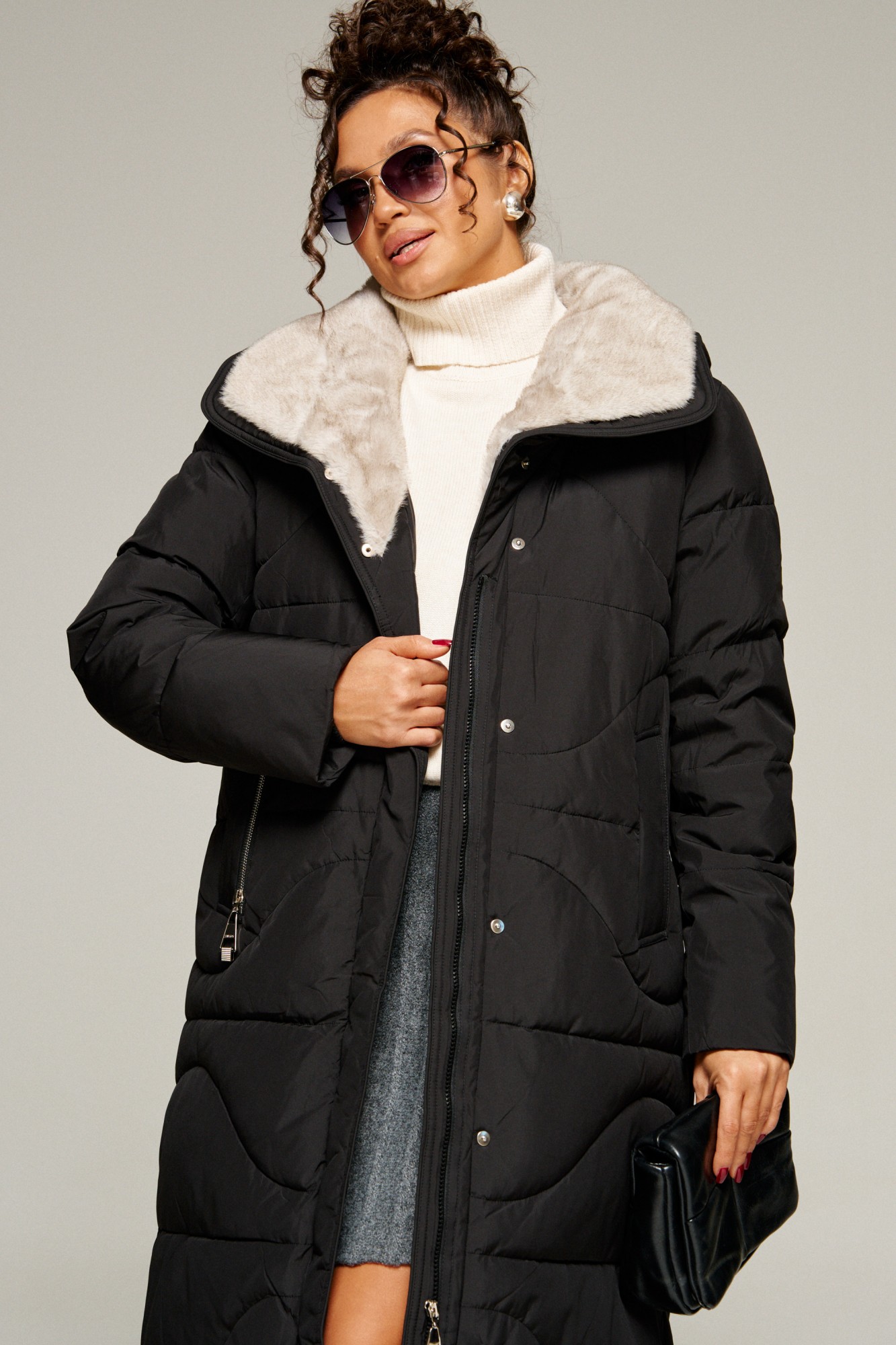 Воротник тип «апаш» с возможностью застегивания до верха. Внутренняя часть воротника обработана искусственным мехом «норка».