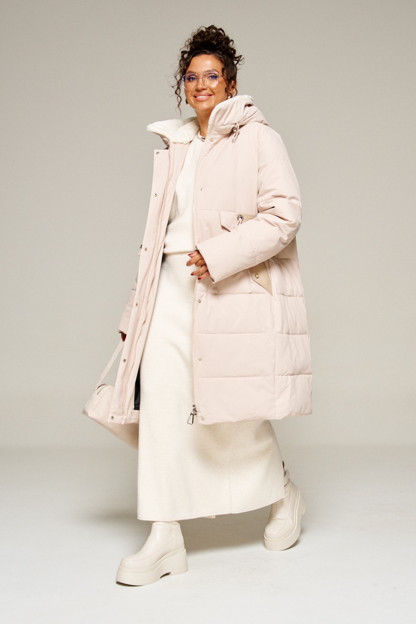 Капюшон с застежкой спереди умеренного объема. Внутренняя часть капюшона выполнена из искусственного меха, который выполняет декоративную и защитную функции, создавая дополнительное тепло и защиту от ветра и холода.