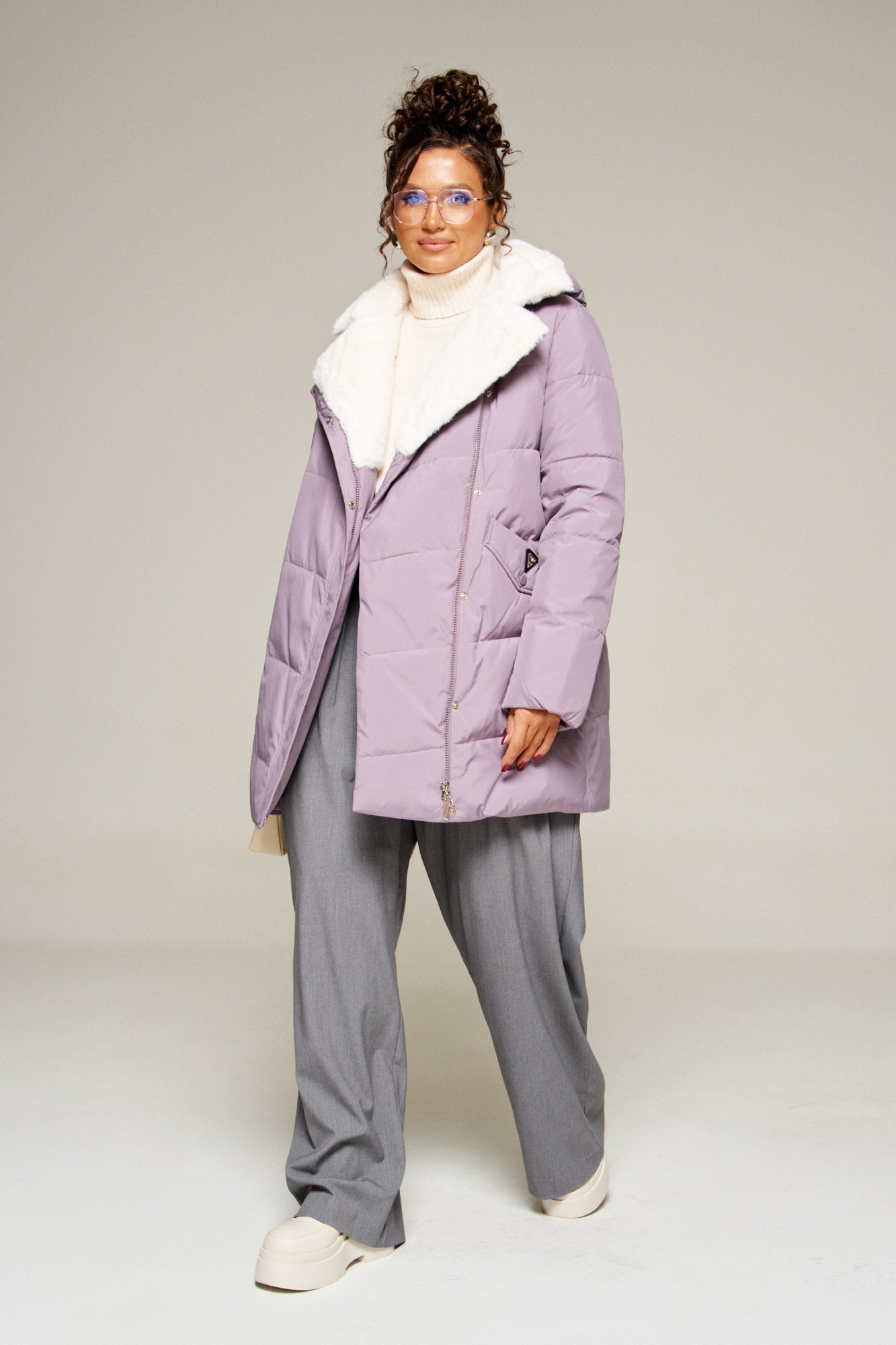 Воротник пиджачного типа с возможностью застегивания до верха. Внутренняя часть воротника и лацканы обработаны искусственным мехом.