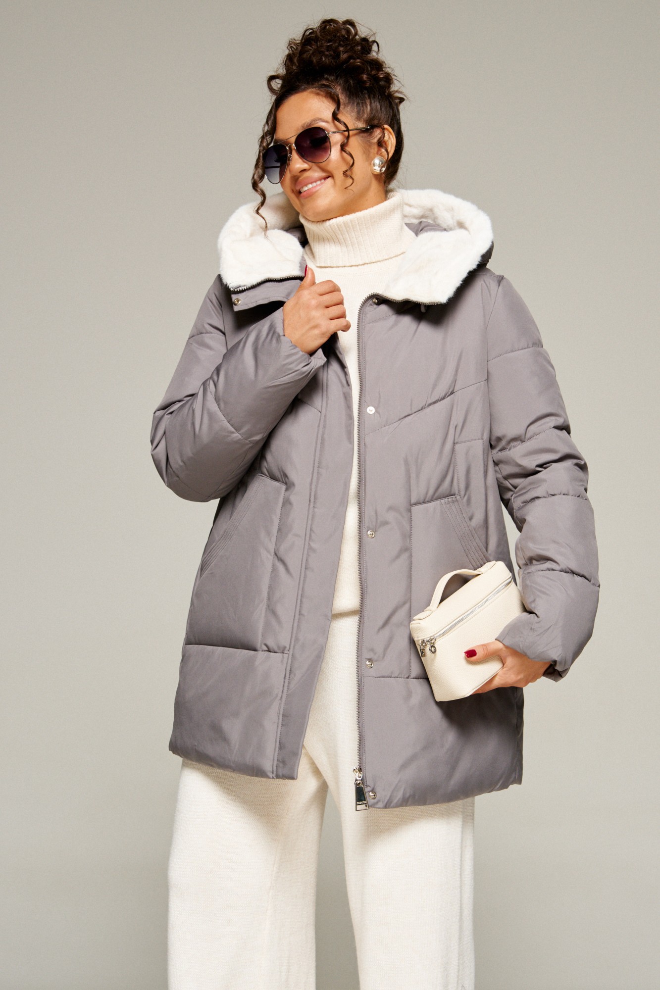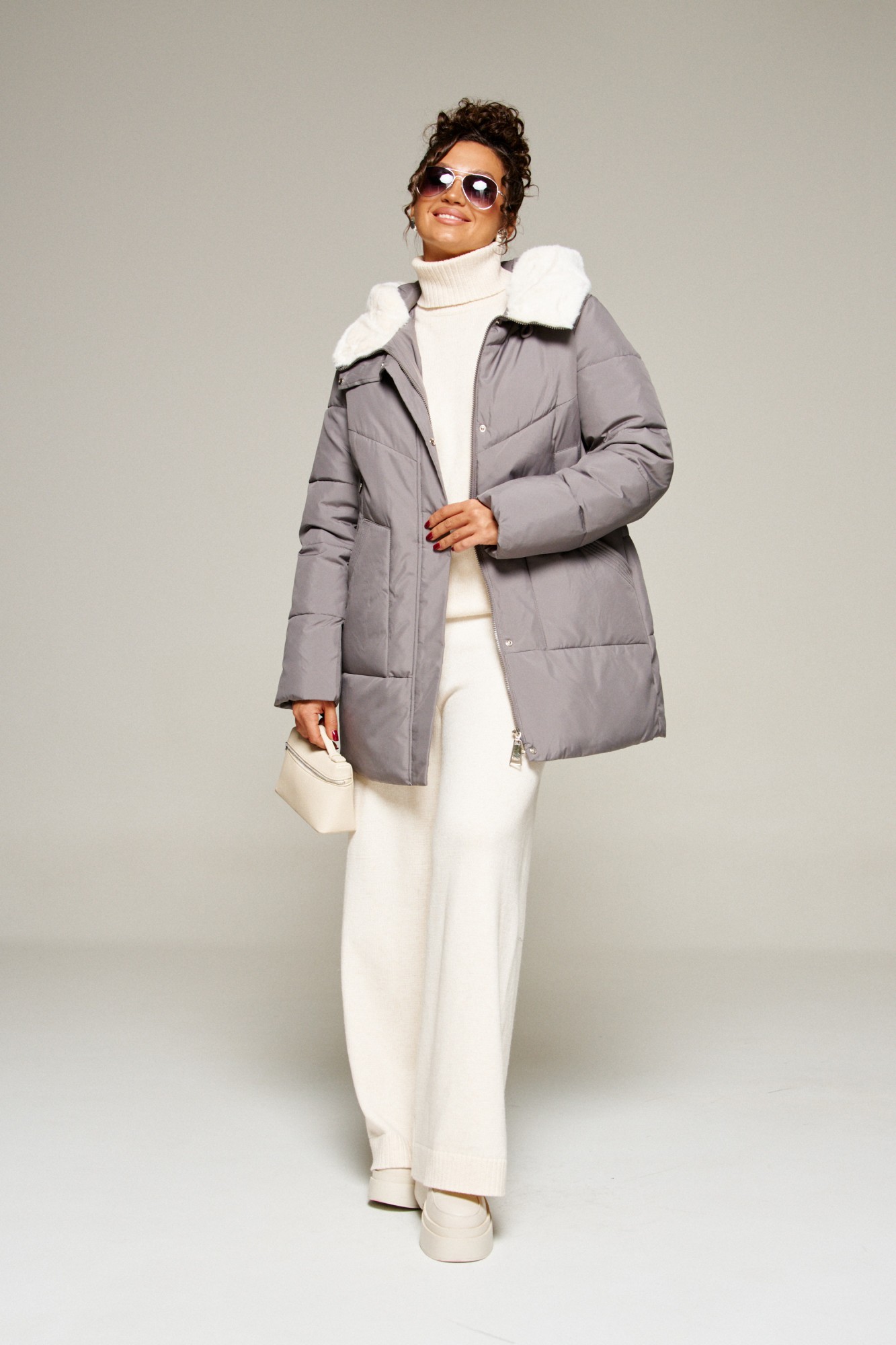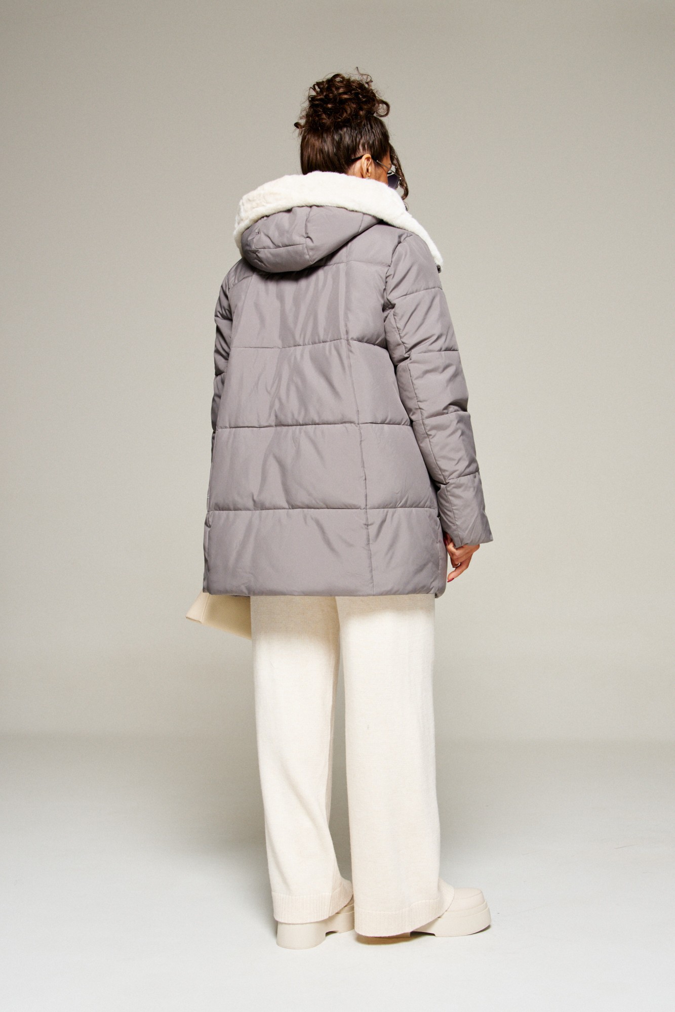 Капюшон с застежкой спереди умеренного объема. По периметру капюшона с внутренней стороны выполнена оторочка из искусственного меха, которая выполняет декоративную и защитную функции, создавая дополнительное тепло и защиту от ветра и холода.