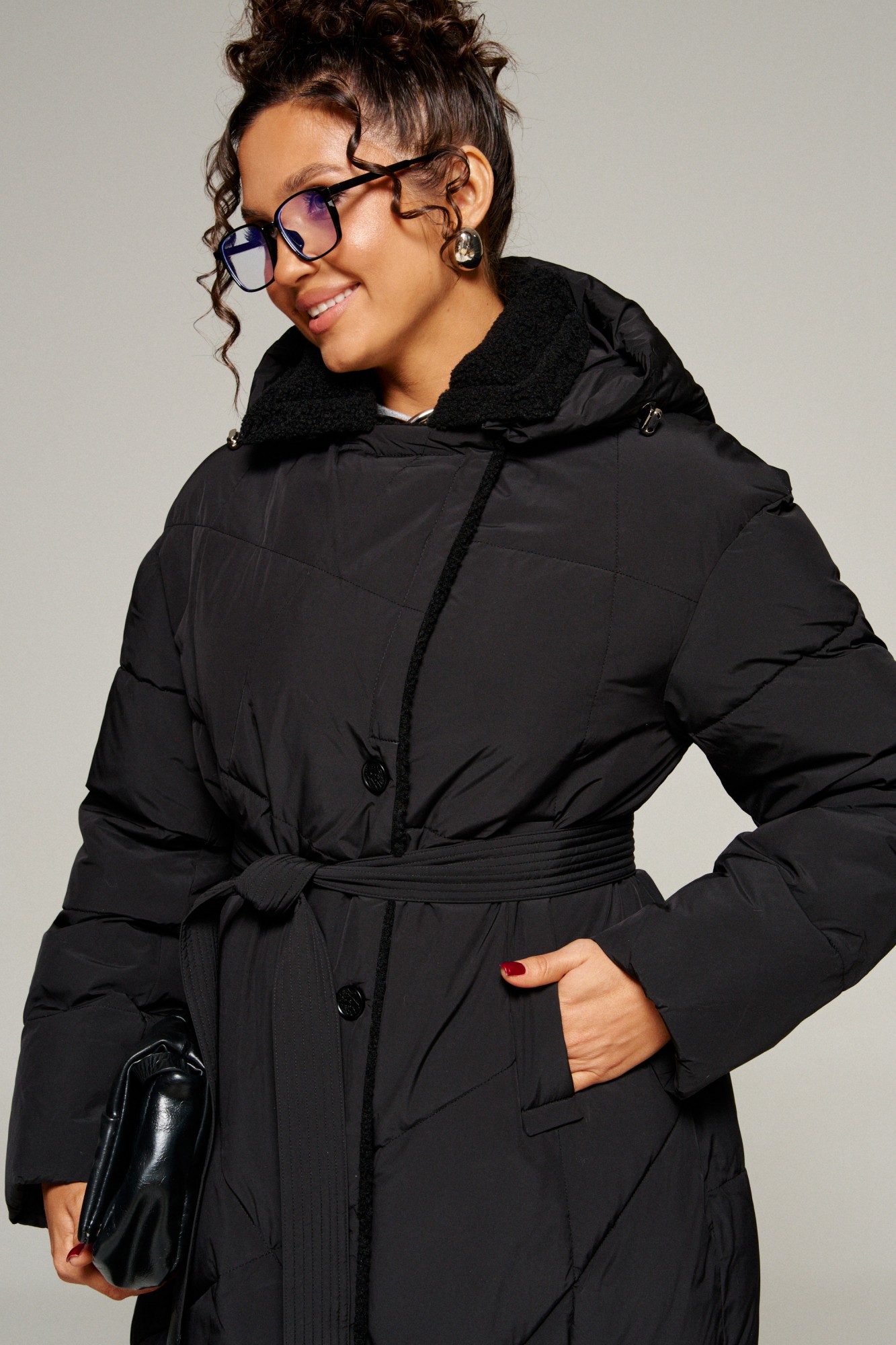 Капюшон съемный (на кнопках) умеренного объема. По периметру капюшона протянут шнур в цвет изделия с декоративными металлическими фиксаторами.