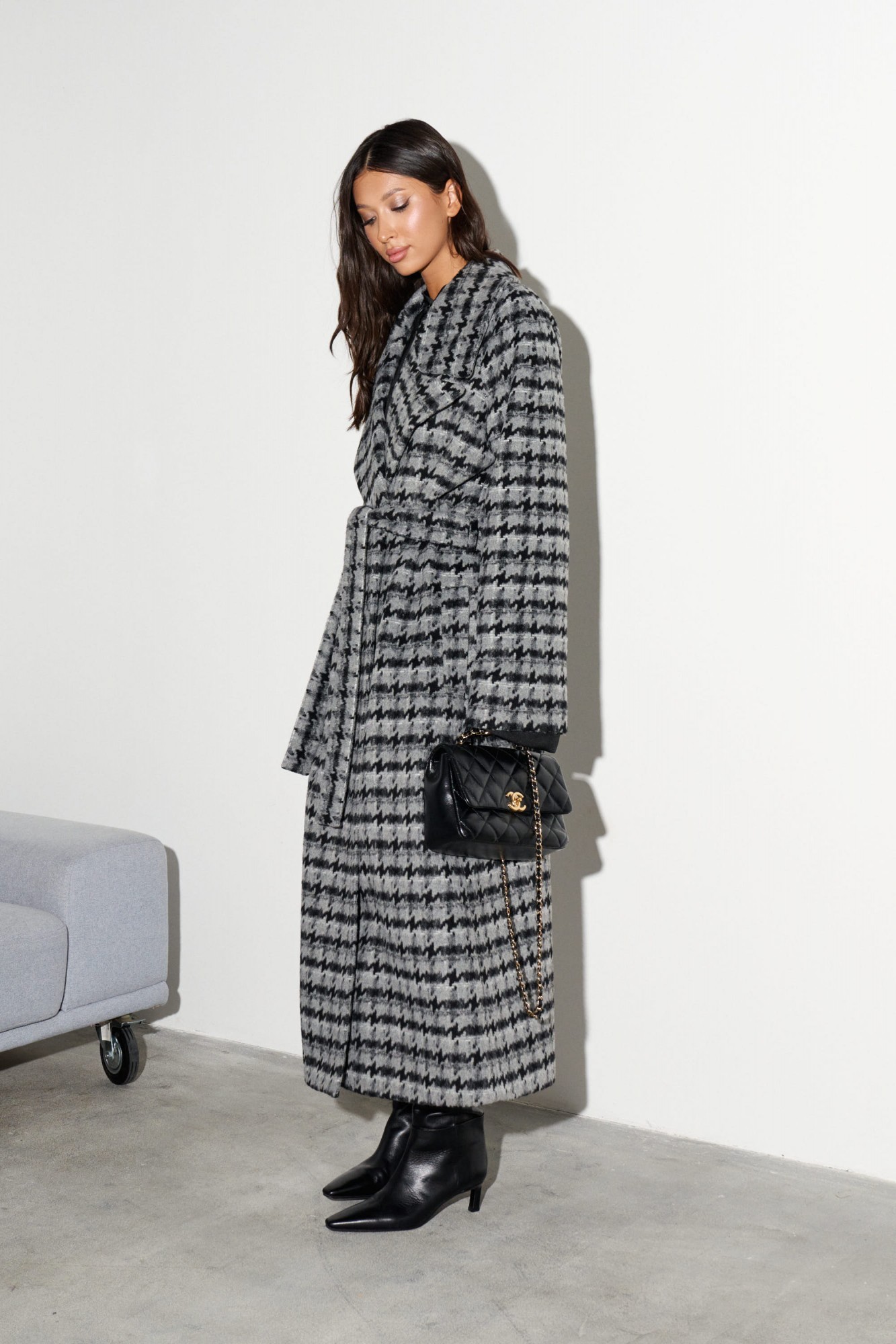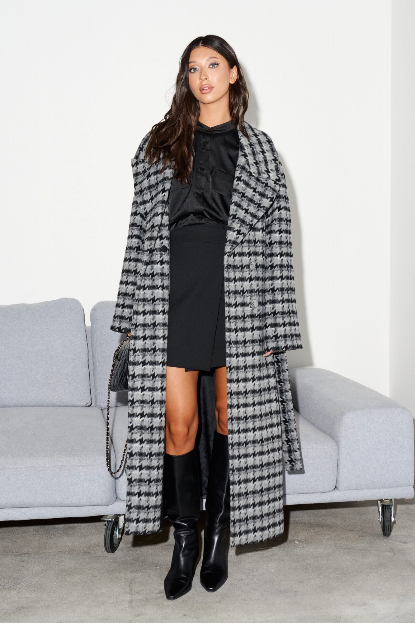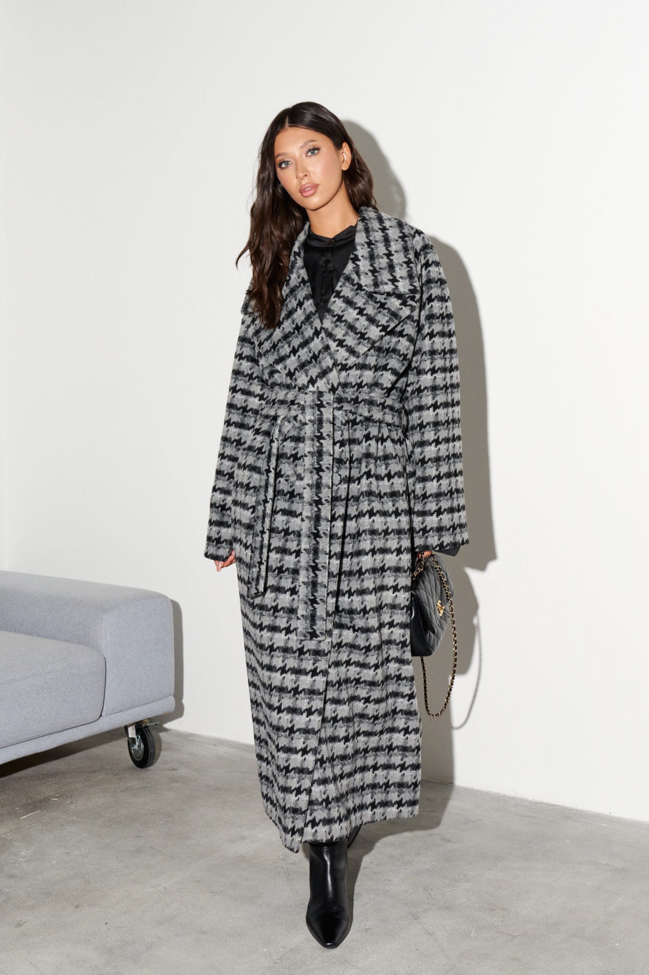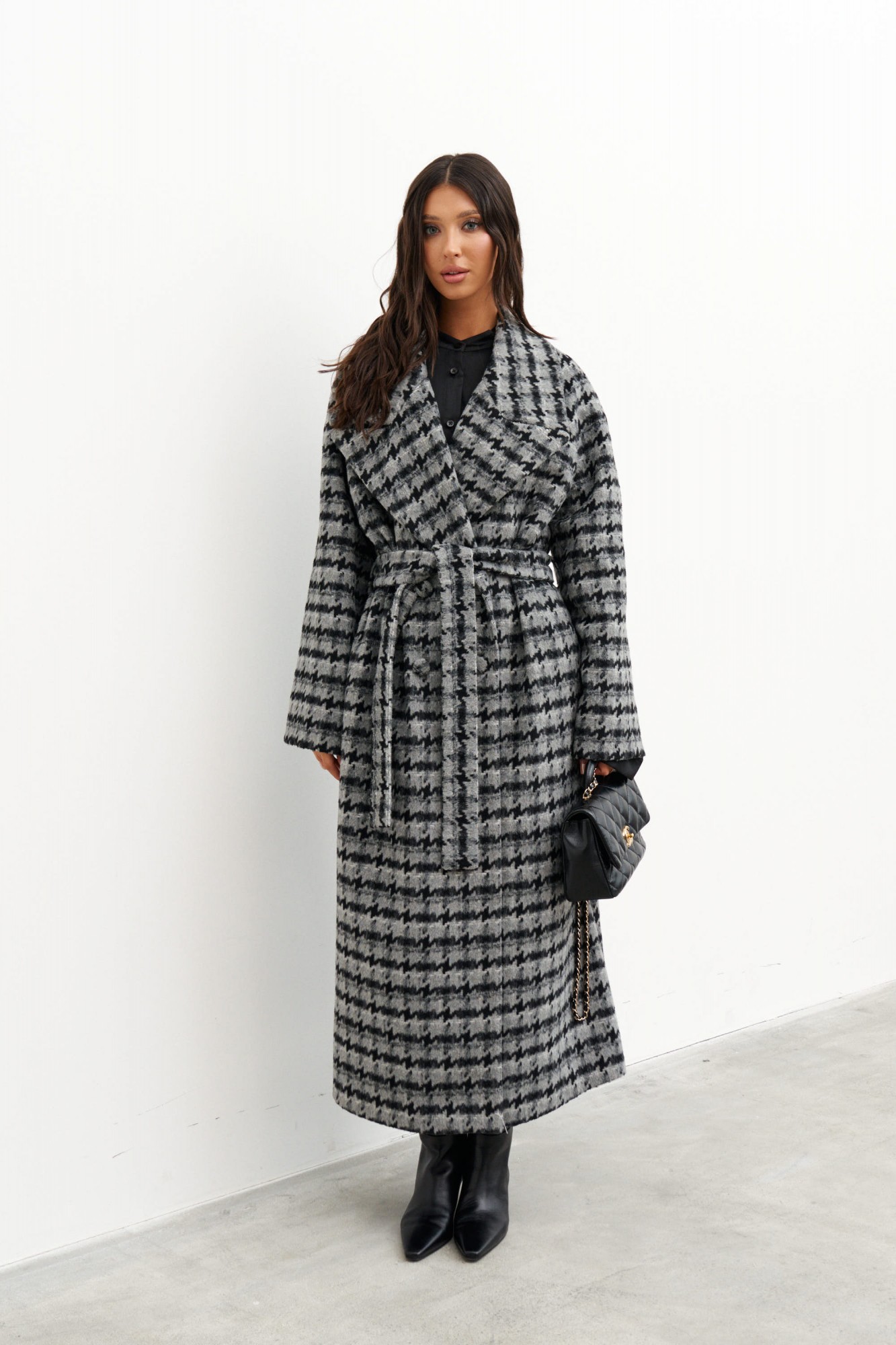 Пальто свободного кроя выполнено из фактурного полотна с принтом "Гусиная лапка". Характеристики: прямой крой, подкладка, крупный воротник с остроугольным лацканом, застежка двубортная на петлю пуговицу, рукав реглан, по переду прорезные карманы, по лини талии нашиты шлевки, в комплекте пояс из ткани основного изделия, спинка со средним швом, по низу шва разрез 47 см.