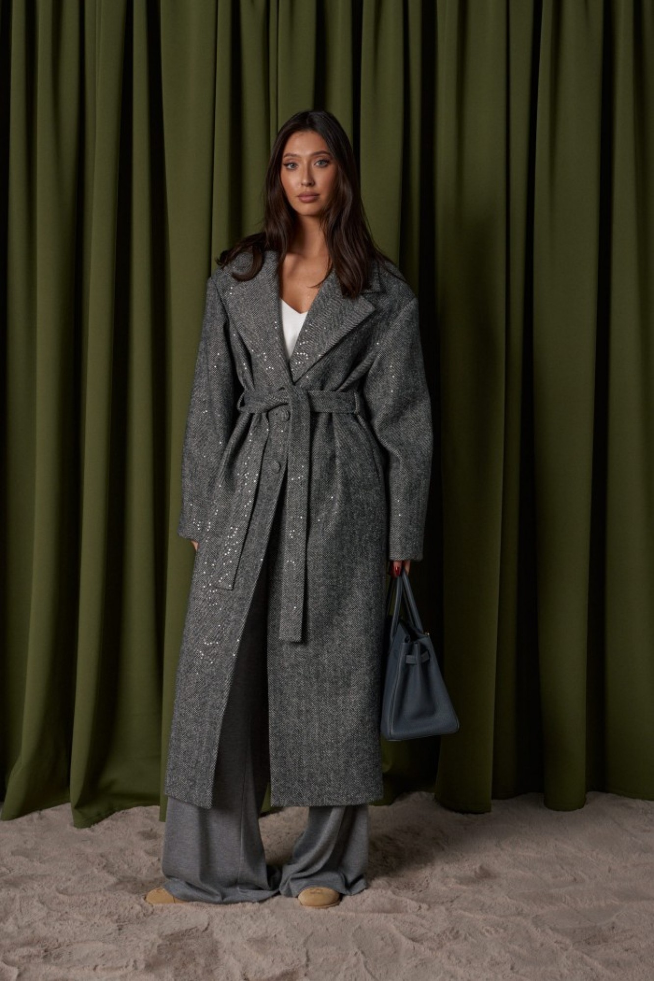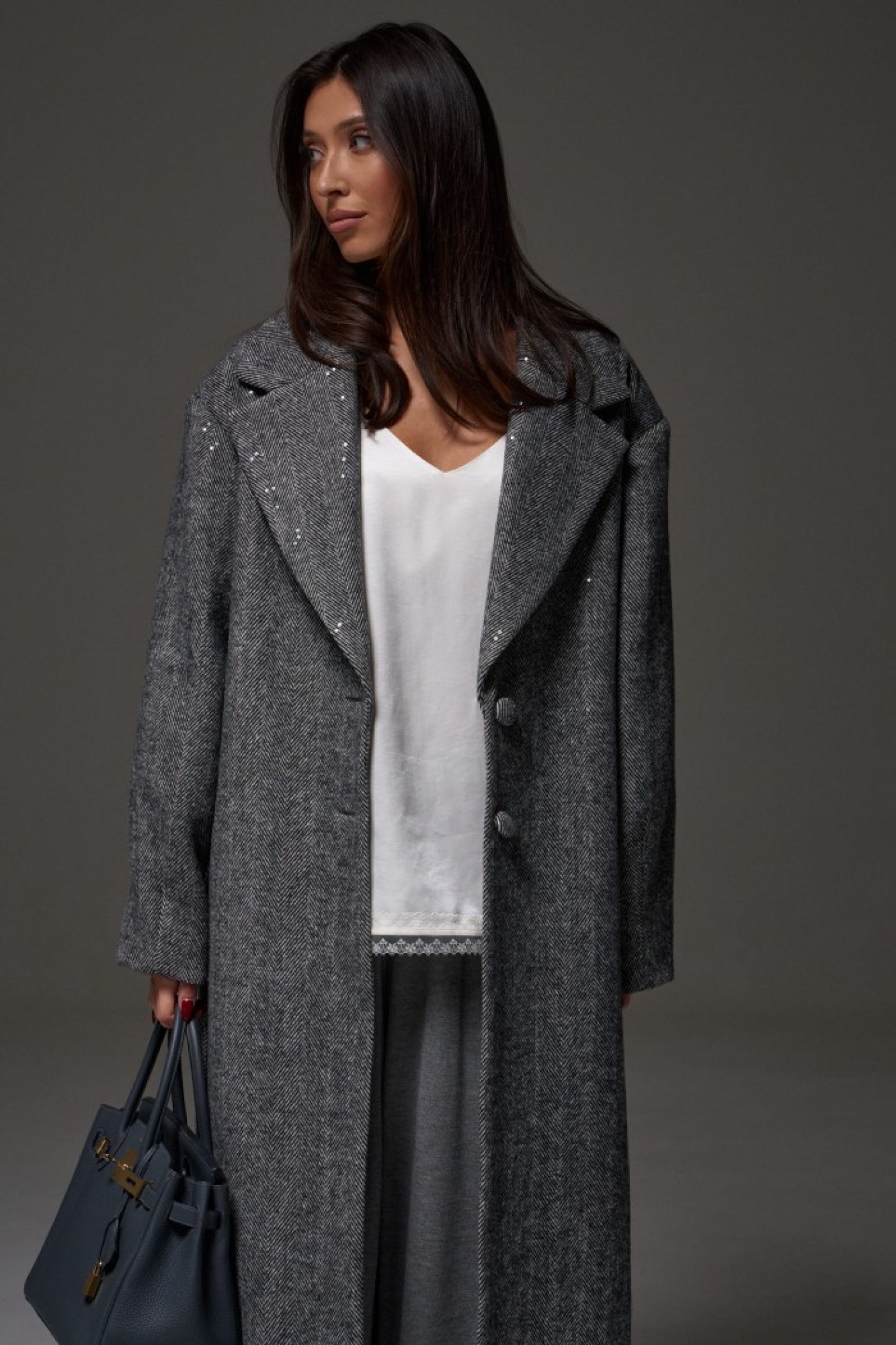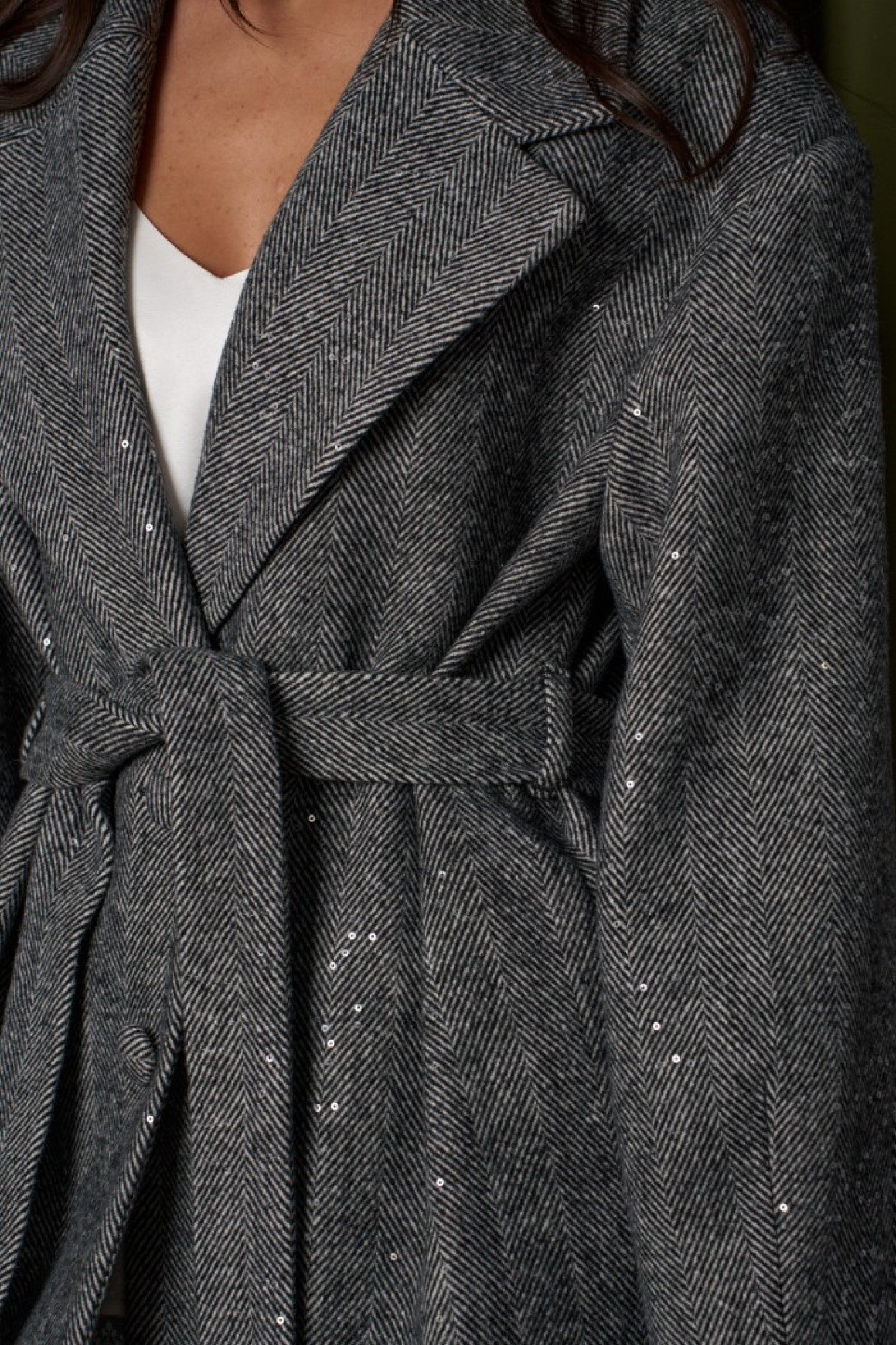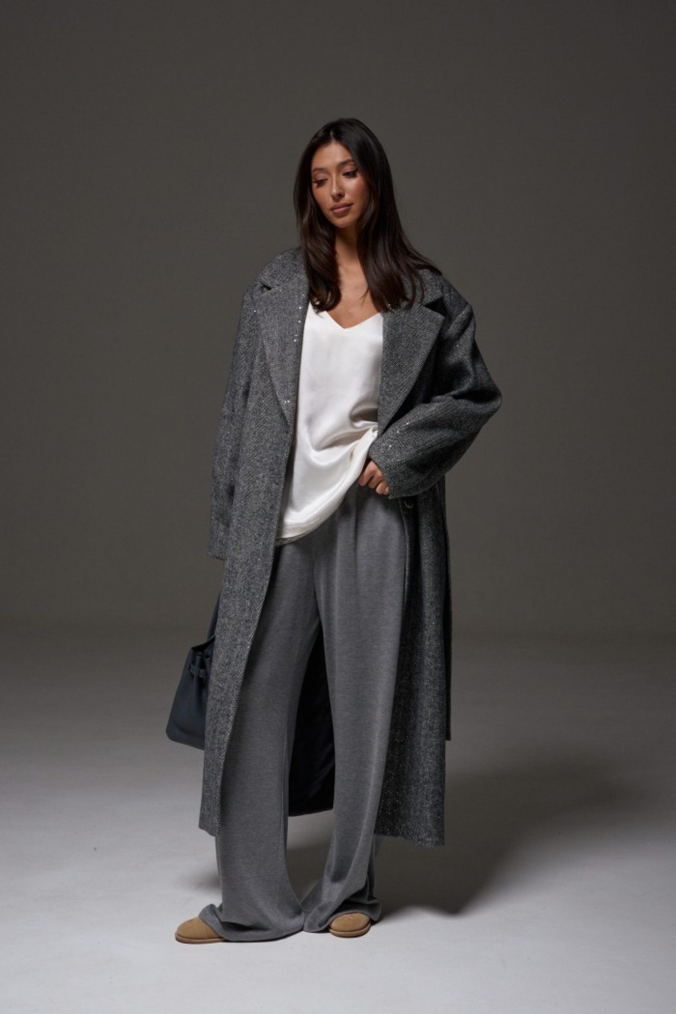 Полупальто прямого кроя, выполнено из шерстяной (смесовой) ткани серого цвета с пайетками. Характеристики: на брендированной подкладке, рукав втачной, к низу заужен, воротник пиджачного типа, в боковых швах карманы. Спинка со средним швом заканчивается шпицей, застёжка центральная на петли и пуговицы, пояс выполнен из основной ткани изделия.
