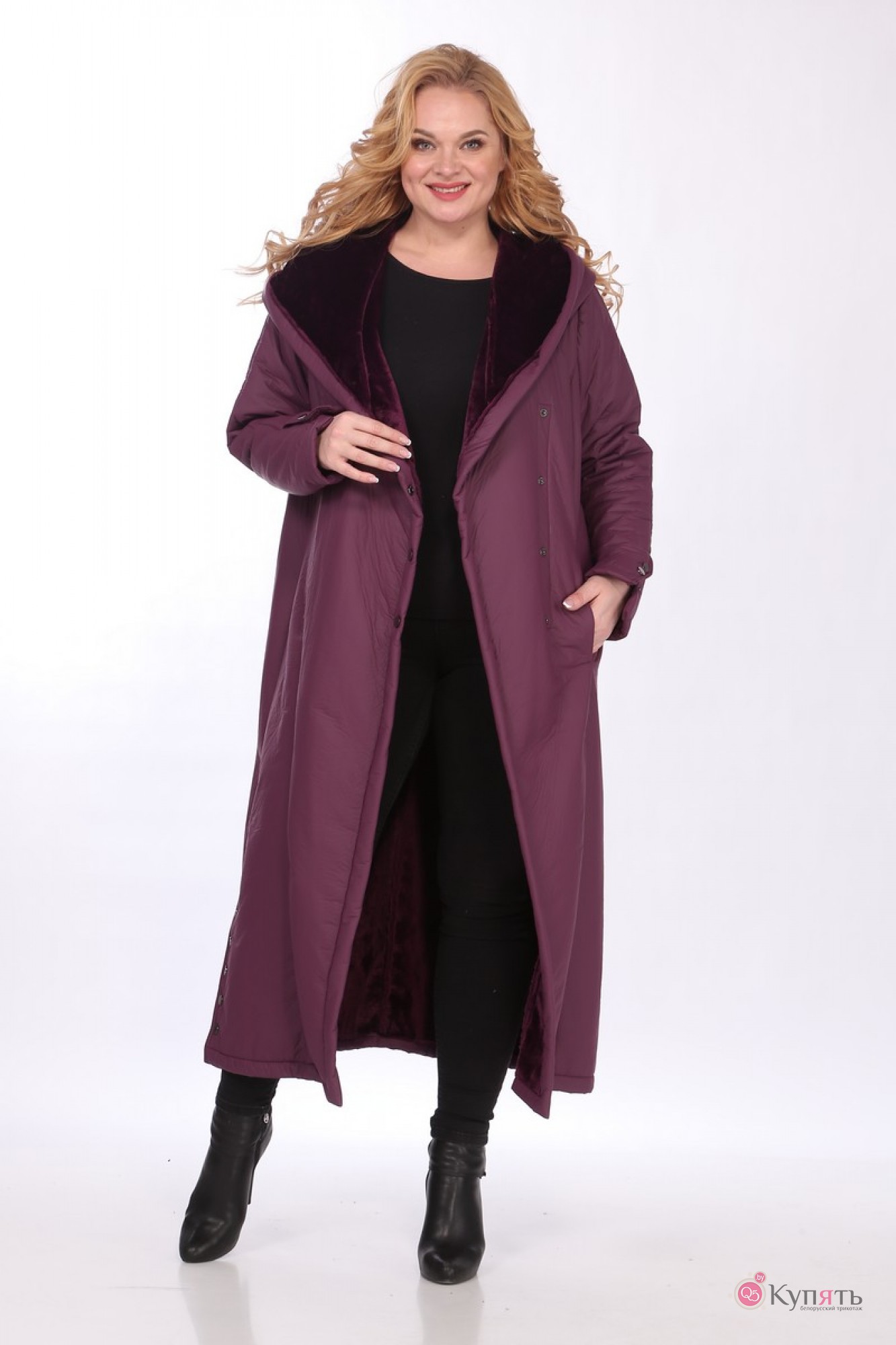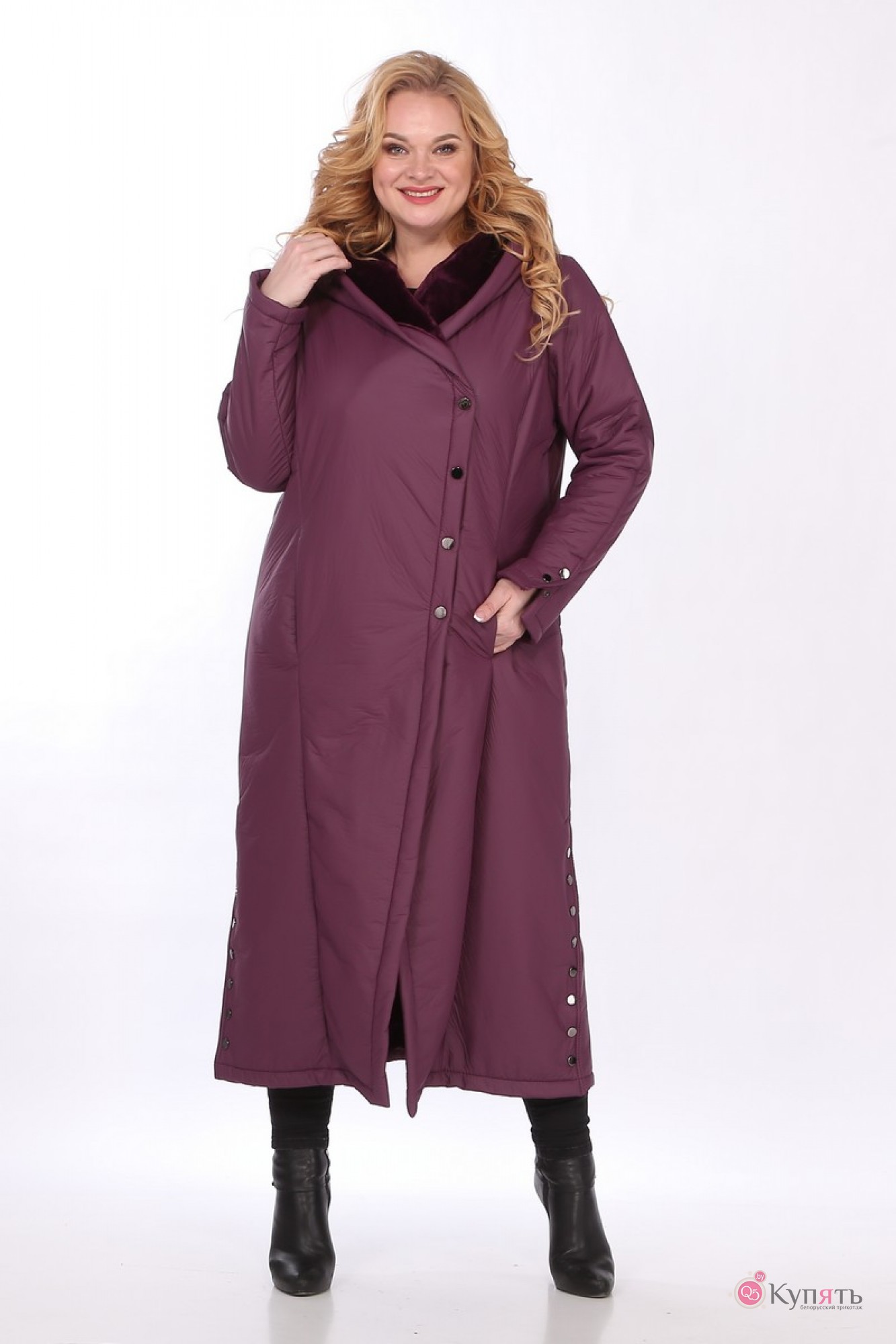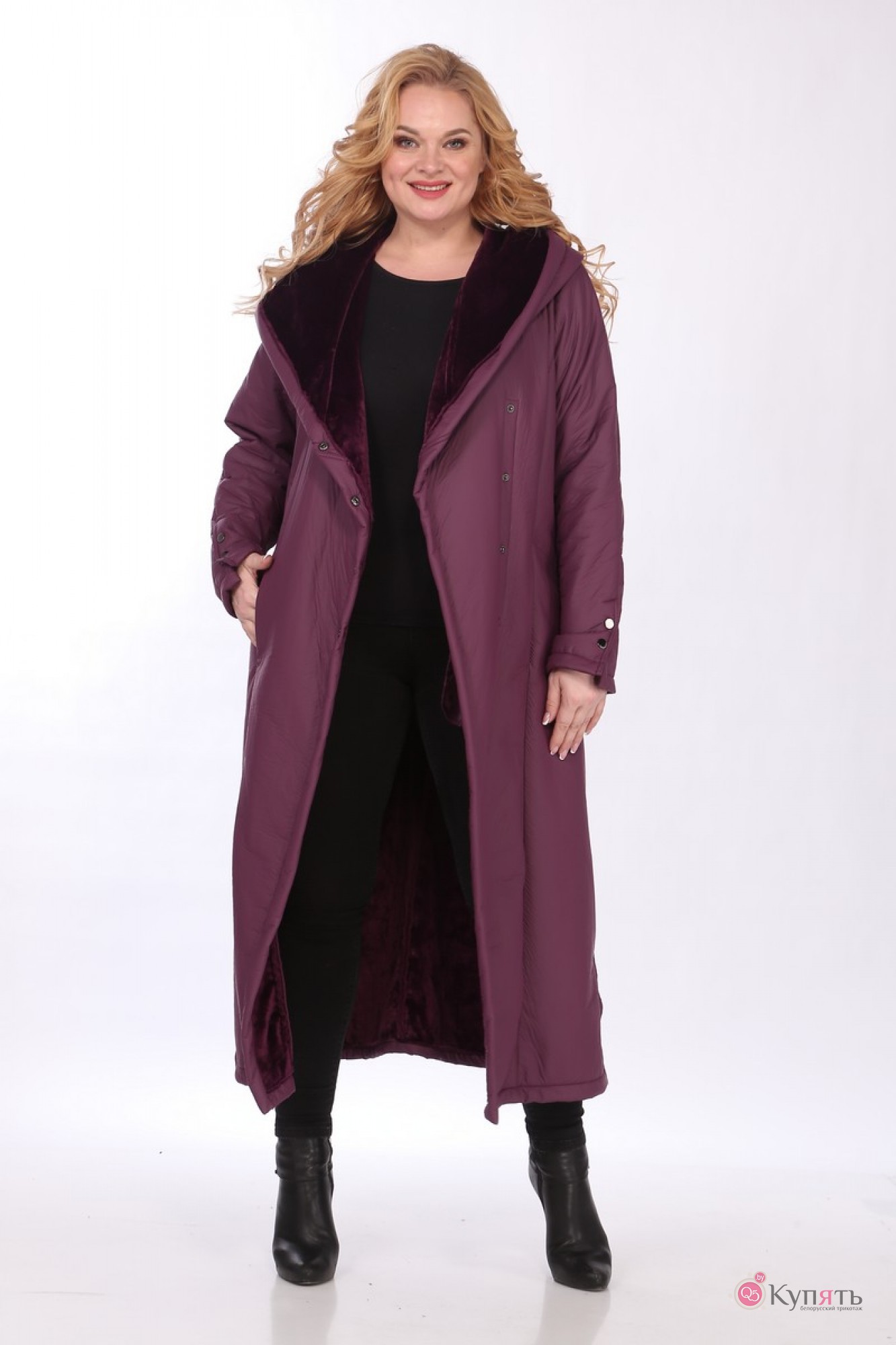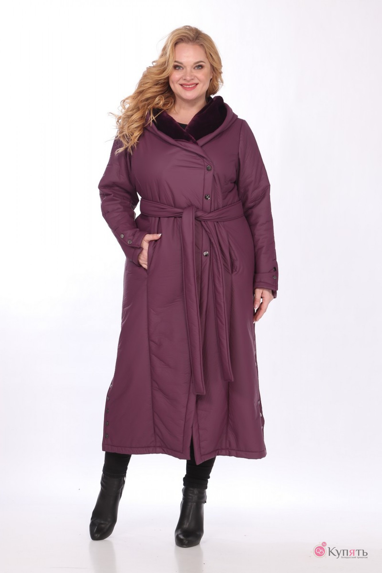 Пальто женское длинное из плащевой ткани. Полочка с рельефами, в которых расположены внутренние функциональные карманы. Застежка центральная на косую на 4 кнопки. Капюшон втачной. Спинка с центральным швом. Рукав втачной одношовный. В боковых швах пальто и на рукавах функциональные шлицы на кнопках. В комплекте пояс из основной ткани. Пальто без утеплителя и подкладки, изнанка - экомех. Выполнено из мягкой непромокаемой ткани. Все кнопки на изделии металлические. Примечание: Перед первой примеркой рекомендуется пройти изнанку (мех) изделия липким роликом для чистки одежды.