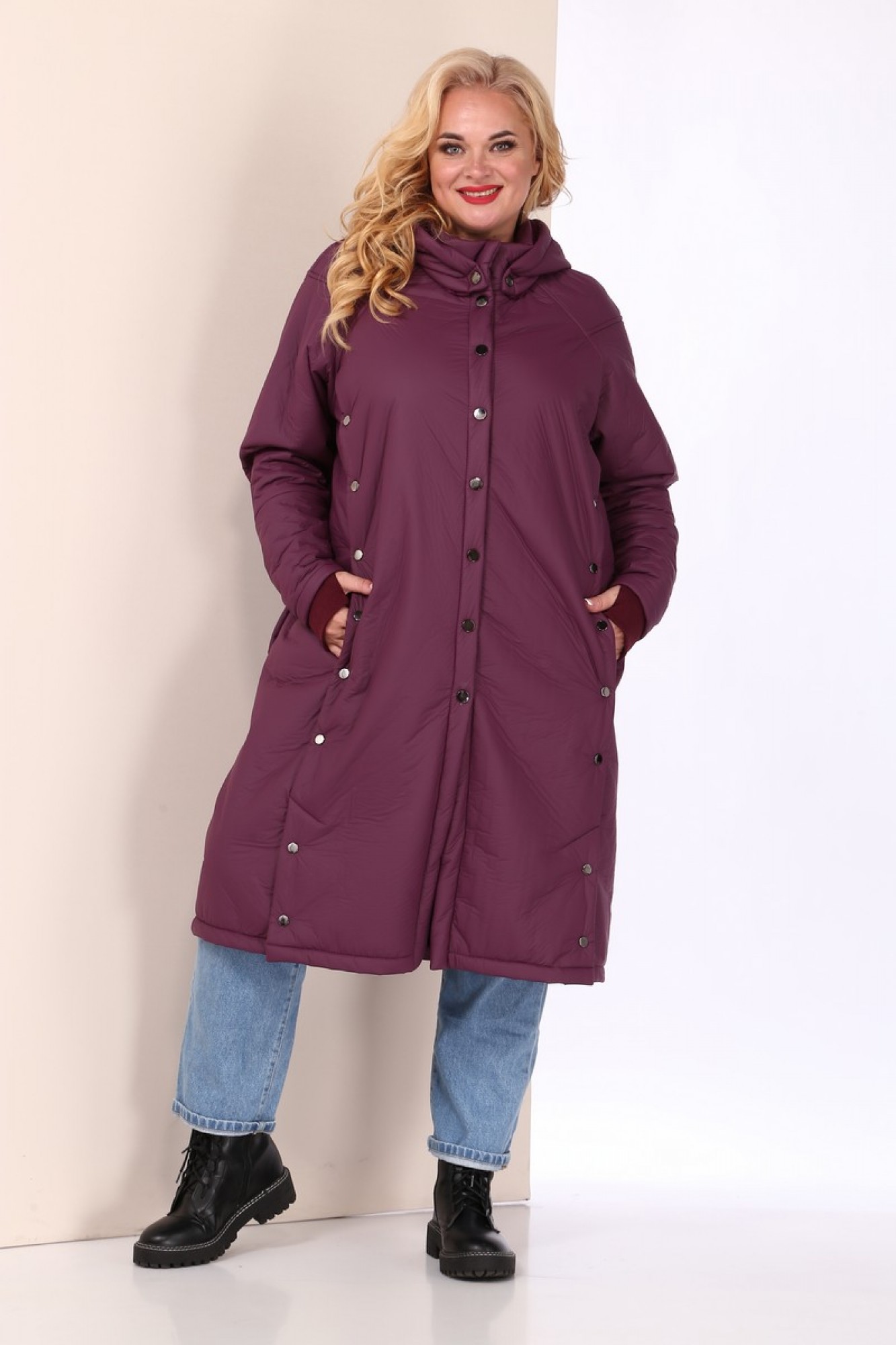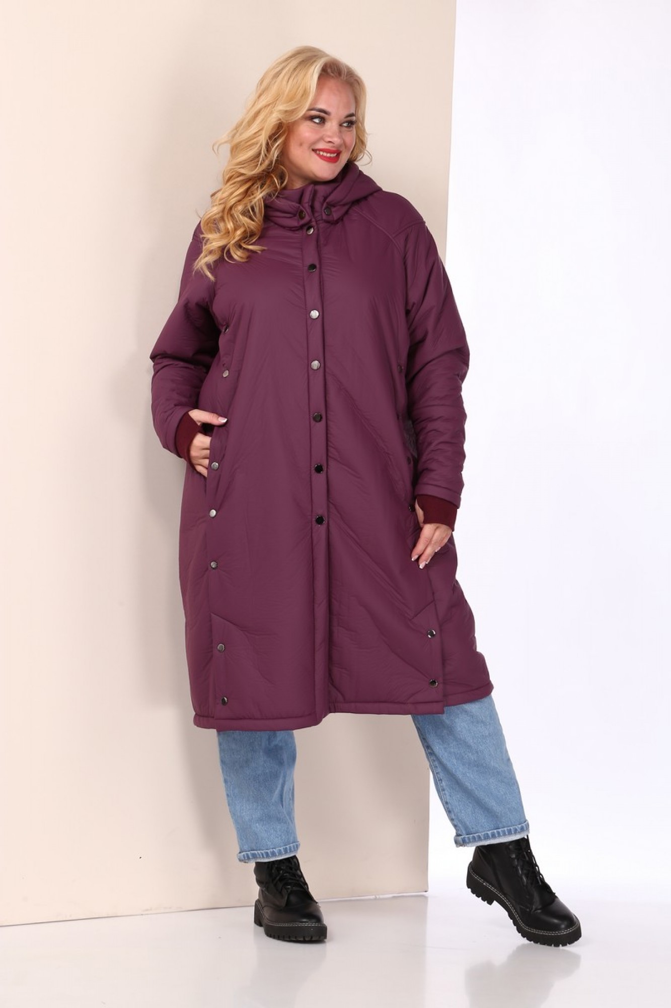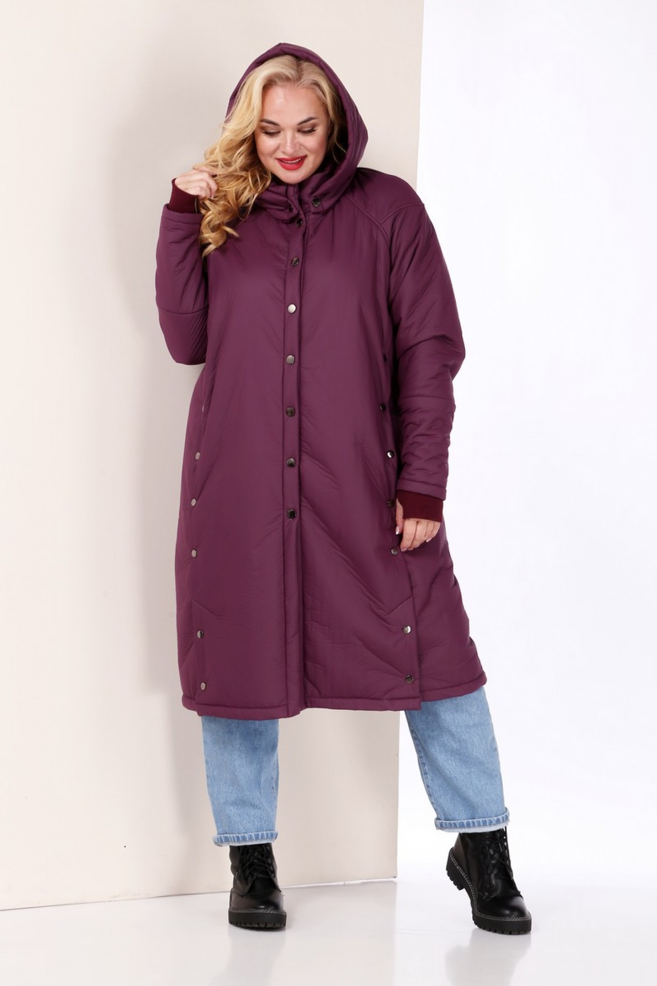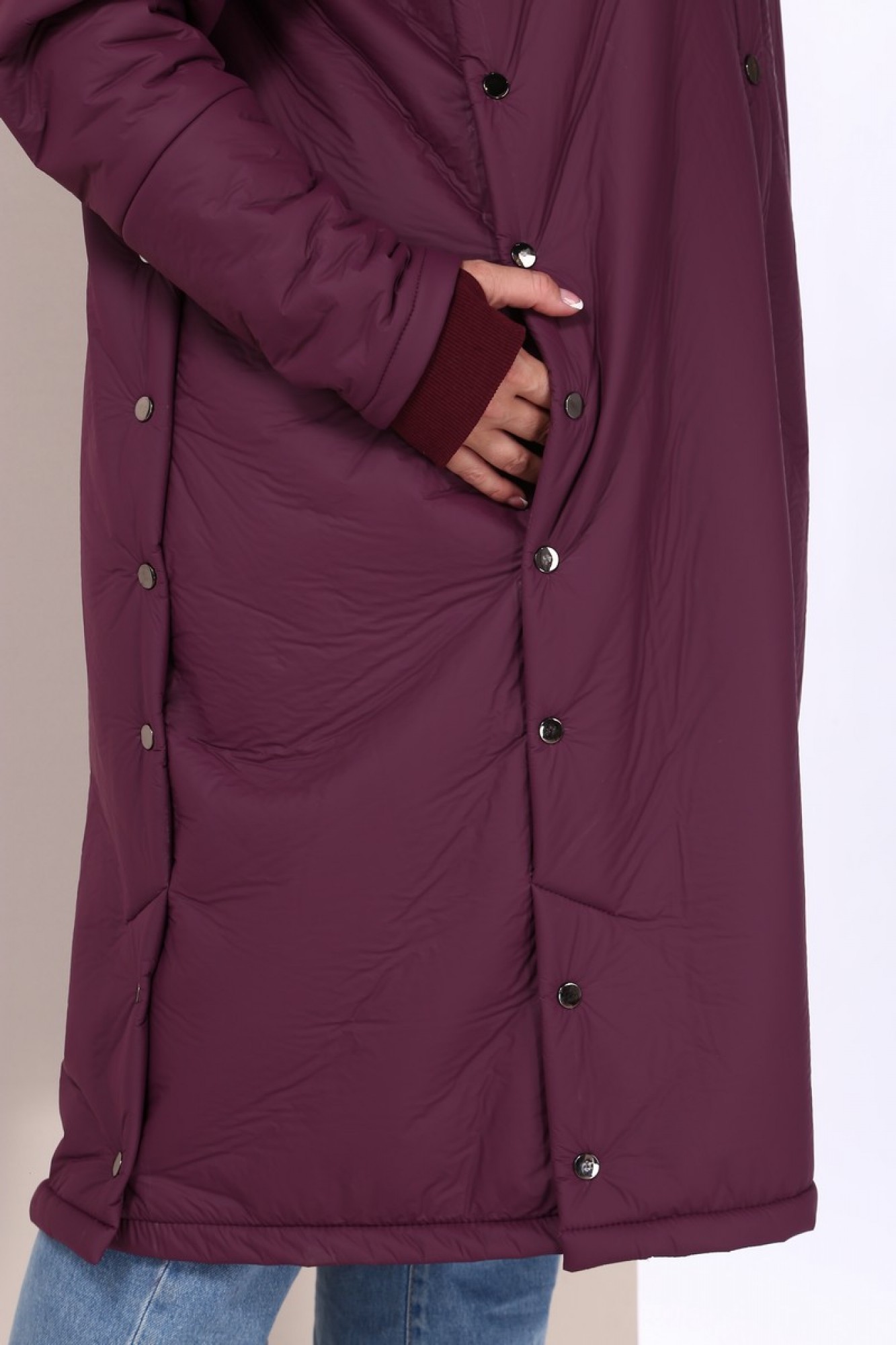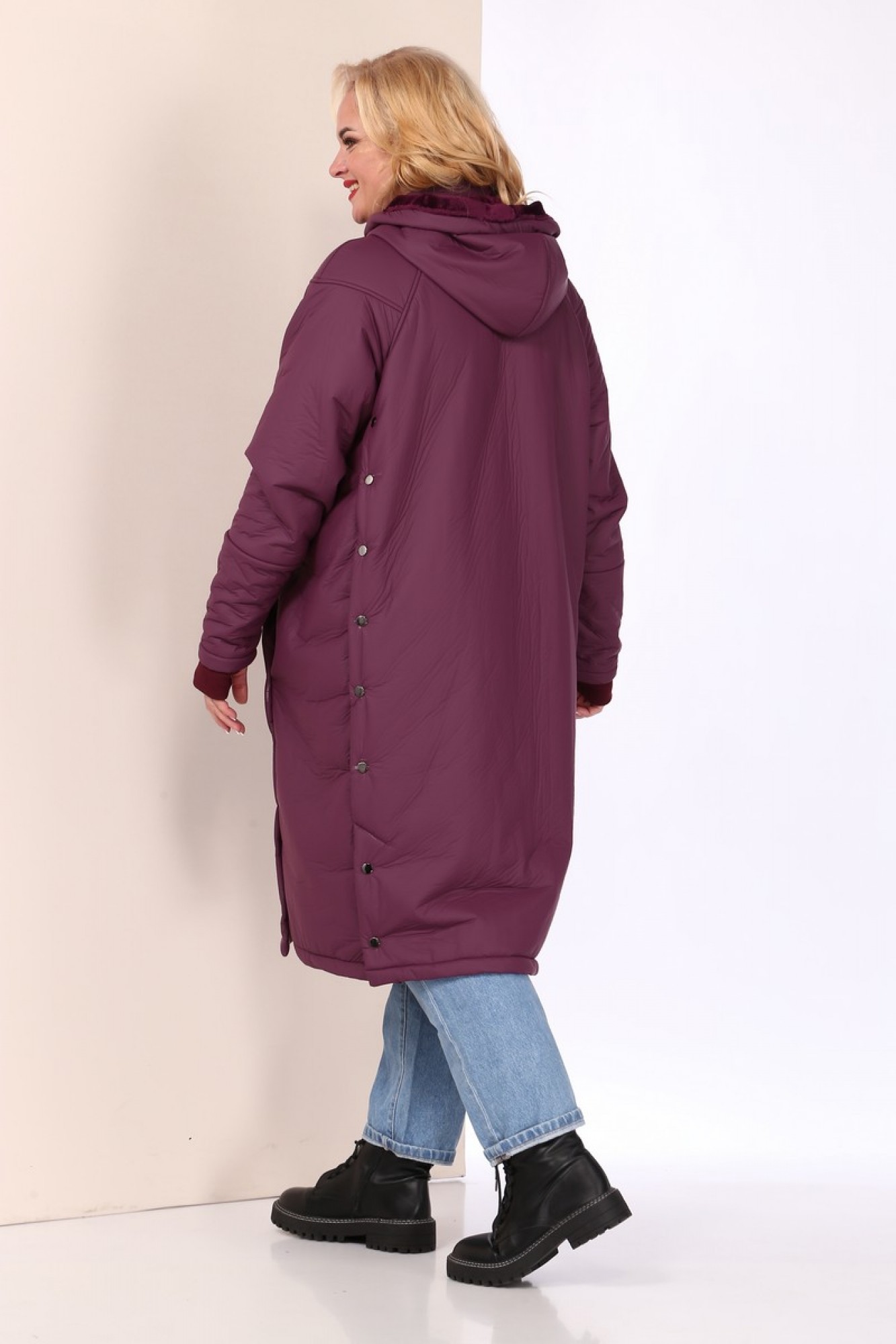 Пальто женское Celentano из плащевой ткани с меховой изнанкой. Воротник - стойка, капюшон на кнопках (отстегивается). Застежка центральная на кнопки. По полочке и спинке обработана встречная складка, закрепленная нефункциональными кнопками. В складке полочки расположены карманы, застегивающиеся на кнопку. Низ складки с функциональной шлицей. Спинка с центральным швом, рукав полуреглан. Снизу рукава имеется довяз, начинающийся с середины предплечья. В шве довяза обработан разрез для большого пальца. Конструкция рукава позволяет произвольно укорачивать рукав пальто.