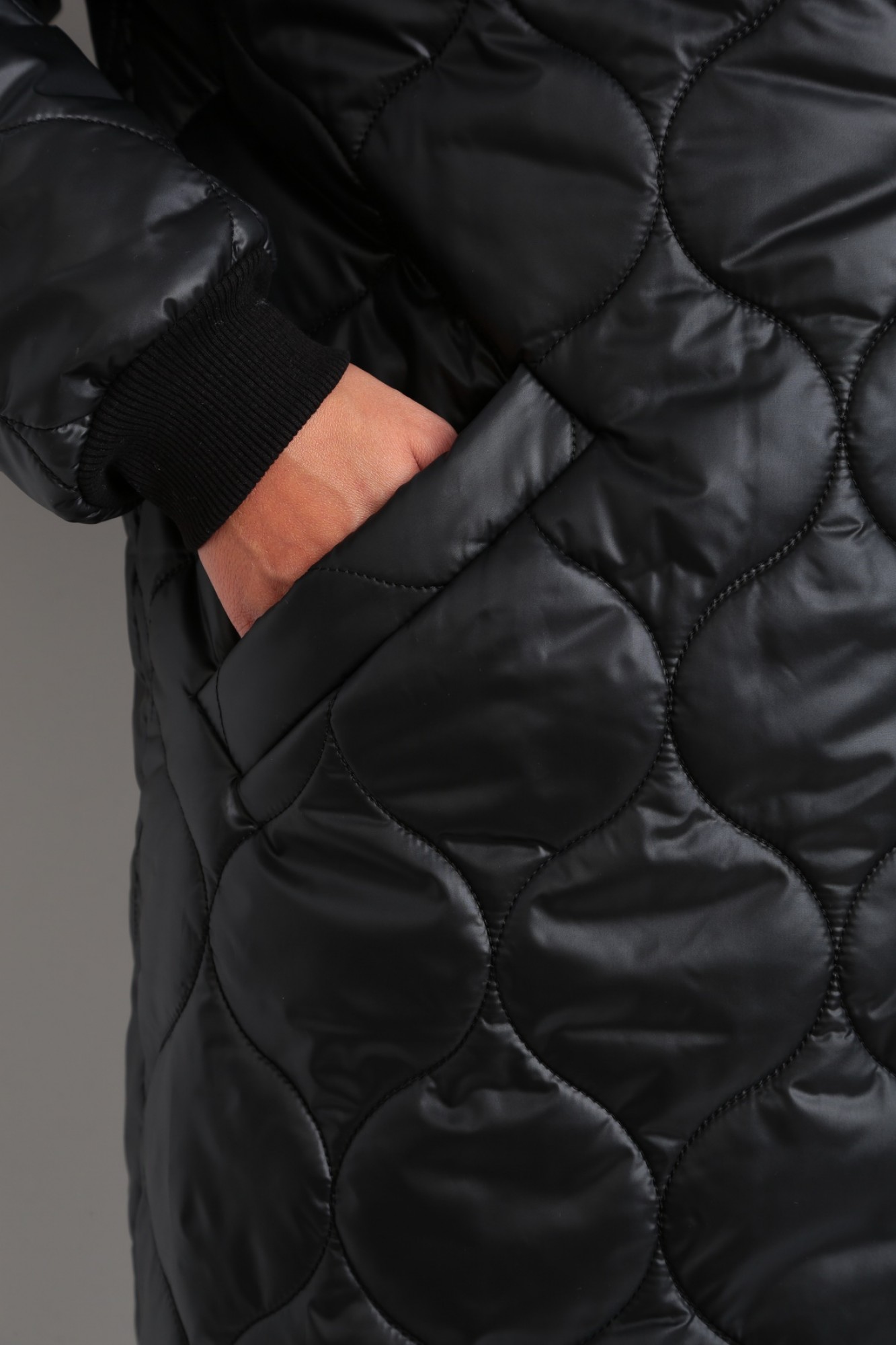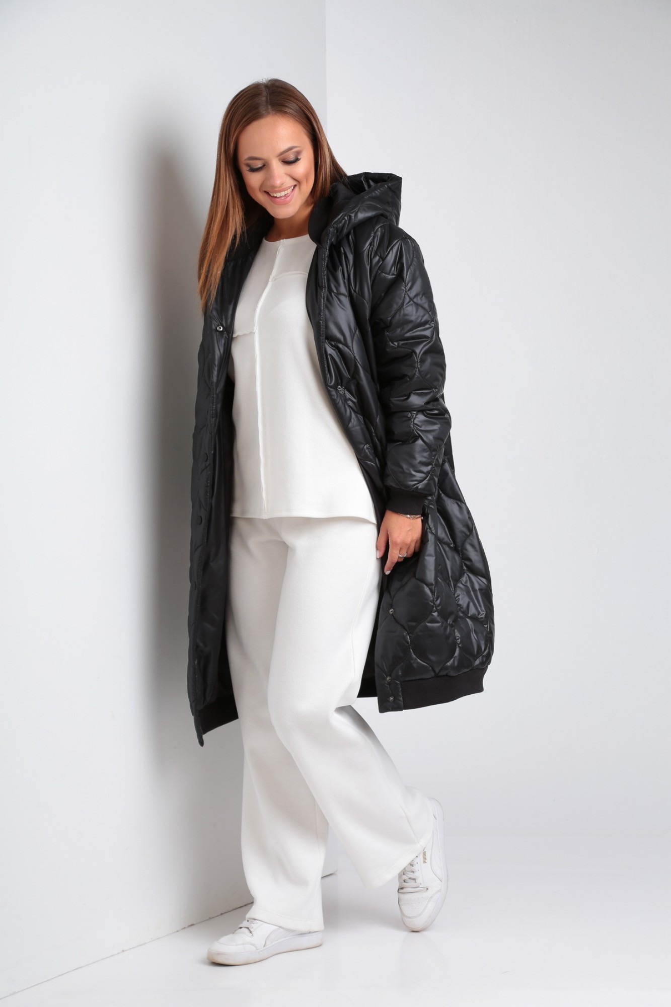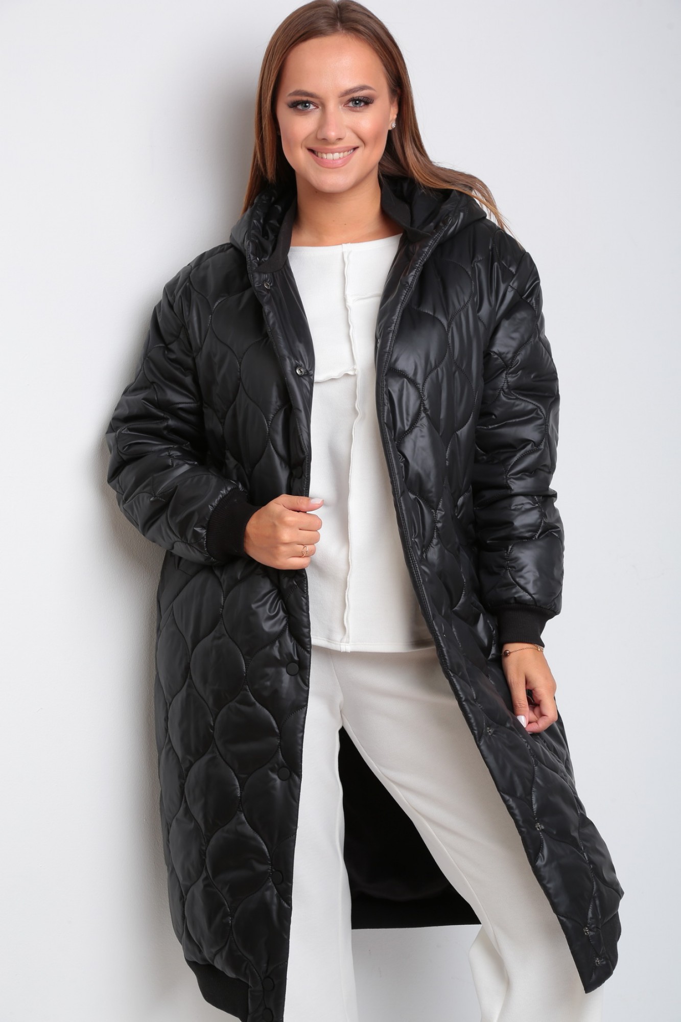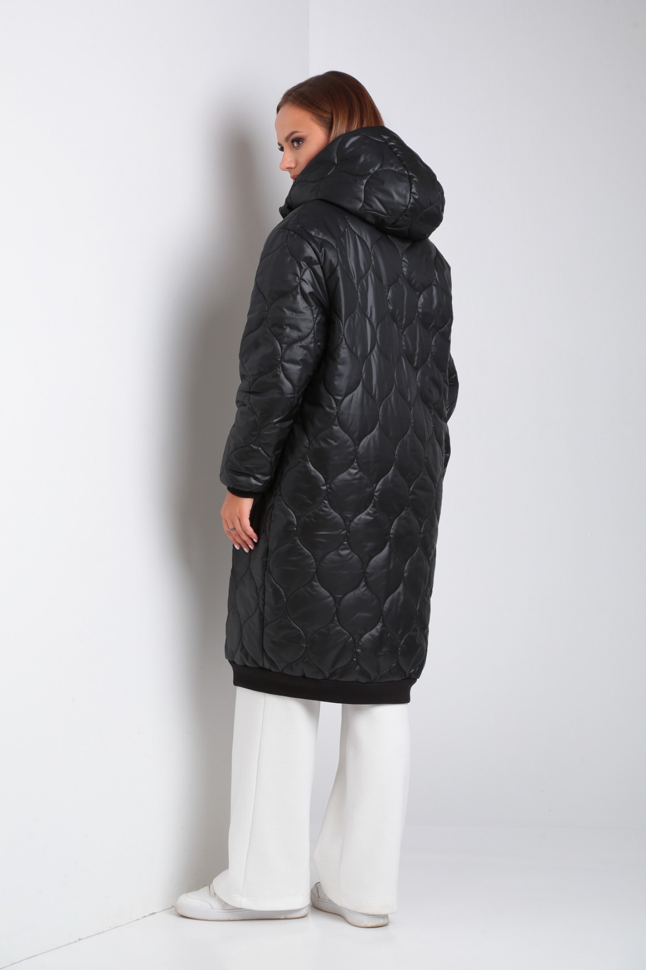 Пальто женское, прямого силуэта с центральной застежкой на кнопки. Линия плеча опущенная, рукав втачной одношовный с притачным манжетам по низу (довяз). Карманы прорезные с втачной листочкой. По низу изделия притачной манжет из отделочной ткани (довяз). Воротник- стойка из отделочной ткани (довяз). Капюшон с центральной частью.