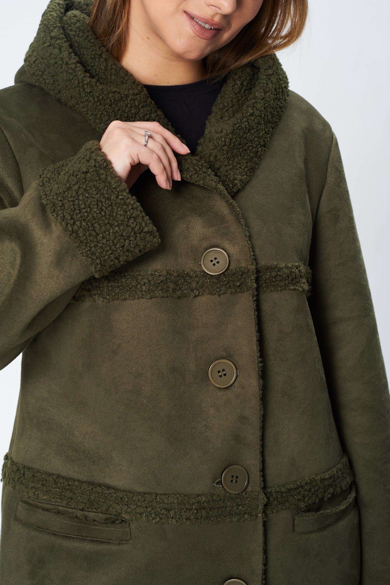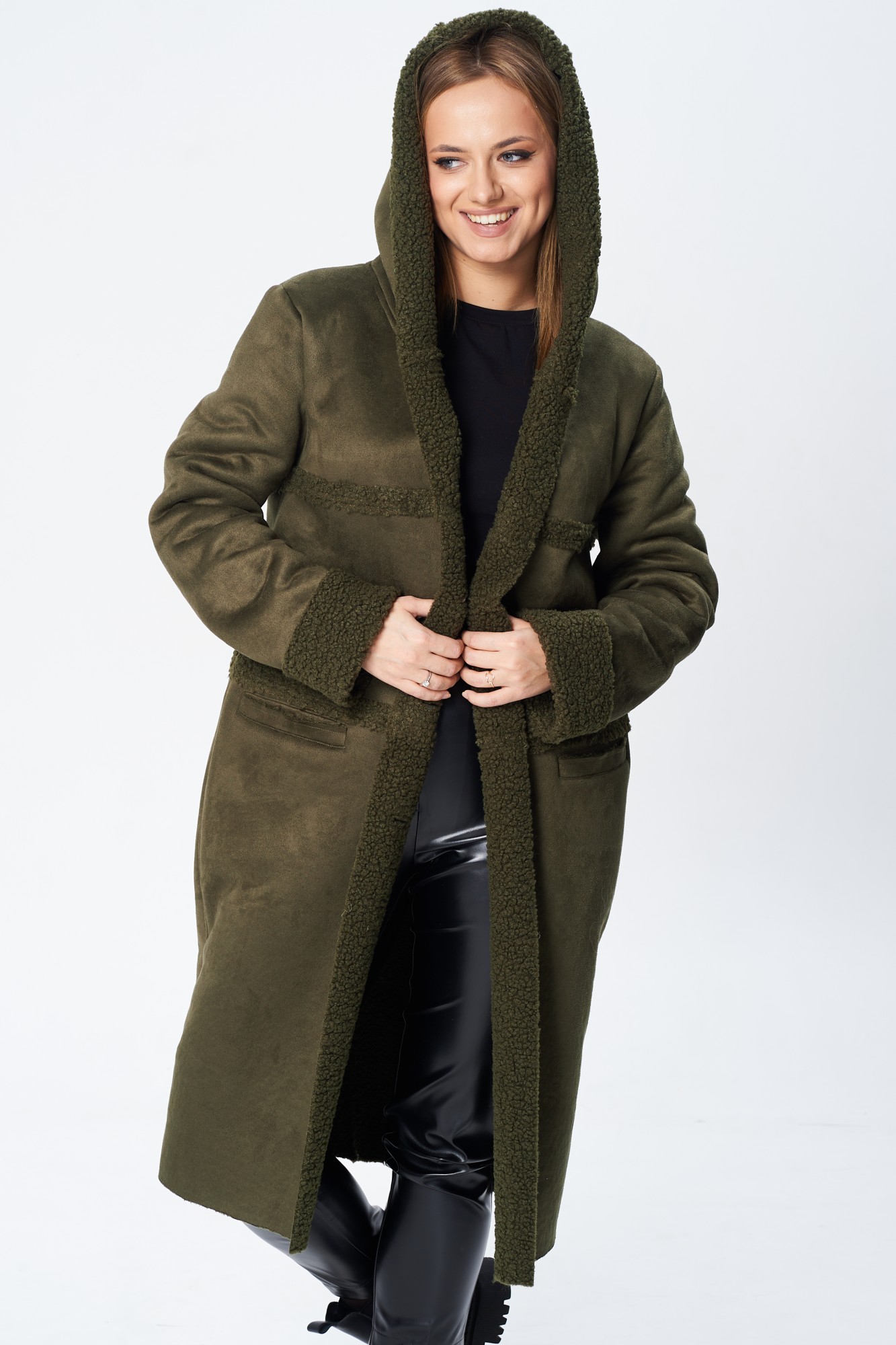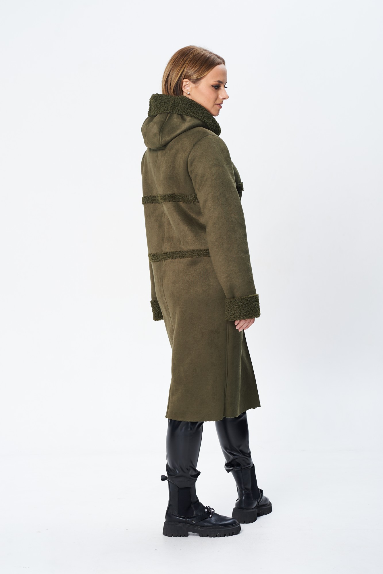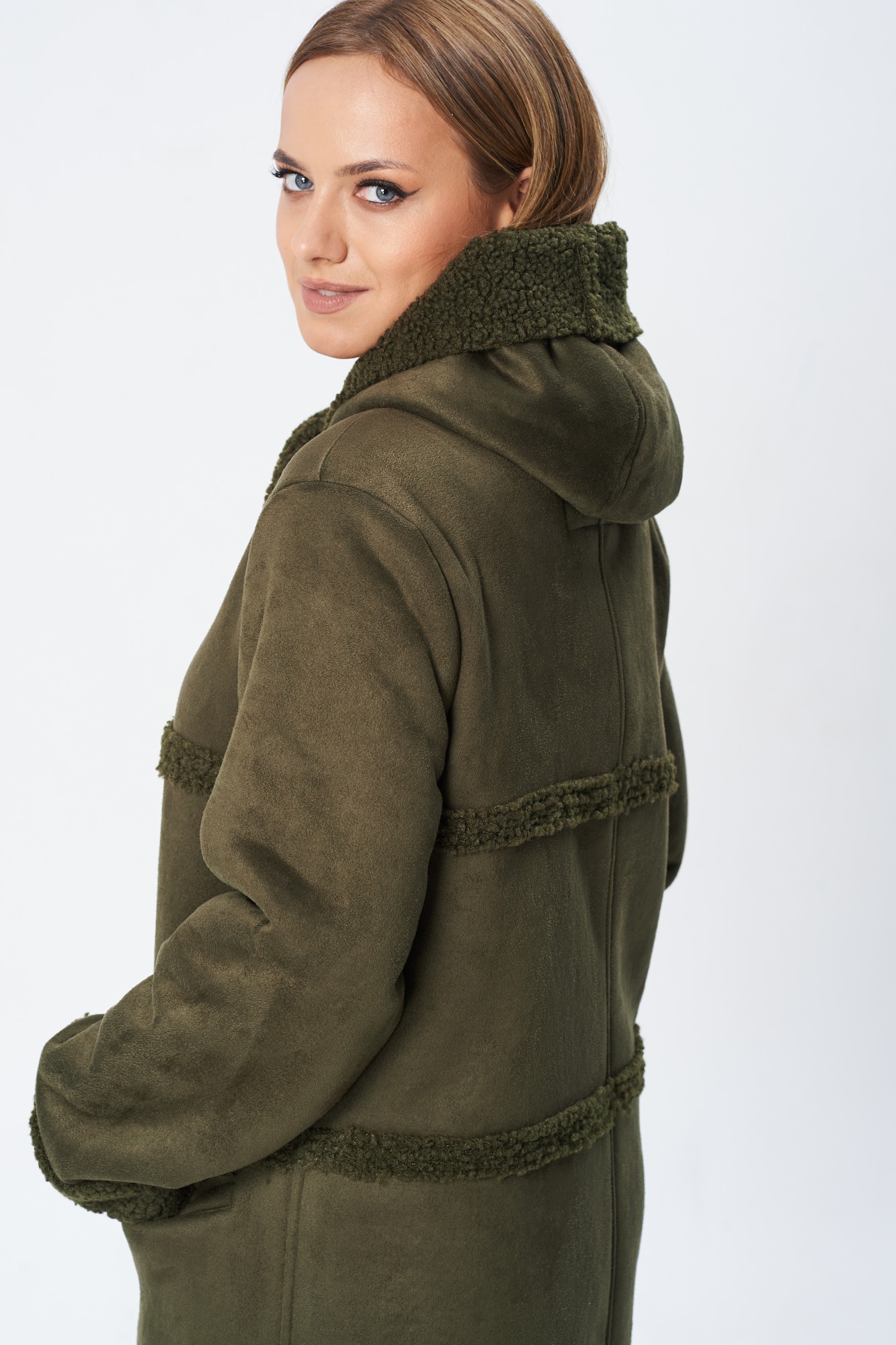 Пальто зимнее, полуприлегающего силуэта с центральной застёжкой на петли-пуговицы, с капюшоном. По полочкам и спинке- горизонтальные рельефы по линии груди и бёдрам. Рукав - втачной одношовный. Материал искусственный дубляж. Температурный режим до -5 градусов.
