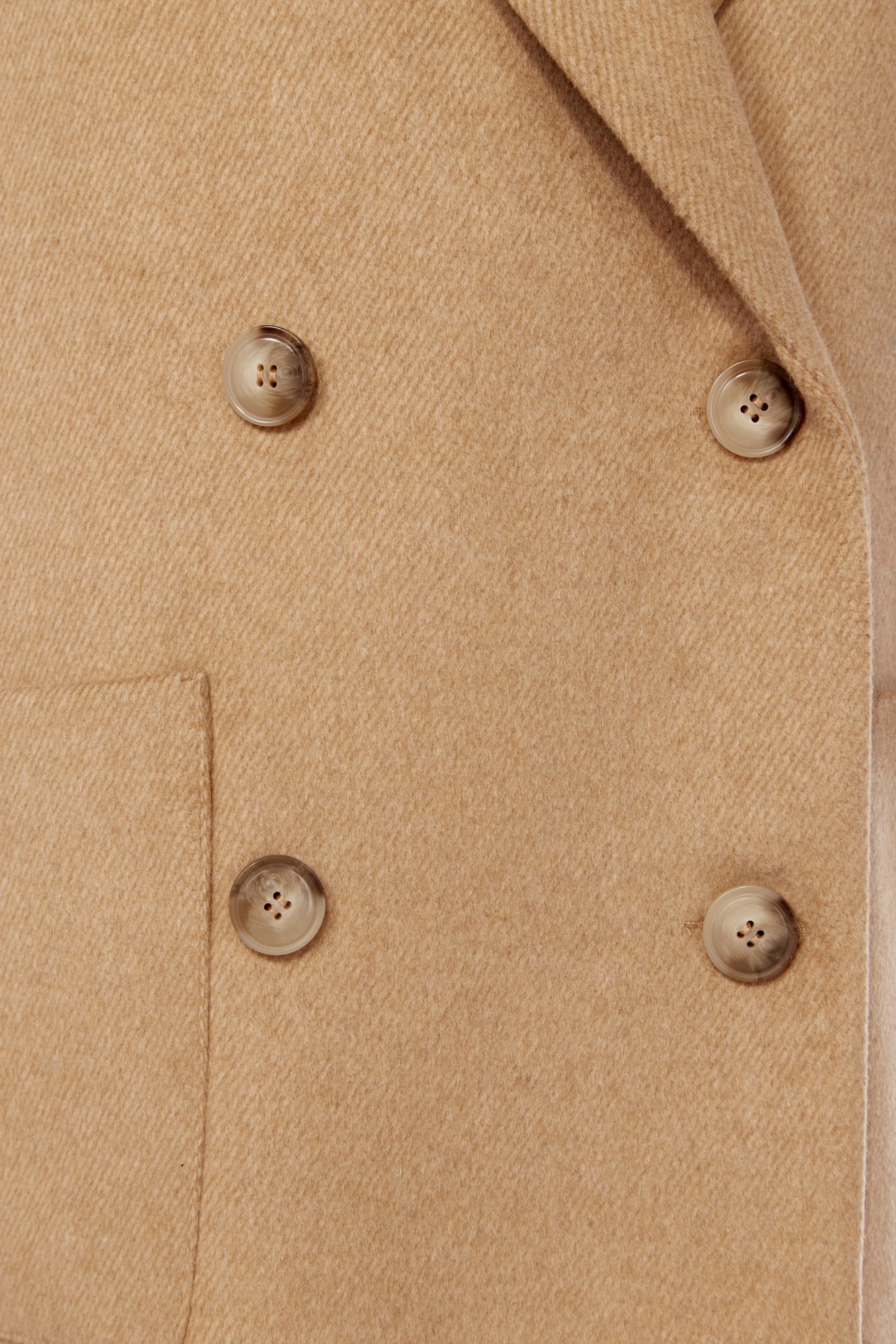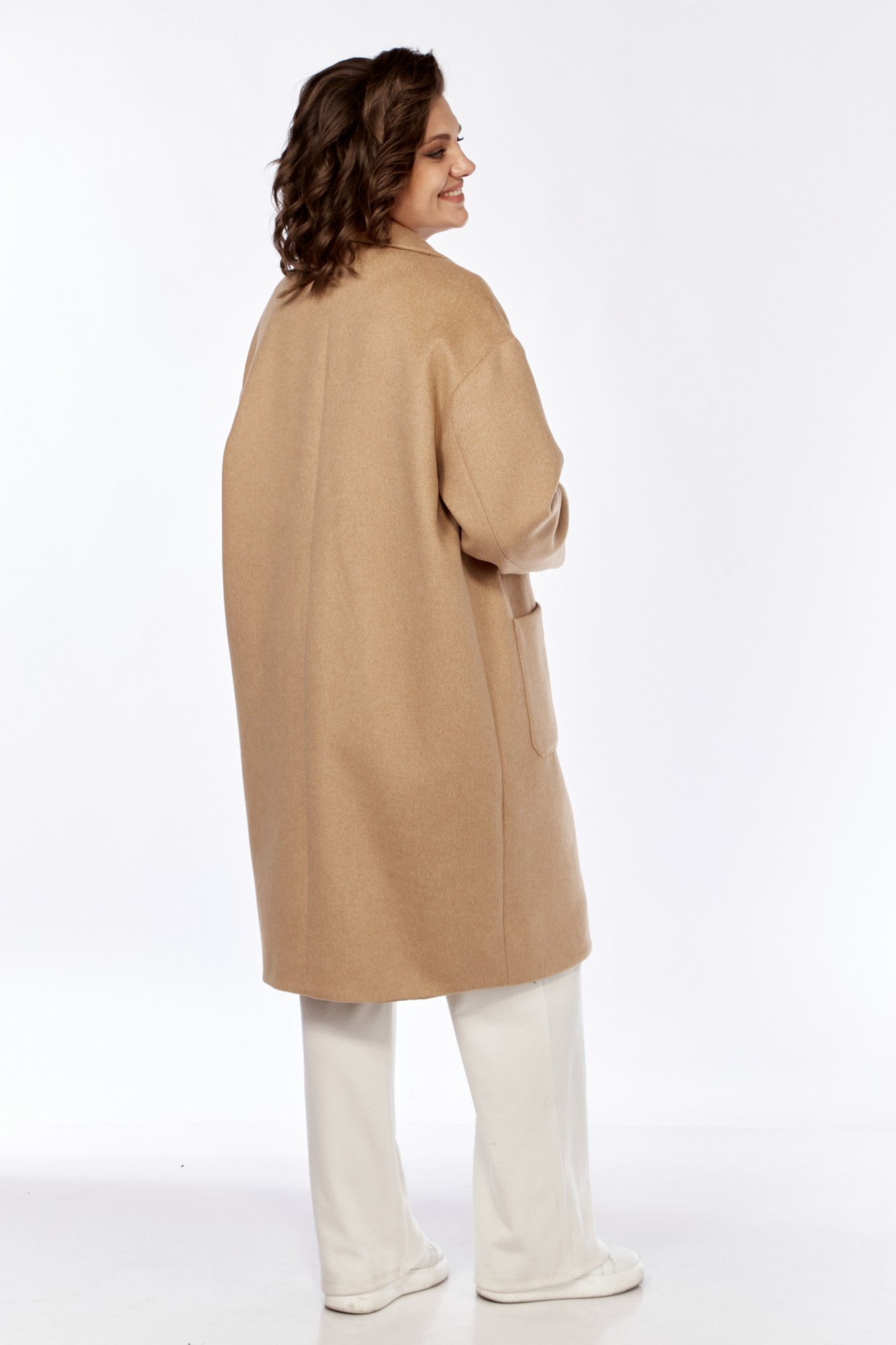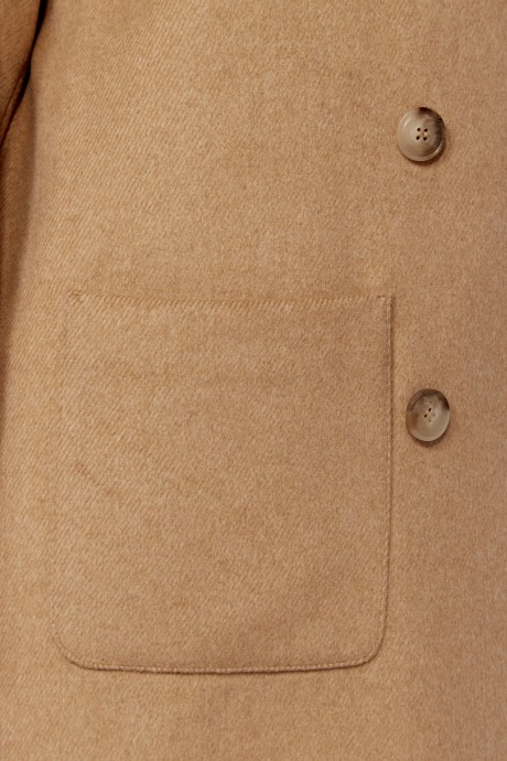Пальто женское, свободного кроя с двубортной застежкой на петли и пуговицы, с открытыми бортами, линия плеча спущена. По спинке средний шов, по переду накладные карманы. Рукав втачной 2-шовный. Воротник стояче-отложной.