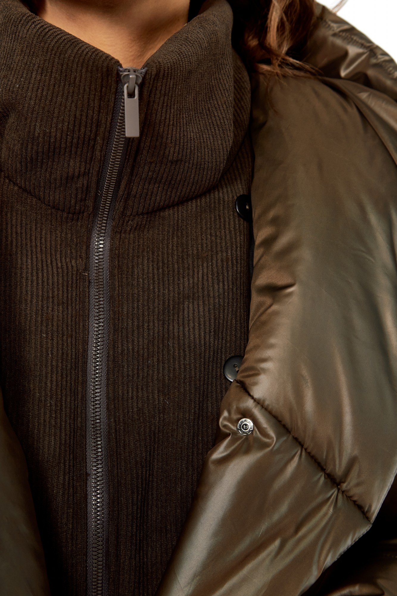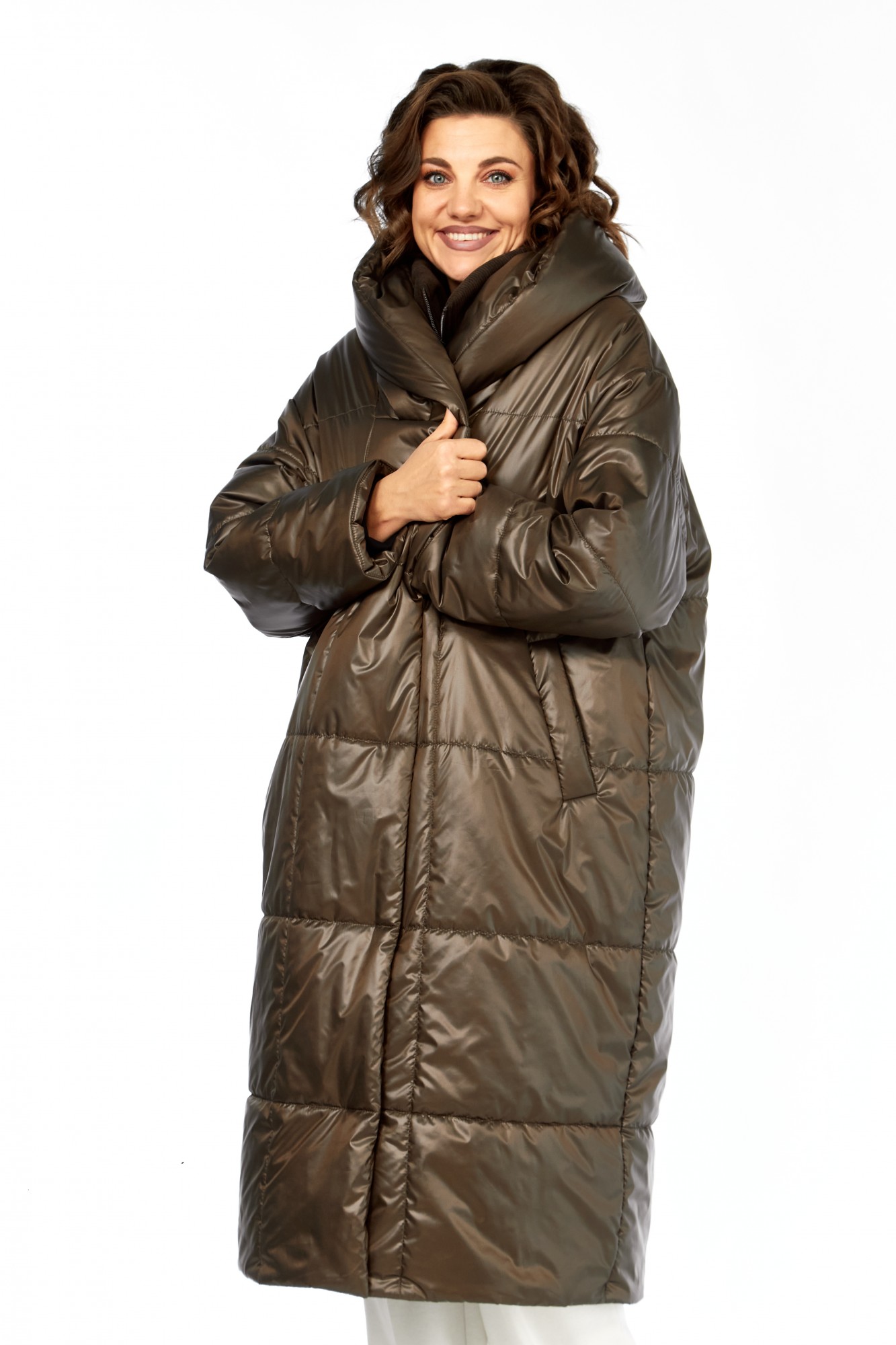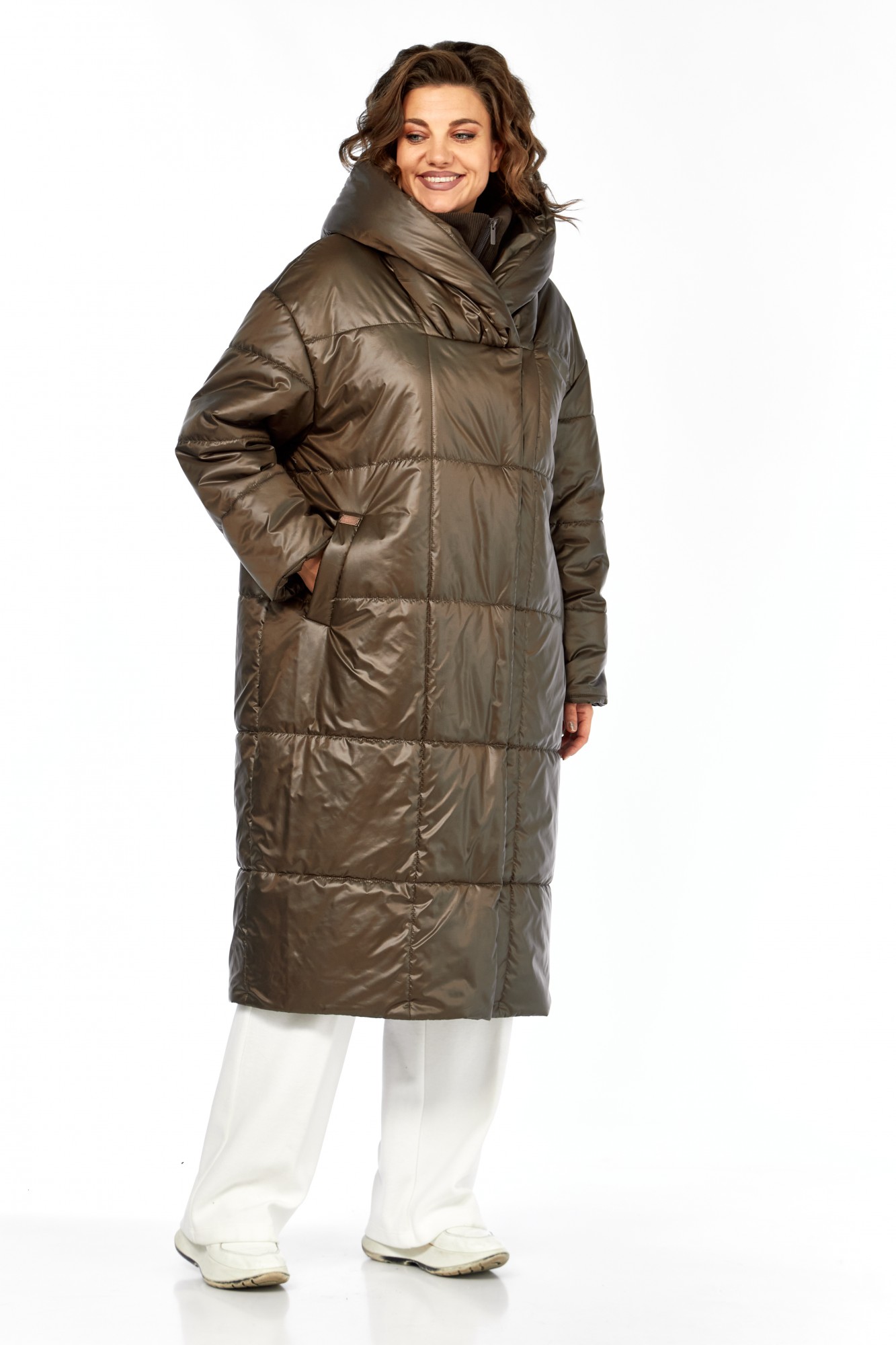 Пальто женскоеполуприлегающего силуэта со смещенной застежкой на кнопки. По переду прорезные карманы с листочкой. Рукав втачной одношовный с притачным манжетом по низу из отделочной ткани (довяз). Капюшон с объемный отделочной деталью по отлету, по горловине переда заложены складки. В качестве отделки используется манишка съемная с застежкой на тесьму-молнию (из отделочной ткани) фиксируется с помощью пуговиц и навесных петель-резинок на изделии. Используется утеплитель синтепон 200. Подходит под температурный режим до -10 градусов.