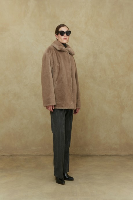 Пальто женское демисезонное, однобортное, прямого силуэта, длиной до середины бедра, Застежка до верху на 5 пришивных кнопок. Перед с функциональными карманами «щель». Рукав длинный, одношовный. Пальто из мехового трикотажного полотна, на подкладке.