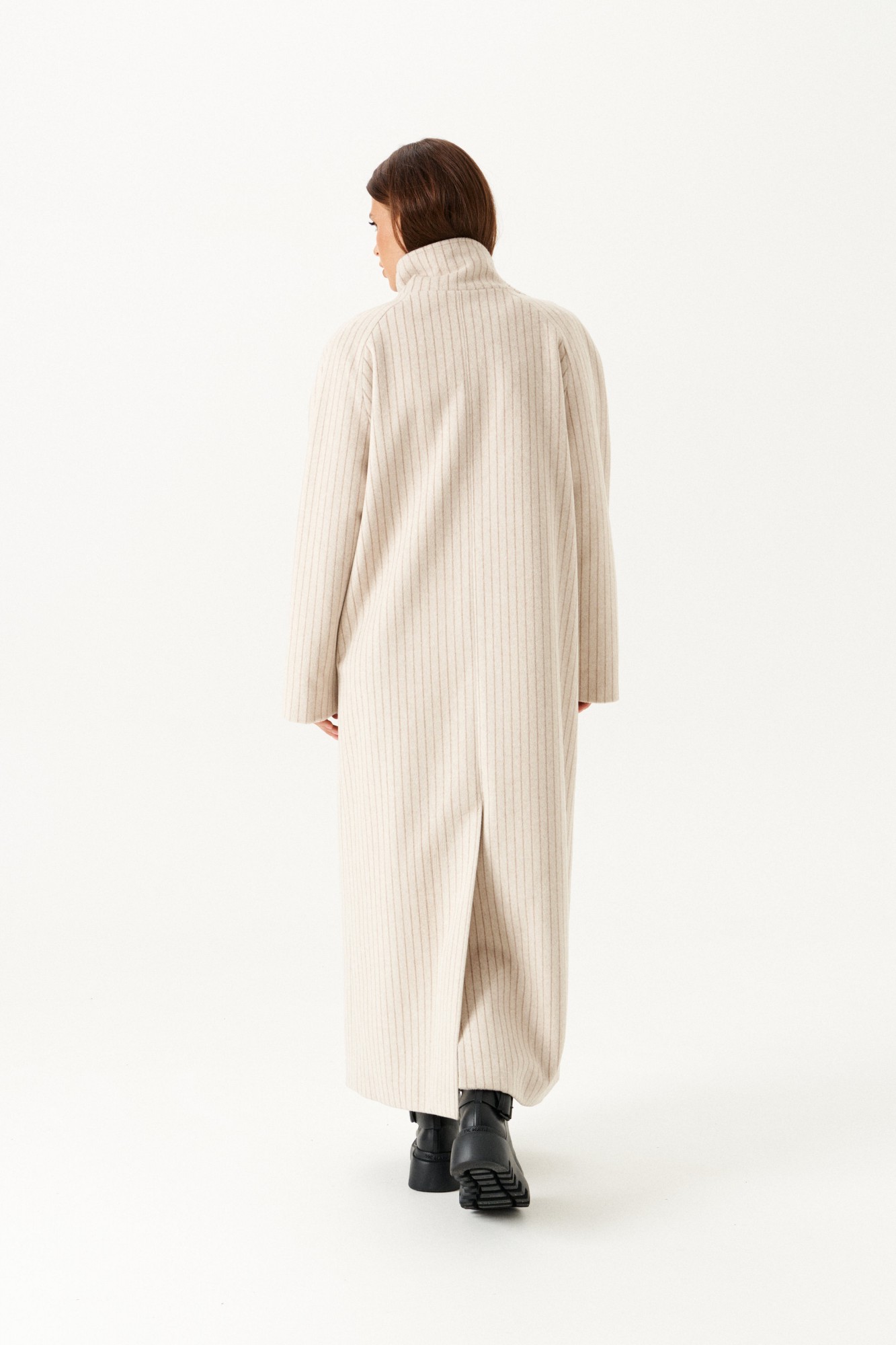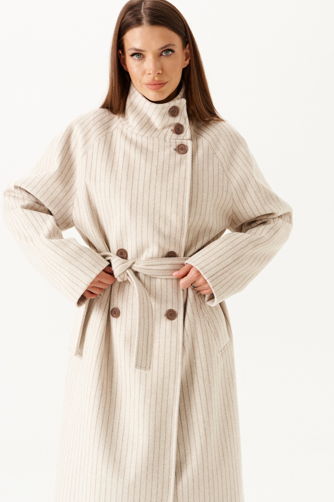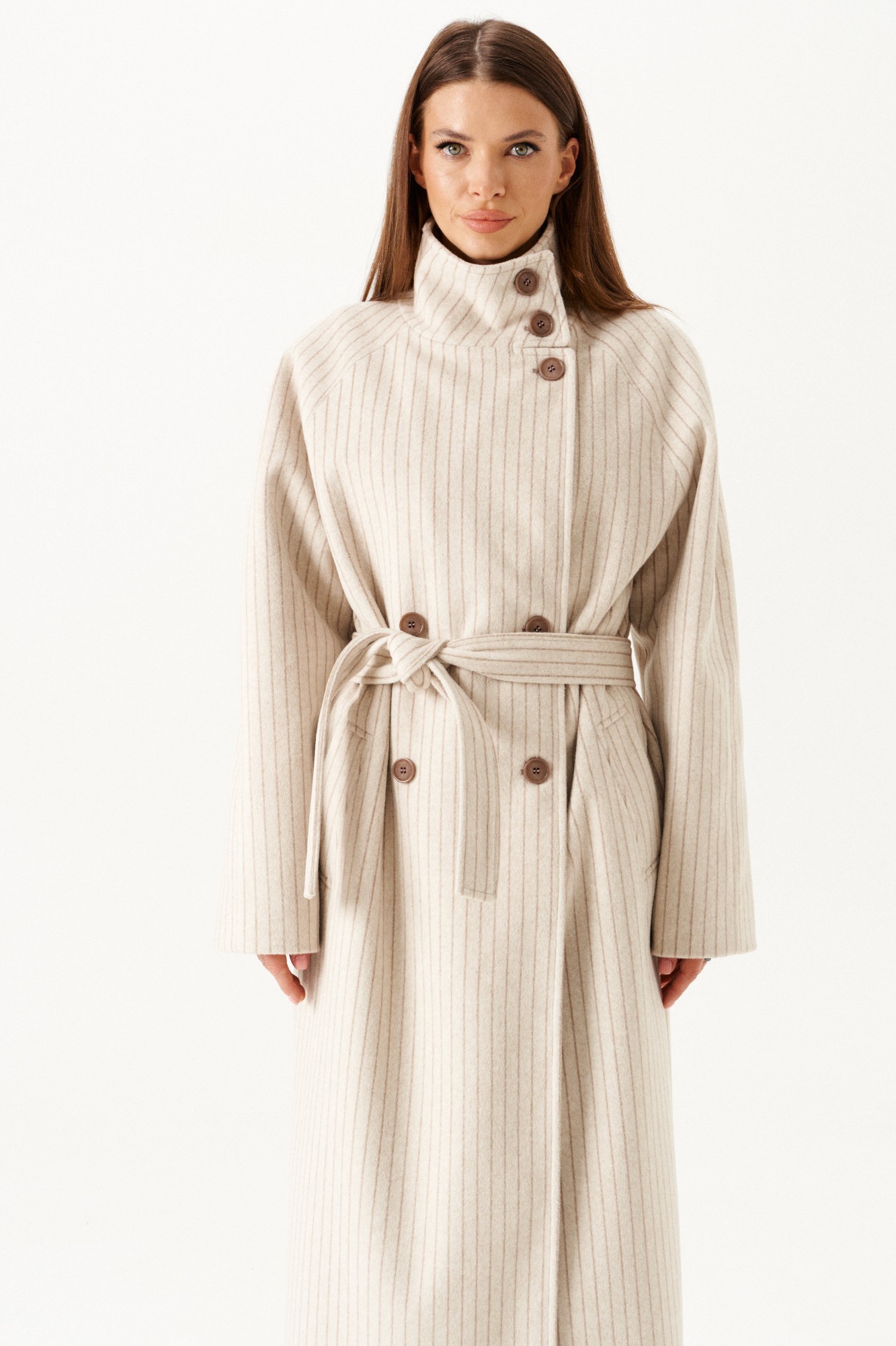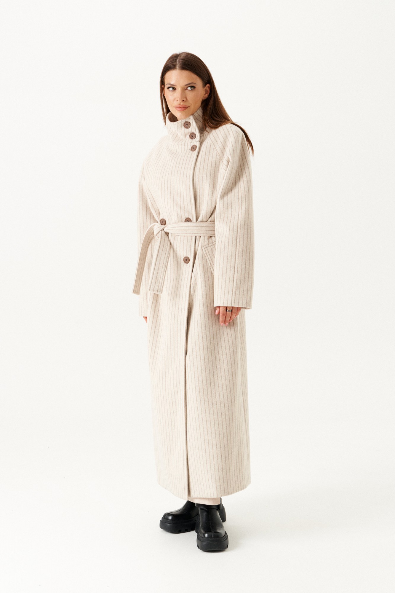 Пальто из трикотажного полотна прямого силуэта, с центральной двубортной застежкой на петли и пуговицы, на подкладке. Воротник – стойка с застежкой на петли и пуговицы. Полочки с прорезными карманами с листочкой. Спинка со средним швом и шпицей. Рукав – реглан. В комплекте пояс из основной ткани.