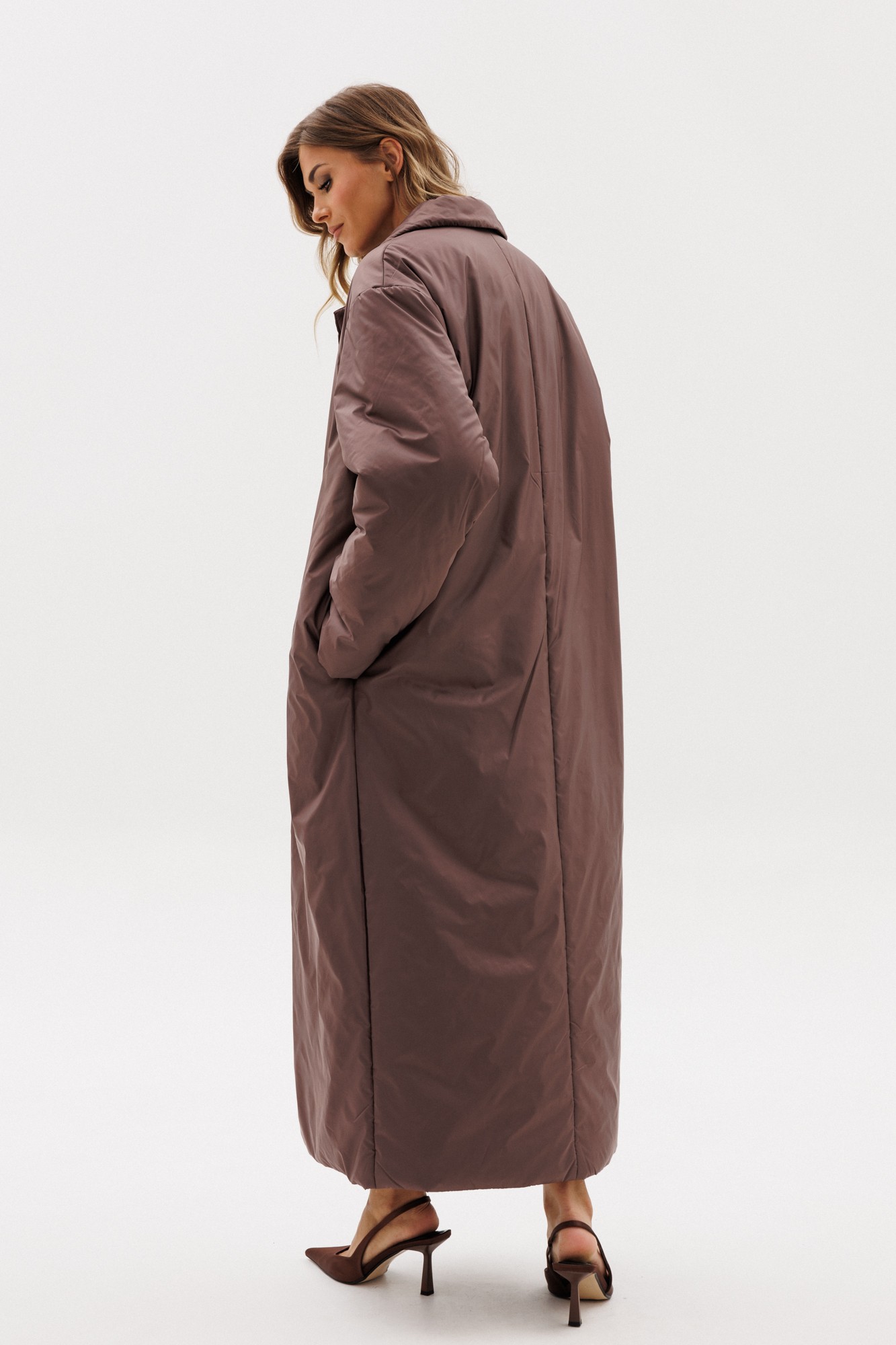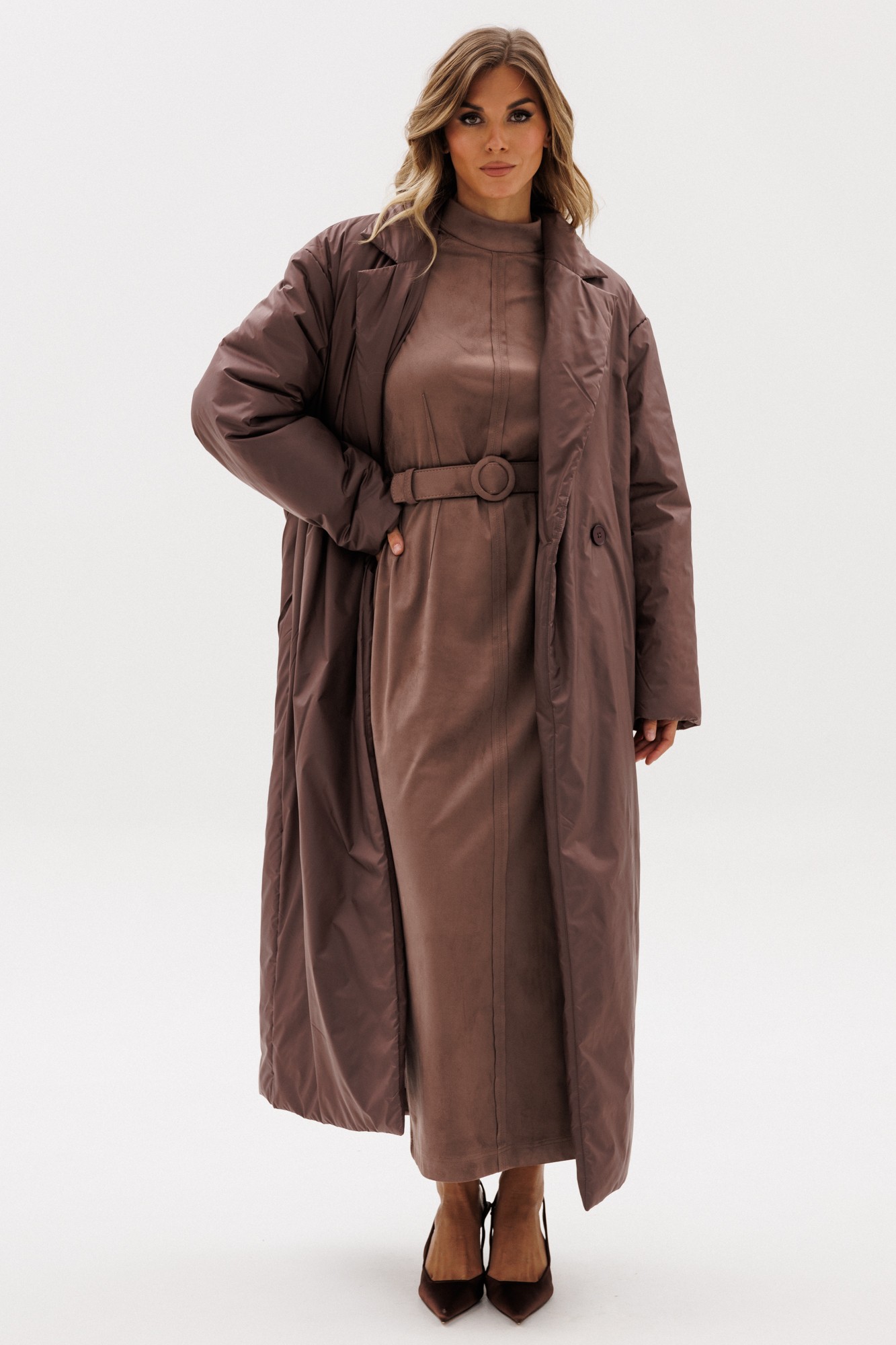 Пальто выполнено из плащевой ткани с утеплителем Isosoft. Пальто прямого силуэта, длиной до линии щиколотки. Спереди двубортная застежка на один ряд пуговиц и прорезные карманы в швах. Спинка со средним швом. Плечевой шов спущен. Воротник пиджачного типа. Рукав рубашечного покроя, двухшовный. Пальто на притачной по низу подкладке. Температурный режим: от 0 до -10 С.