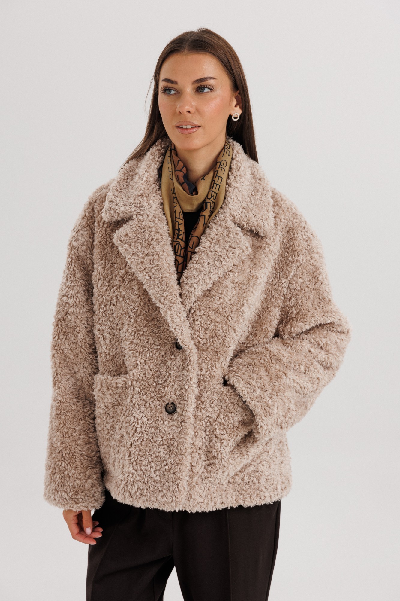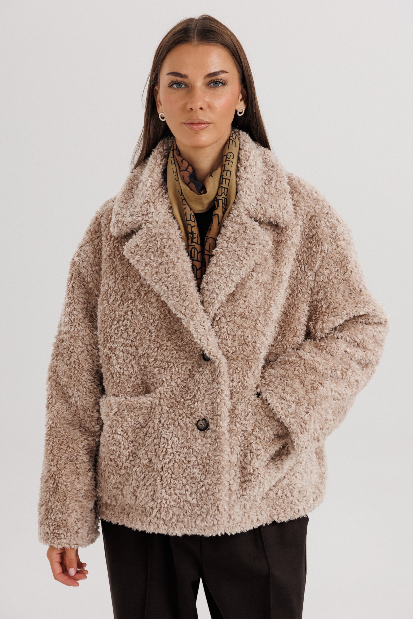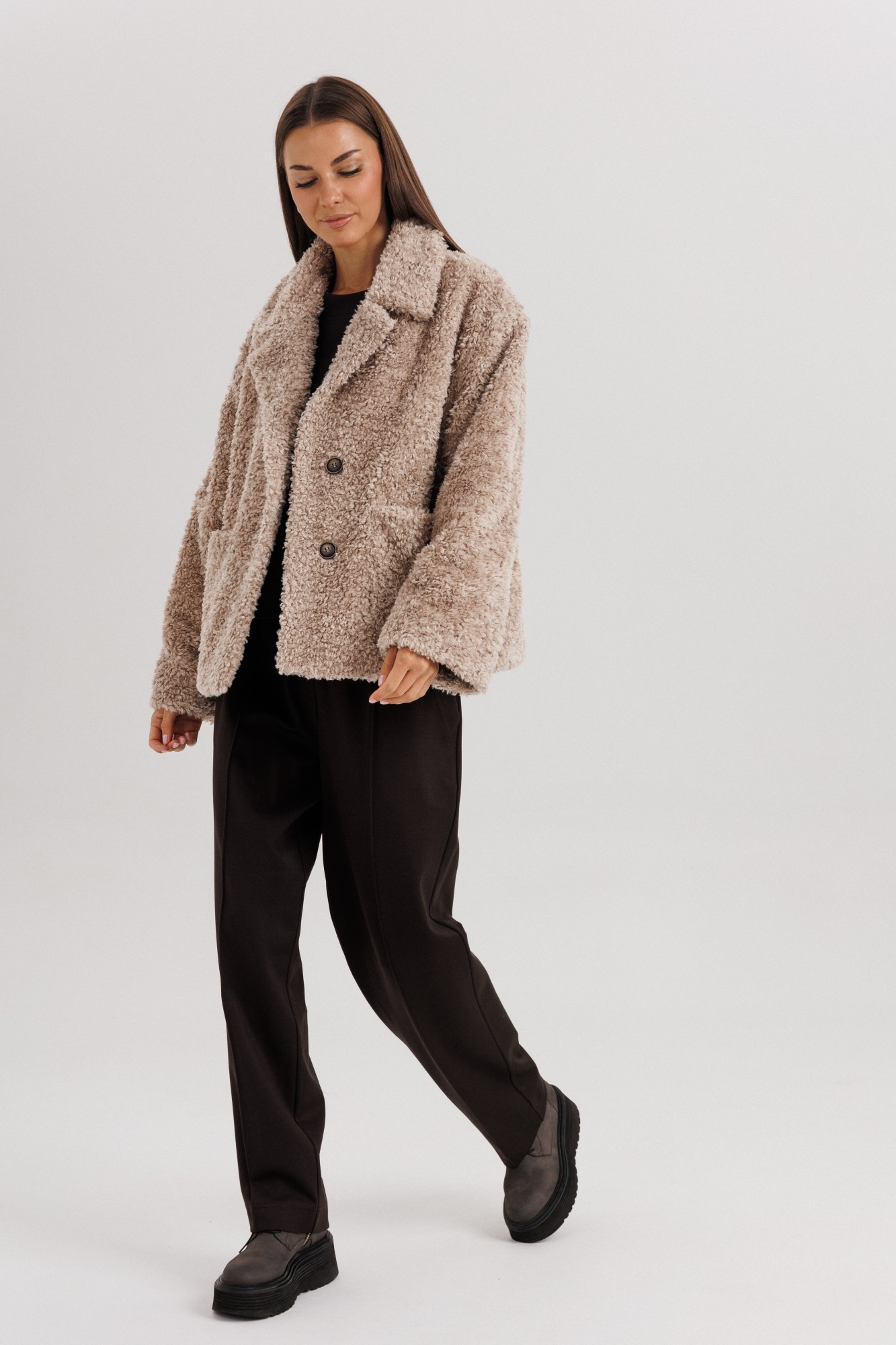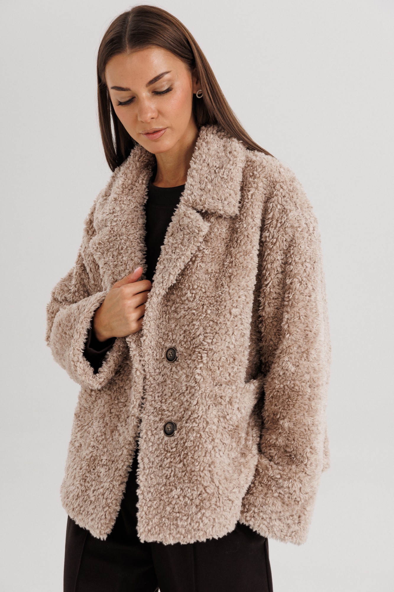 Женское укороченное пальто из искусственного меха — современное и уютное решение для холодного сезона. Мягкий фактурный мех дарит комфорт и тепло, а укороченный силуэт подчёркивает лёгкость и актуальность образа. Модель выполнена с однобортной застёжкой на пуговицы, широким отложным воротником и удобными накладными карманами. Универсальный бежевый оттенок легко сочетается с различными элементами гардероба: будь то классические брюки, джинсы или романтичные платья. Такое пальто станет стильным акцентом в повседневных и вечерних образах, позволяя выглядеть модно и чувствовать себя максимально комфортно.